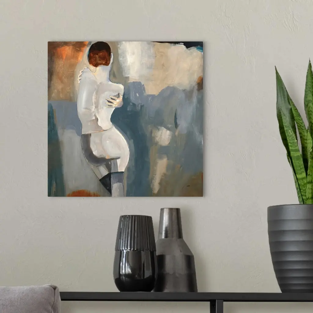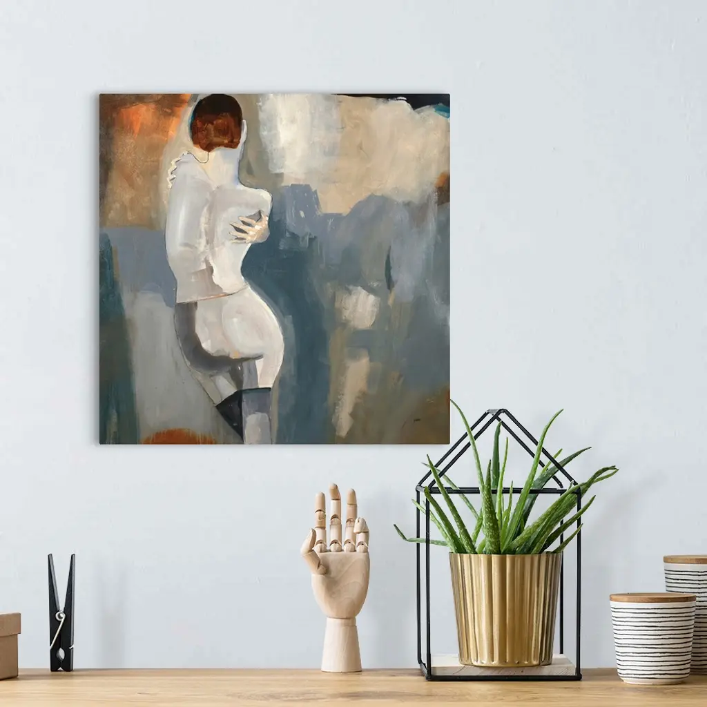 Contemporary artwork of a woman wrapping her arms around herself with a background made with blue, gray, orange, and beige colors on a square canvas.