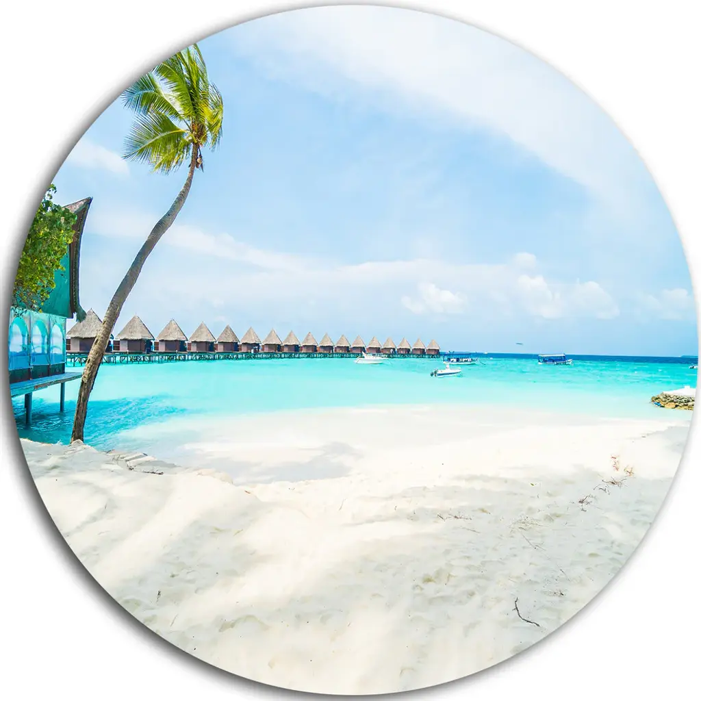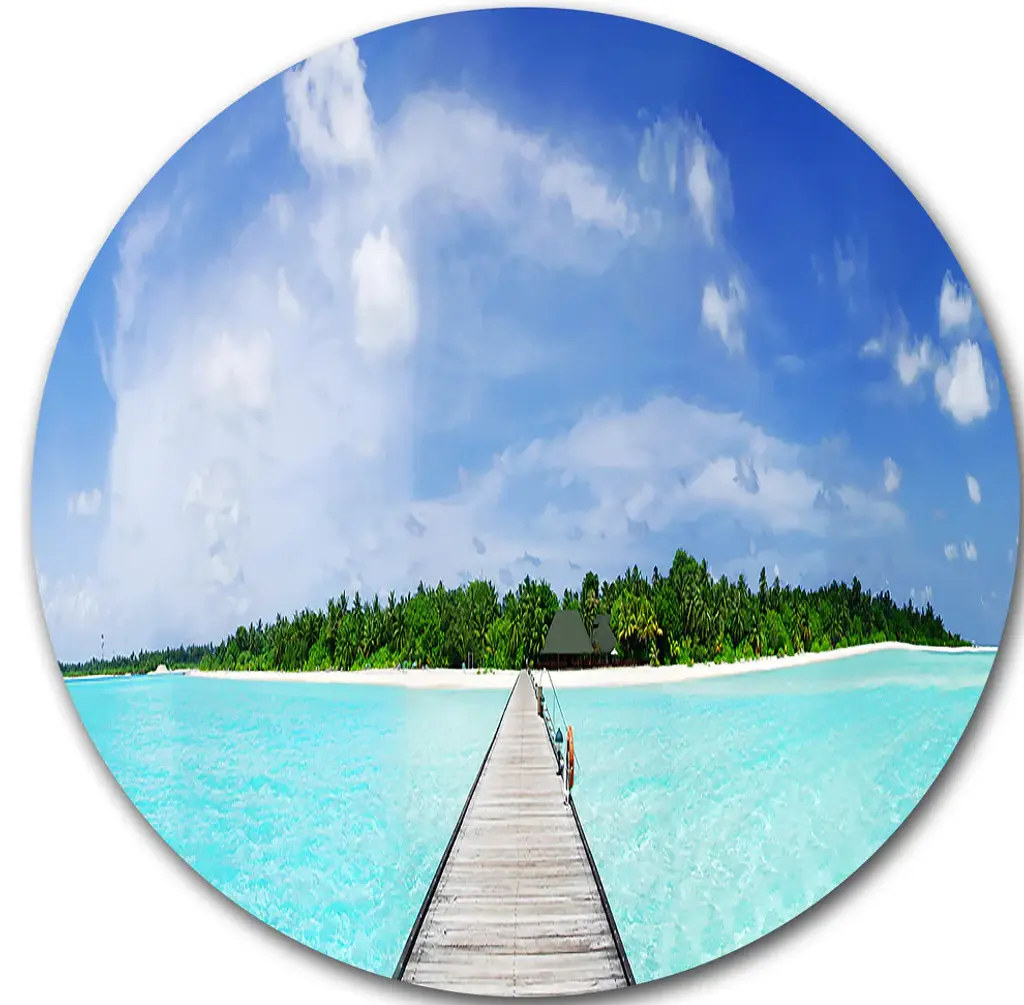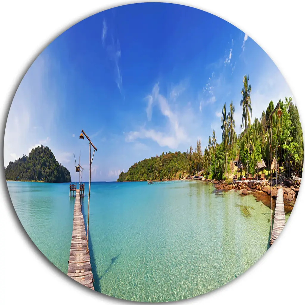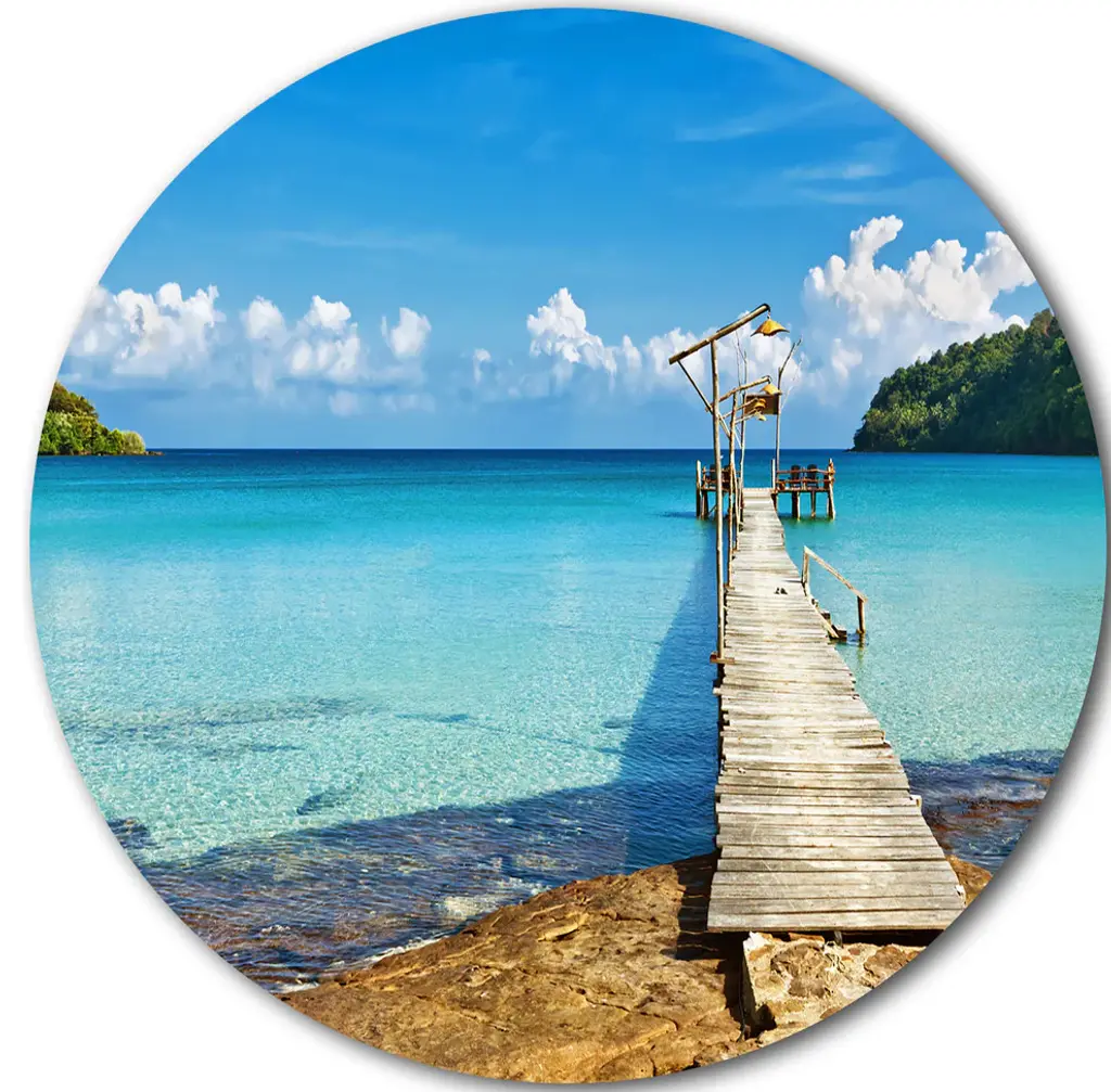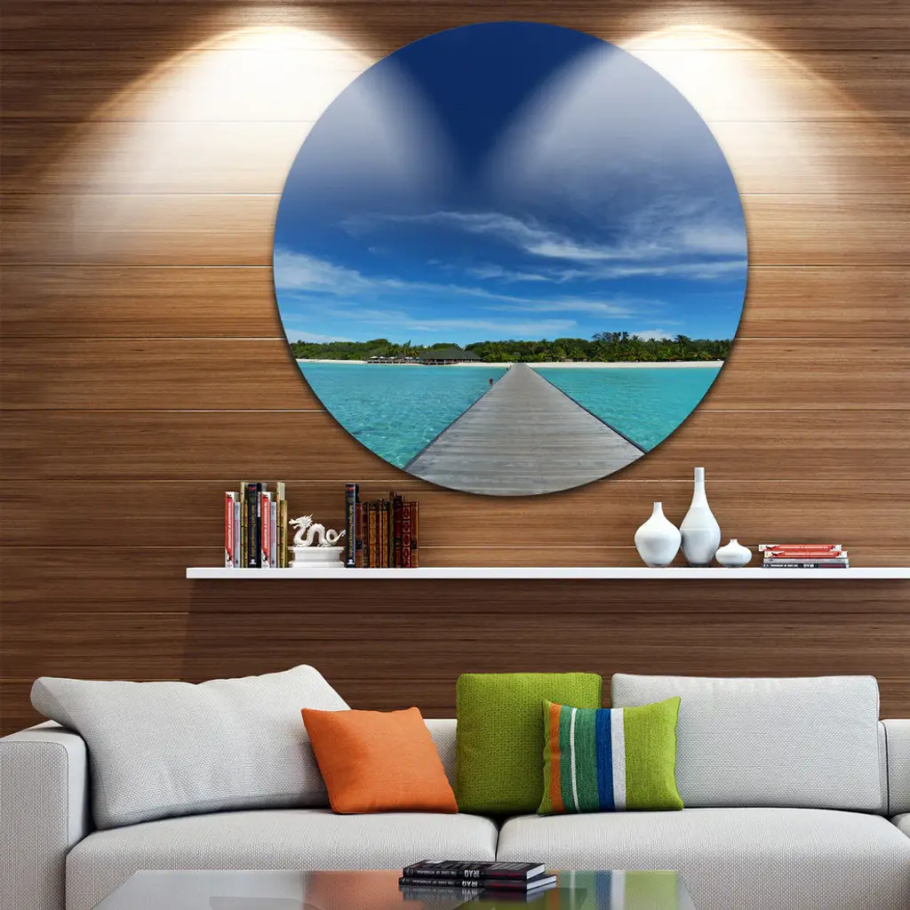 Bring Contemporary Abstraction to your home with this large Circle Metal wall art. This Infinite Sea Pier Metal Artwork makes it the focal point of any room or office. - White Gloss Coating ensures colors are extra vibrant with light reflection.- Aluminum grade Sheet Metal with 1 inch mounting frame on the back giving the illusion that the artwork is floating on the wall..- Mounting Brackets are included along with instructions.- High Quality Digital images are created directly into a glossy aluminum panel producing a stunning and captivating print into the glossy finish of the metal.- Water, Fire and Scratch resistant HD Aluminum panels.- Looks better than any photo paper and guaranteed to last at least 20 years- Easy to clean with a microfiber cloth. Colors are far superior to regular Canvas Art. - Easy to Hang