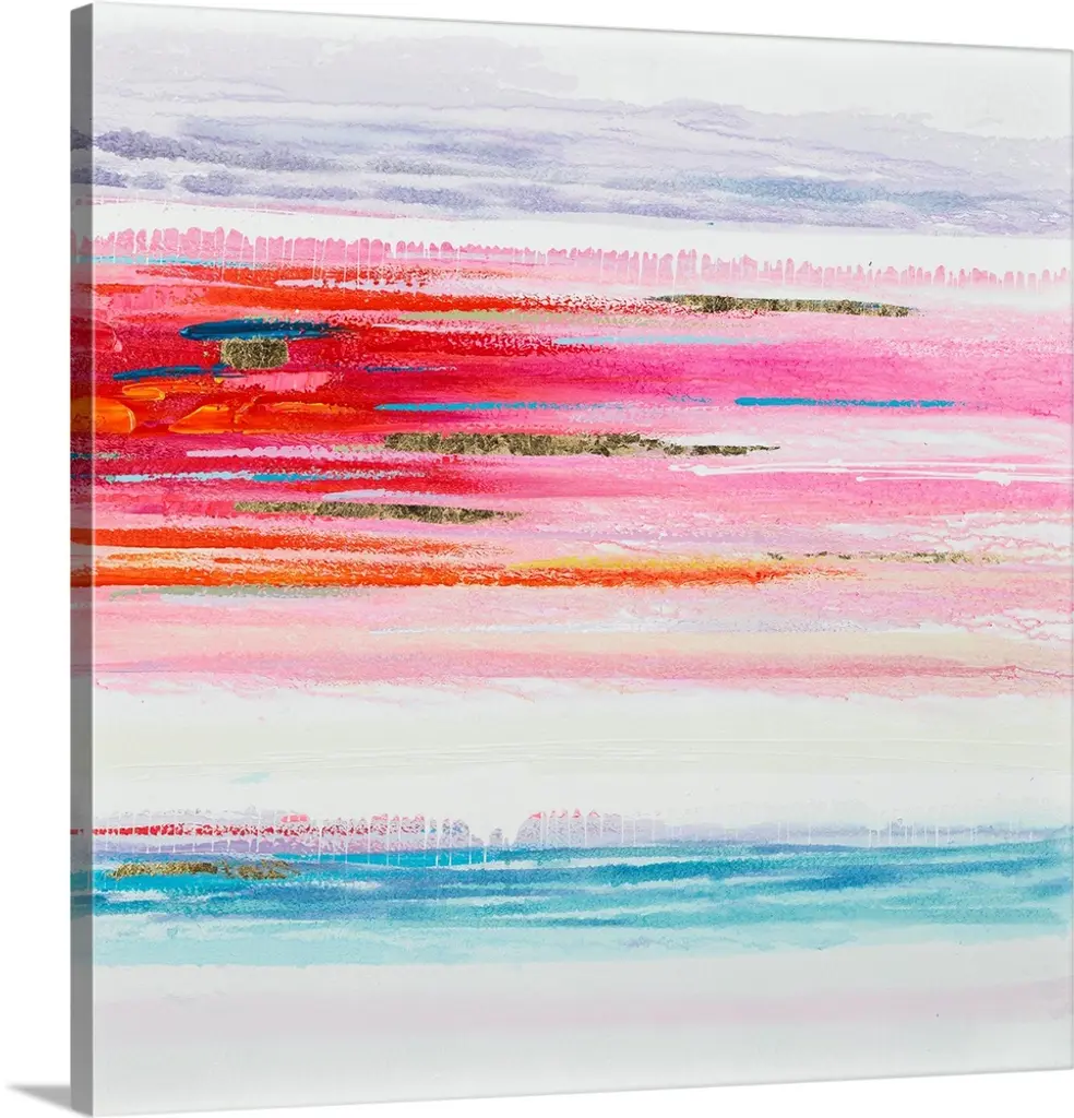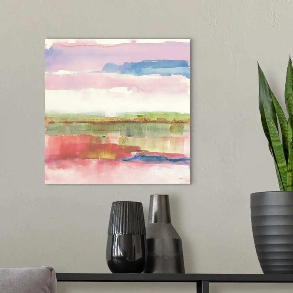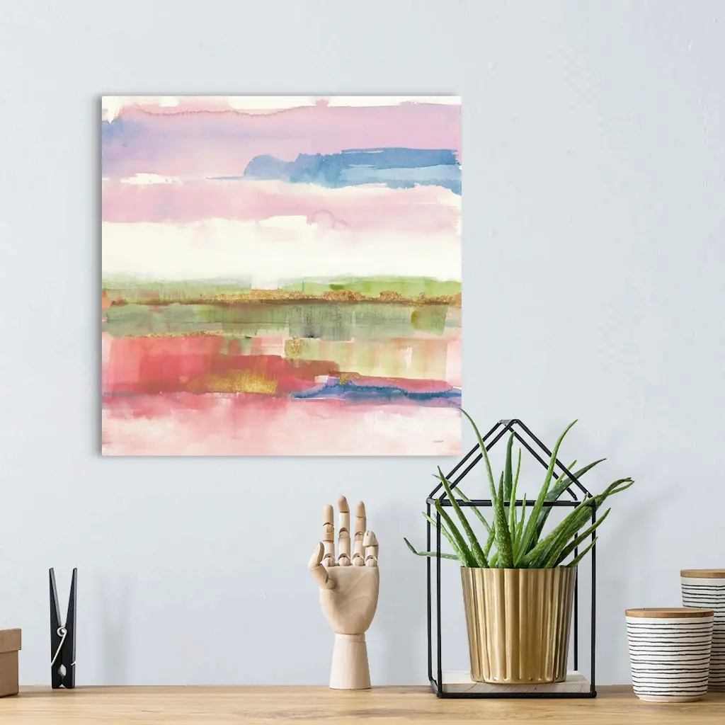 Abstract watercolor painting with pink, purple, blue, green, and gold hues on a white square background.