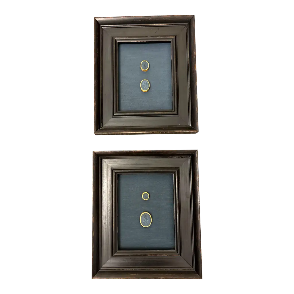 Hand cast plaster pieces are set on a rich brown painted fabric with a thick ivory mat. The beautiful gold mirrored frame sparkles in this exceptional collection.