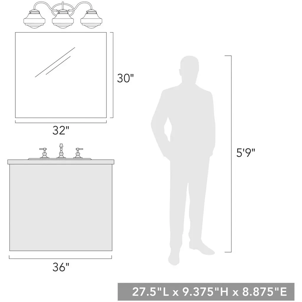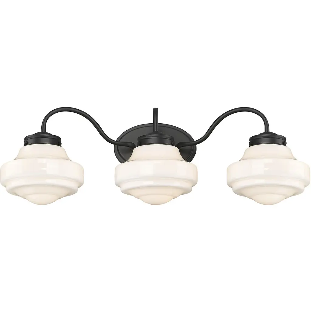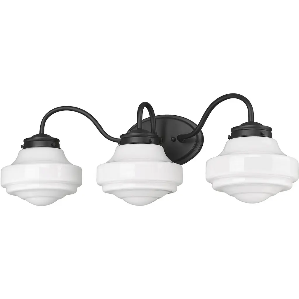Illuminate your space with vintage charm Bring Traditional elegance into your home with the Golden Lighting Ingalls 3-light Vanity in Matte Black. Featuring a glass shade and a Matte Black frame, it creates a welcoming atmosphere. The Vintage Milk Glass shade provides a smooth surface with a glossy sheen, allowing for a soft and glare-free glow that is warm and inviting. The Matte Black finish is perfectly smooth, absorbing light and offering an understated elegance that complements various decor styles from minimalist to bold. Damp Location Rated, this vanity light is perfect for bathrooms, covered porches, and laundry rooms where occasional moisture may arise. Overall Dimensions: 27.5"W x 9.38"H x 8.88"D, Requires 3 E26 Medium base bulbs (not included) with a maximum wattage of 100 per bulb. Elevate your bathroom decor with quality craftsmanship and a timeless design.