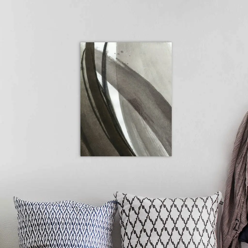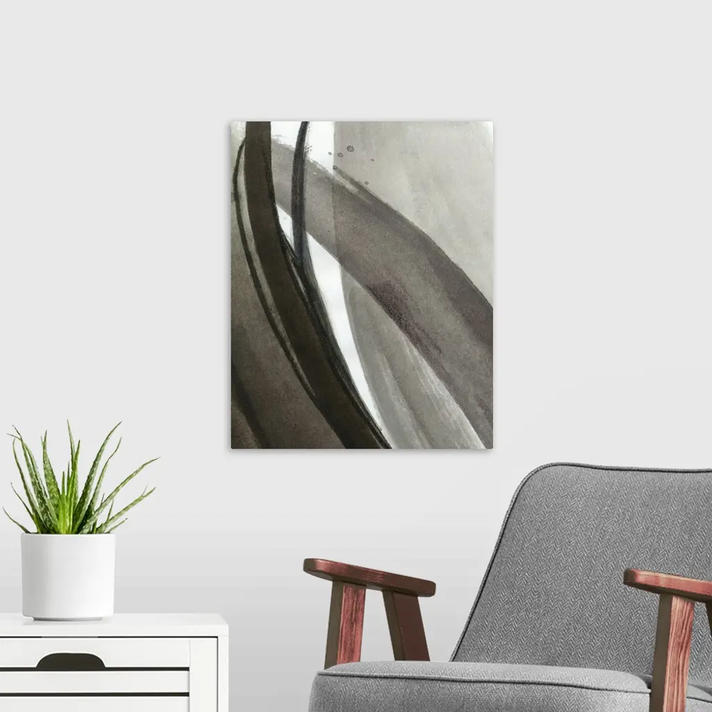 Portrait artwork on a large wall hanging of thick, circular, sweeping strokes of ink and several small splatters.
