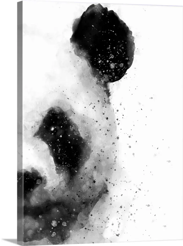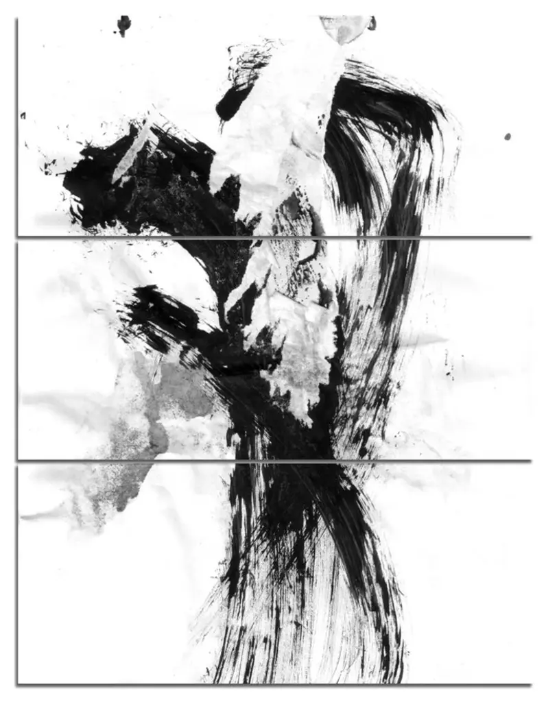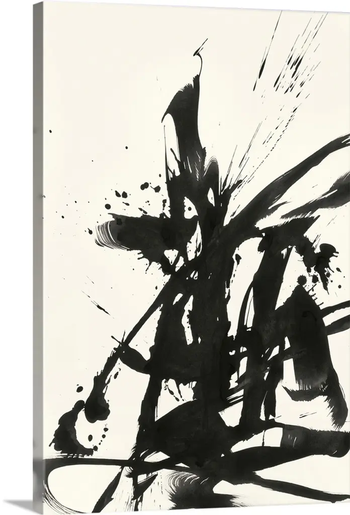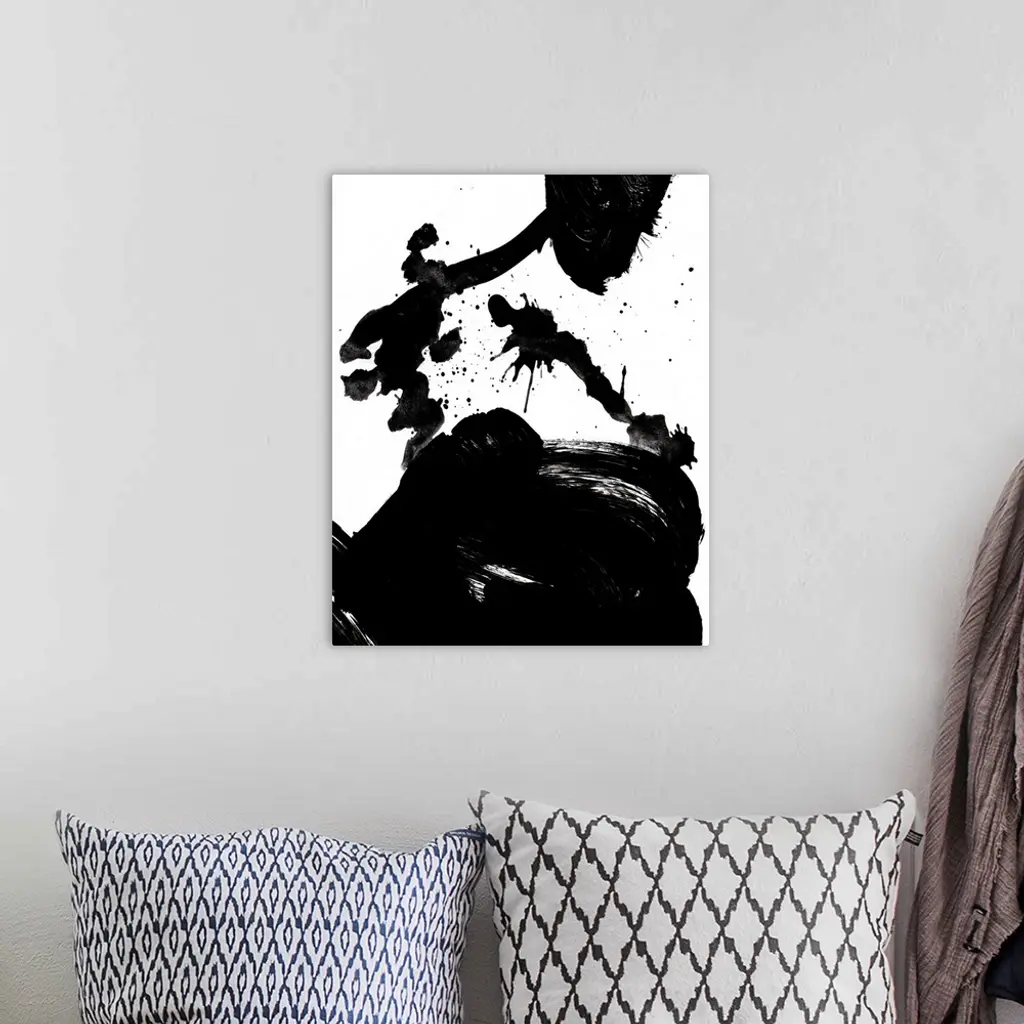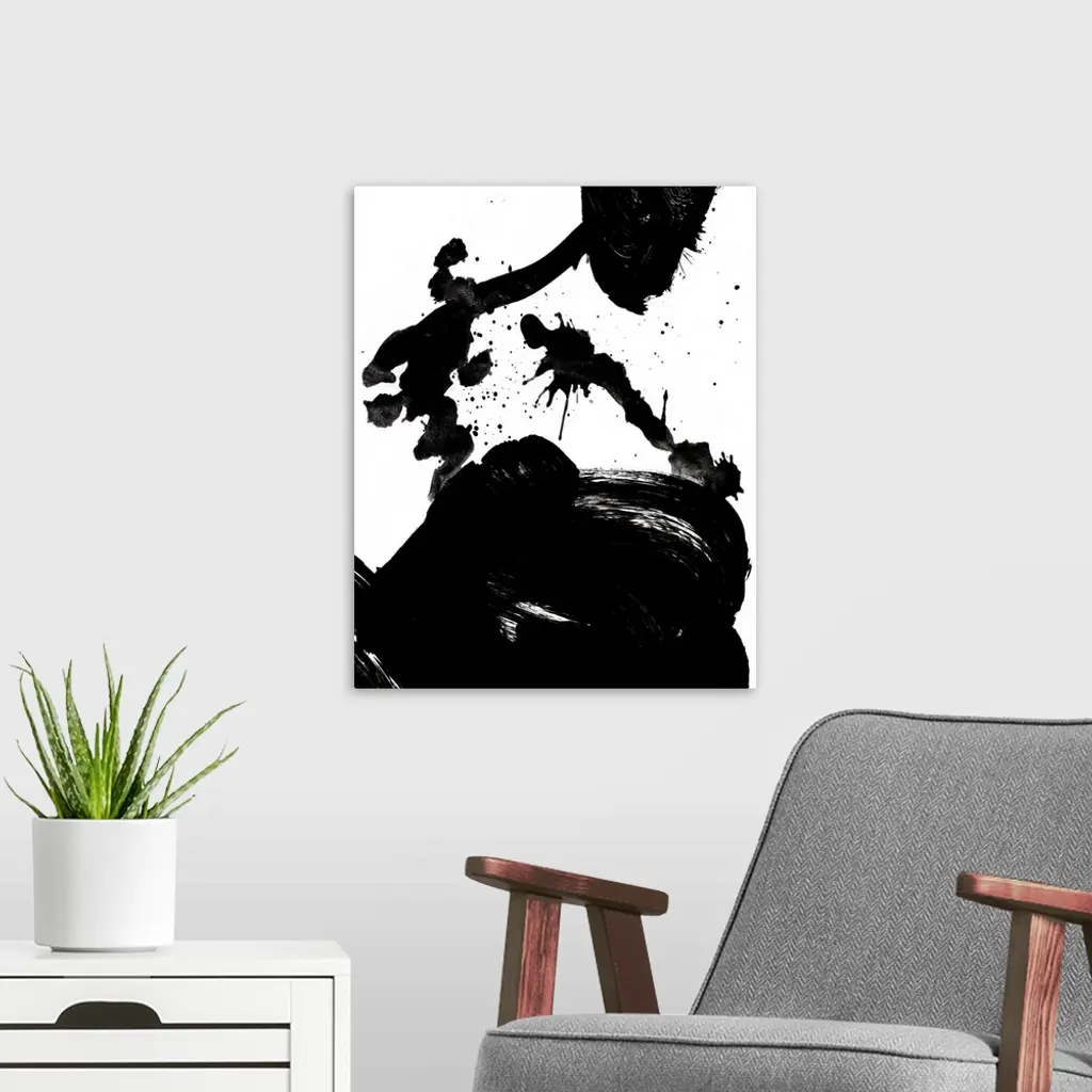 Contemporary abstract home decor artwork using black paint splashes against a white background.