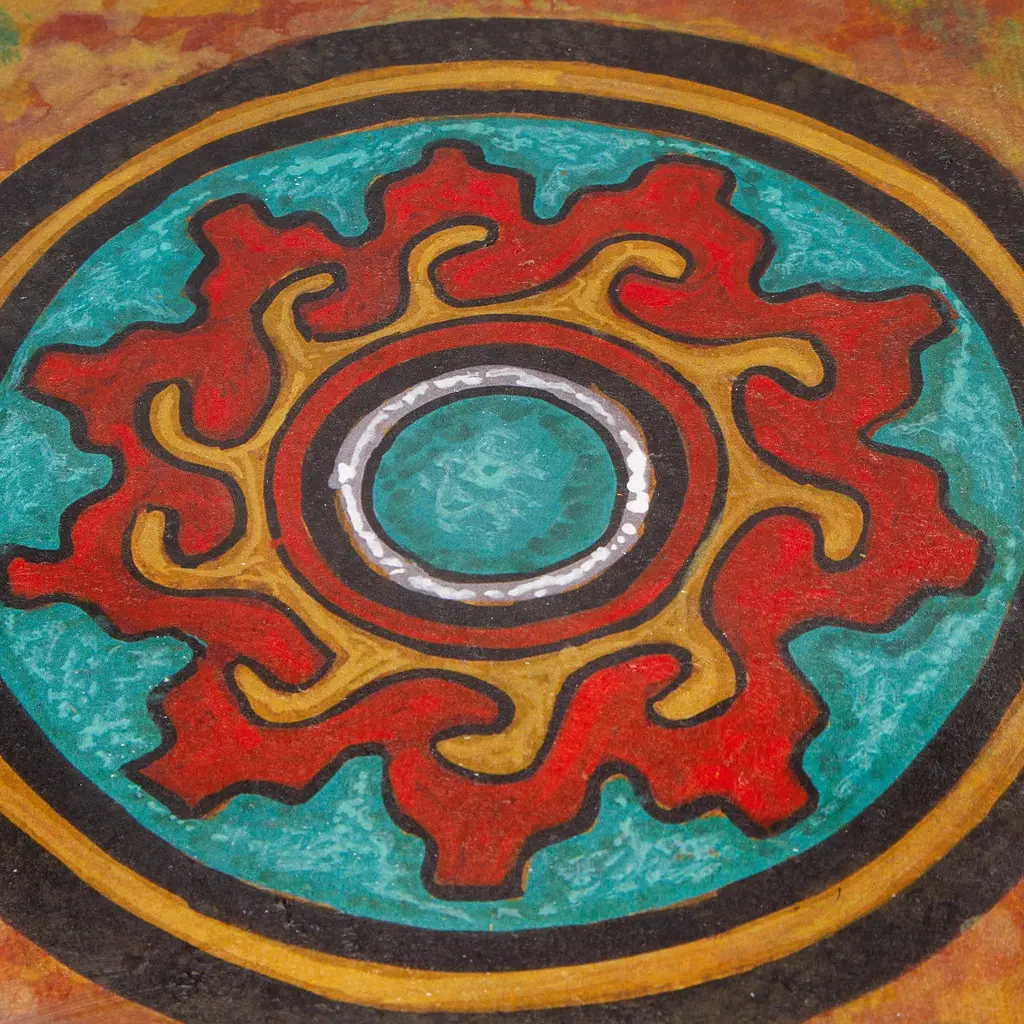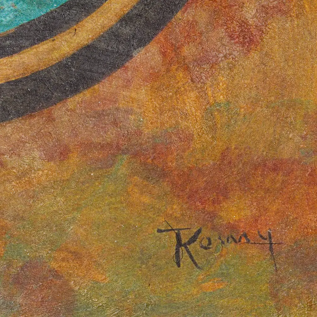 The ancient cultures of the American continent used to create ceramic stamps in a variety of styles that today dazzle many. Inspired by these ancestral artifacts, Rommy from Mexico creates a colorful giclée print honoring his roots and heritage. The ink, in a palette of black, green and red hues, forms a round sign reminiscent of the sun, all over a brown base hue that enhances its cultural aura.The composition comes signed and stretched.