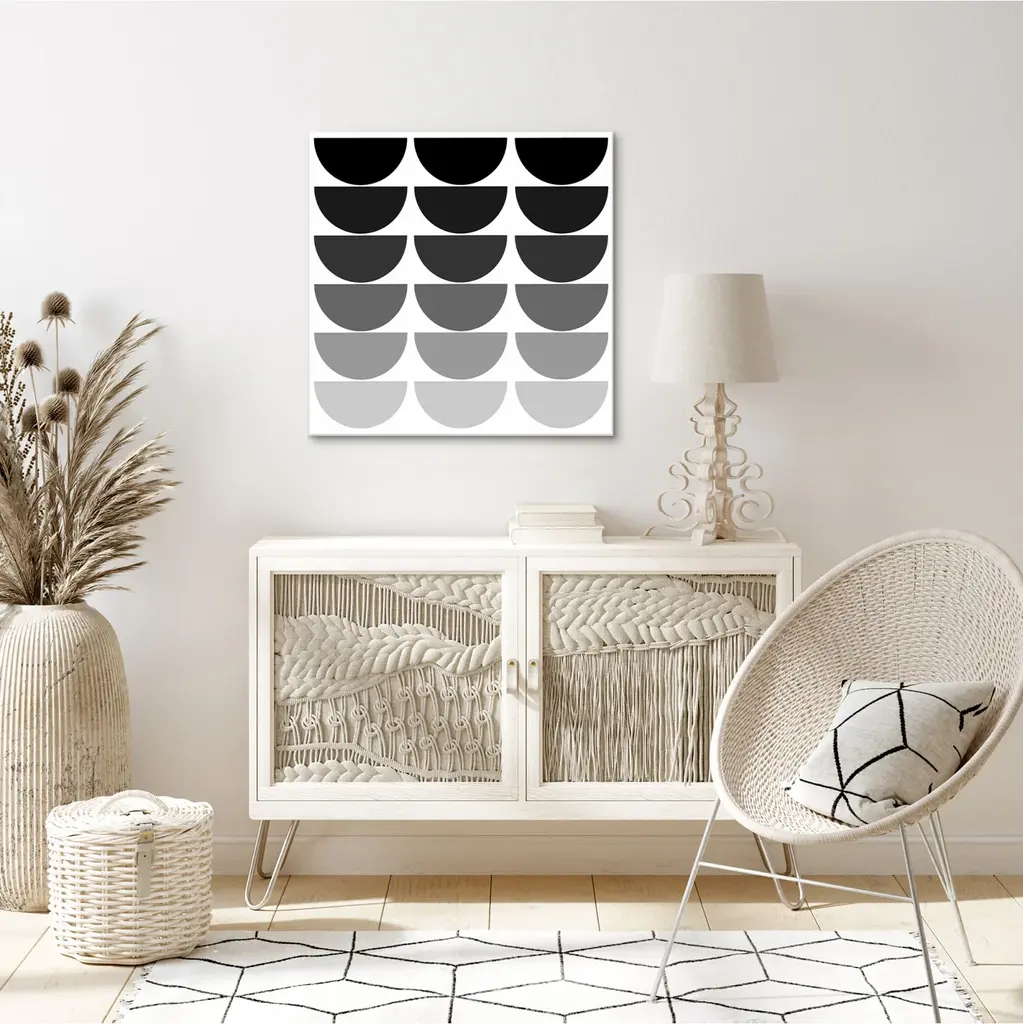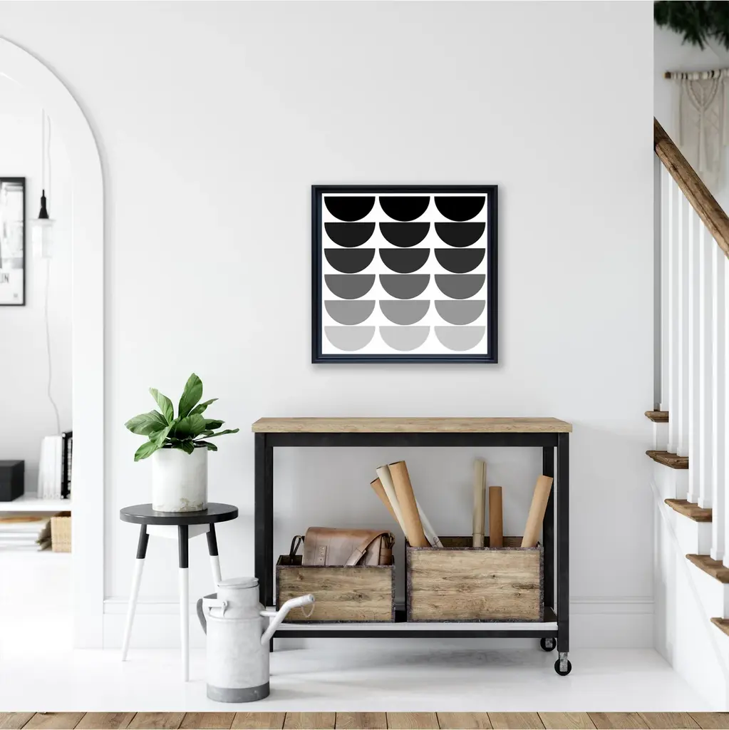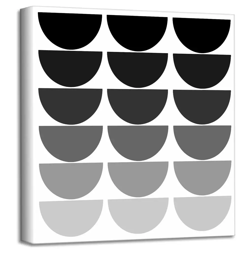 Add a touch of mid-century modern sophistication to your home decor with this minimalist abstract canvas art featuring unique half-moon patterns and shapes in chic black and white tones. The retro geometric artwork titled, 'Ink.Letter.Love XI� by Corey Morrow, will complement your space with its contemporary Scandinavian aesthetic. This piece is handcrafted in Chattanooga, Tennessee using a fine art print on canvas, and assembled on a pine wood frame finished with a rear hanger for simple installation. Presenting an array of playful graphics, a broad assortment of colors, shapes, and text can be found in Corey Morrow's collections.Product Features:� Carefully printed on UV/water resistant poly-cotton matte canvas� Skillfully hand wrapped on a kiln dried pine wood frame� Hanging hardware included for easy installation� Made in the USAAvailable Sizes:� 12" W x 12" H� 20" W x 20" H� 30" W x 30" H� 32" W x 32" H - FramedAdditional Features:� Orientation: Square� Colors: Black, White, Gray� Collection: ChiChi Decor� Title: Ink.Letter.Love VIII� Model No. CM011About Gallery Wrapped CanvasMasterfully produced at R2H factory in Chattanooga, TN. on water resistant canvas using solvent inks, and skillfully wrapped on a wood frame finished with a rear saw-tooth hanger for simple installation. Care Instructions: To clean, wipe with a damp cloth. Do not use cleaning solutions.About Ready2HangArtEstablished in 2013, Ready2HangArt came to life with a vision of innovating the wall decor market while supporting local artists. To this day, the company�s mission is to design and craft art locally at their facility in TN, employ environmentally conscious practices and give back to the community through various channels like their Minor Masters youth outreach program.