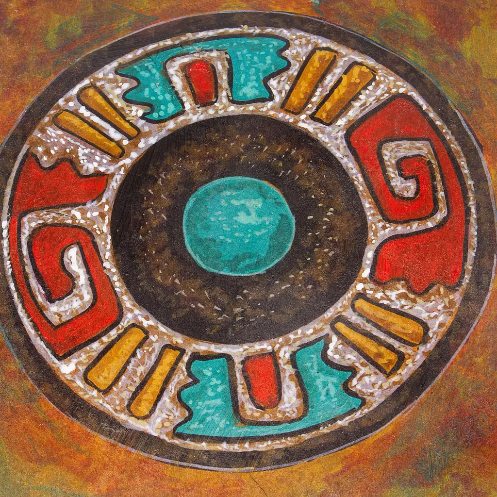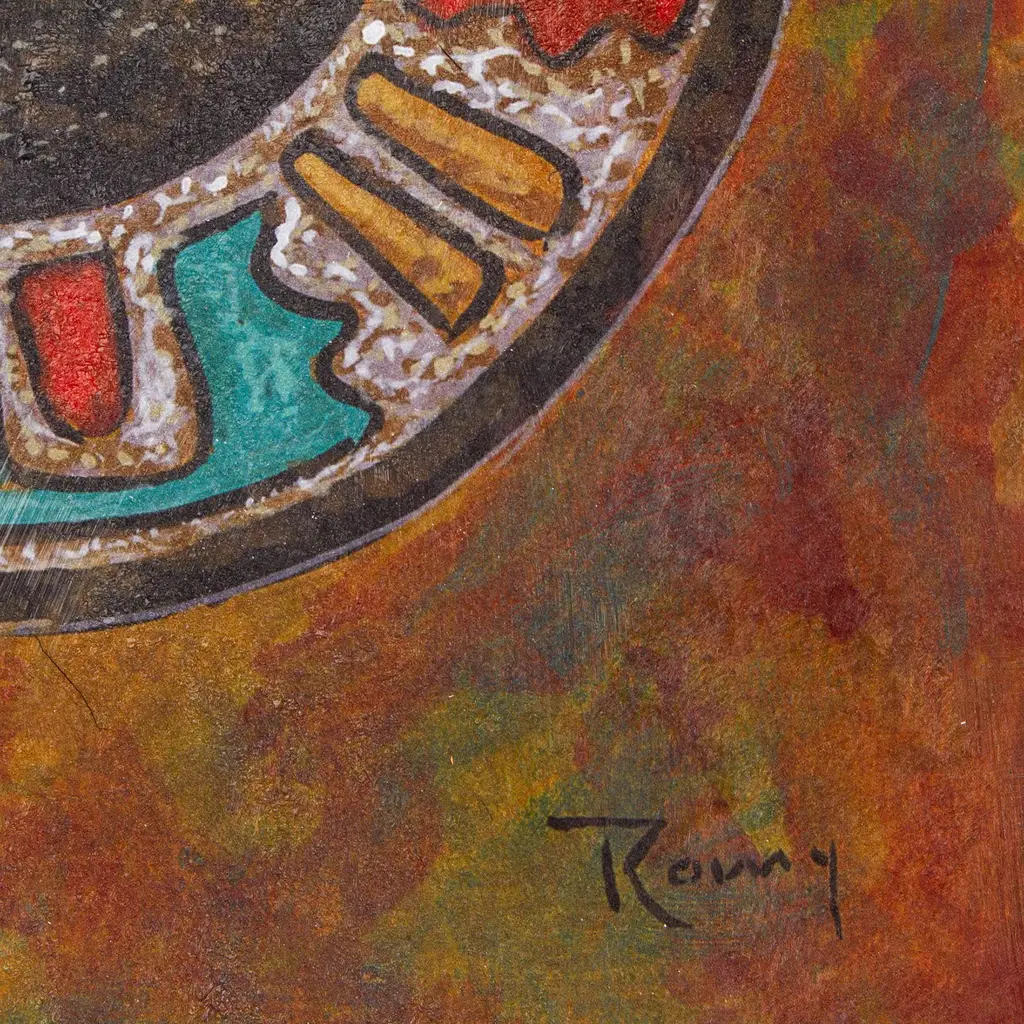 The ancient cultures of the American continent used to create ceramic stamps in a variety of styles that today dazzle many. Inspired by these ancestral artifacts, Rommy from Mexico creates a captivating giclée print honoring his roots and heritage. The ink, in a palette of red, green, yellow and black hues, forms a round sign that evokes the splendor of the old civilizations that once ruled these tropical lands.The composition comes signed and stretched.