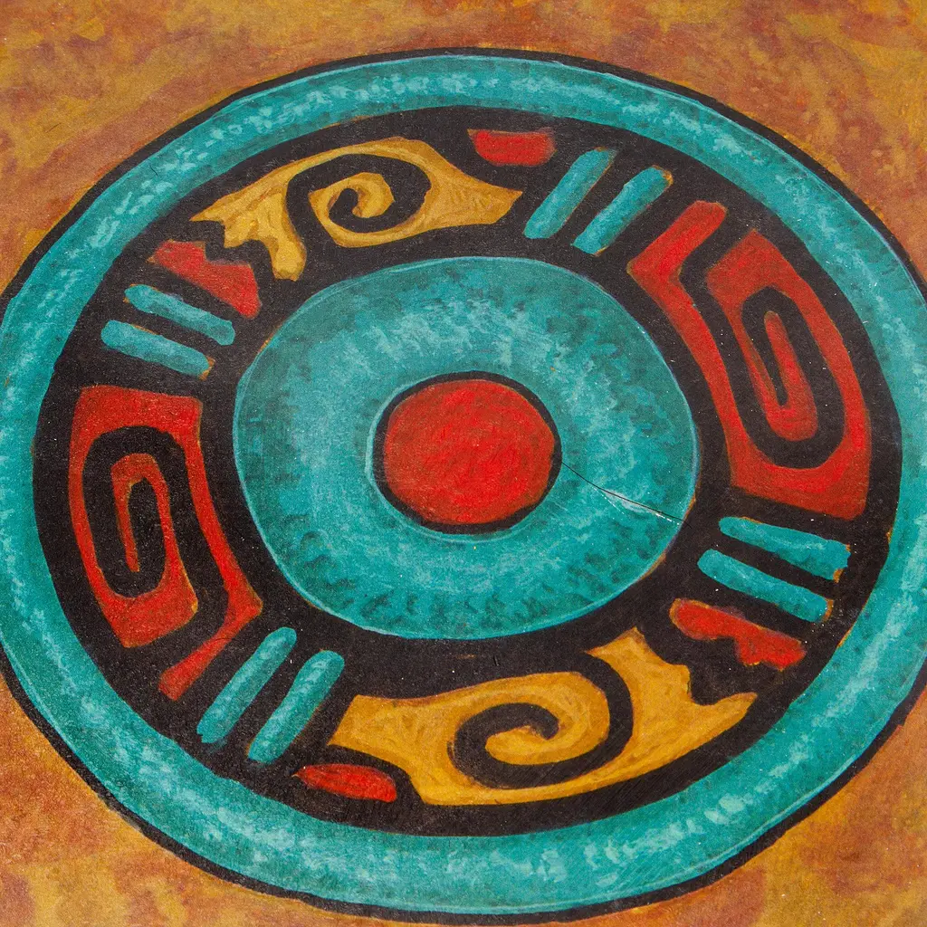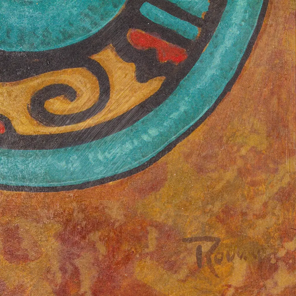 The ancient cultures of the American continent used to create ceramic stamps in a variety of styles that today dazzle many. Inspired by these ancestral artifacts, Rommy from Mexico creates a mystic giclée print honoring his roots and heritage. The ink, in a palette of black, green, brown and red hues, forms a round sign often found in archeological settlements.The composition comes signed and stretched.