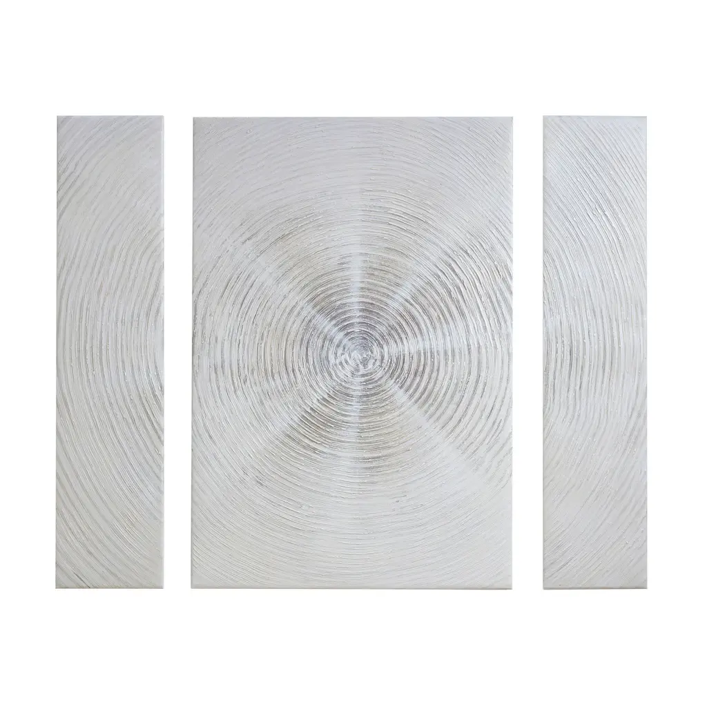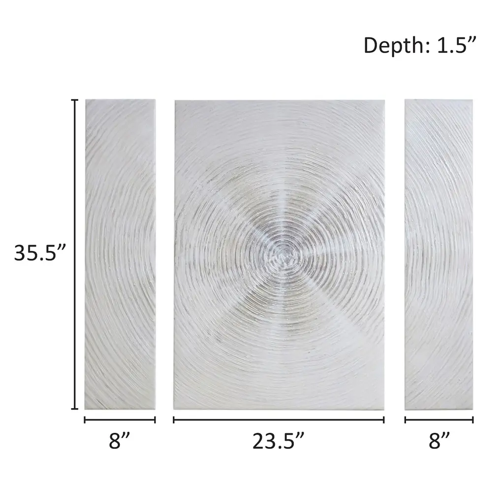 Simplicity and beauty shine through this INK+IVY Silver Sand Hand Embellished Abstract 3-piece Canvas Wall Art Set. When hung together, an impressive contemporary burst design creates a Zen vibe in your room. Hand embellished gel texture adds dimension and charm to this canvas wall art.Features:Dimensions: