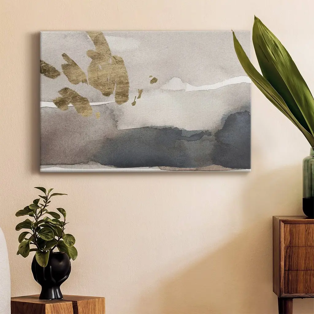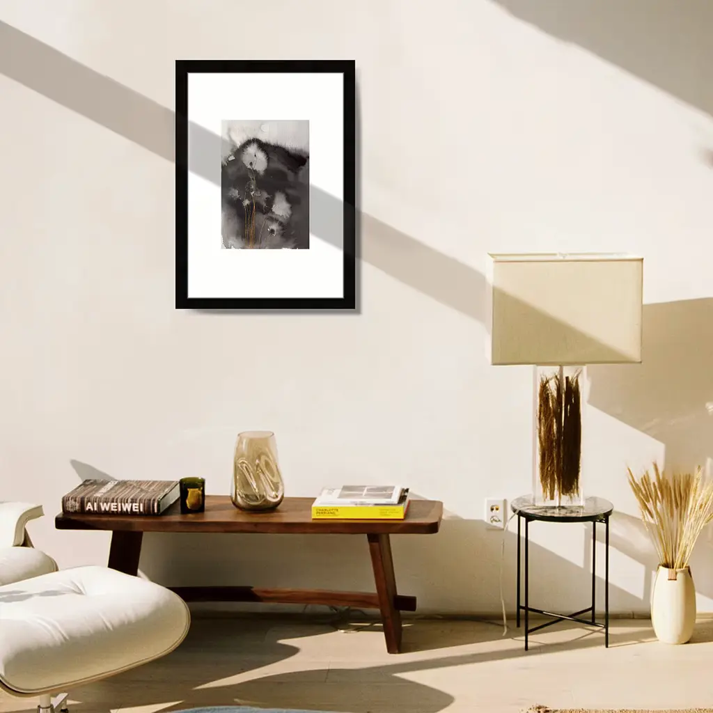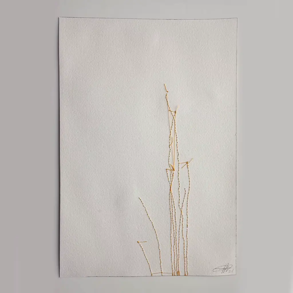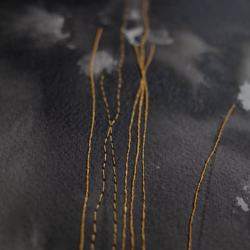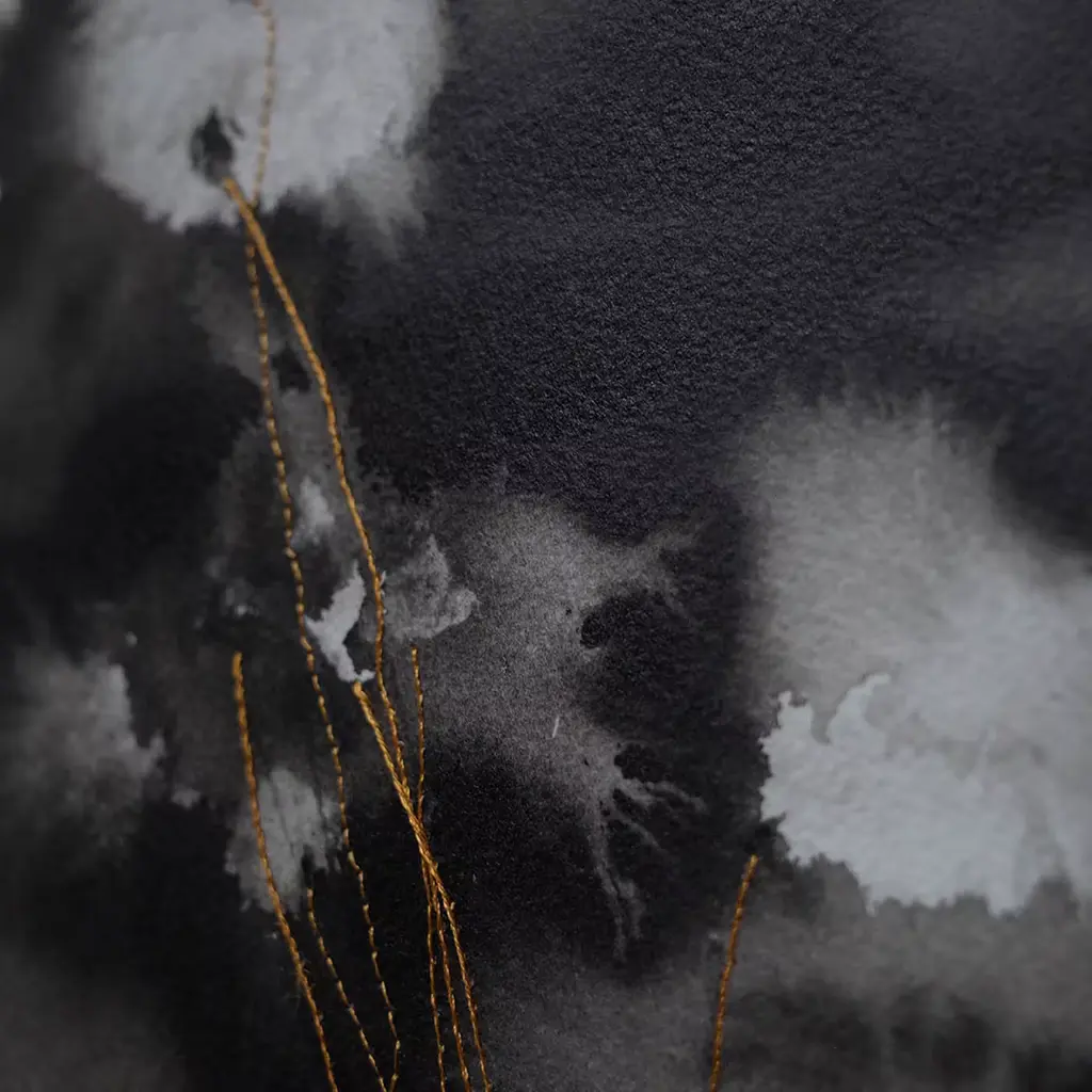 A mottled design obtained with the combination of water and black ink lends this painting on fine Arches paper (300 g/mq) its ethereal charm. Enlivened by thin embroideries created with a precious gold thread, the painting was conceived to actualize the bond between light and darkness, a transformative path where randomness and choice intertwine. The frame is not supplied.