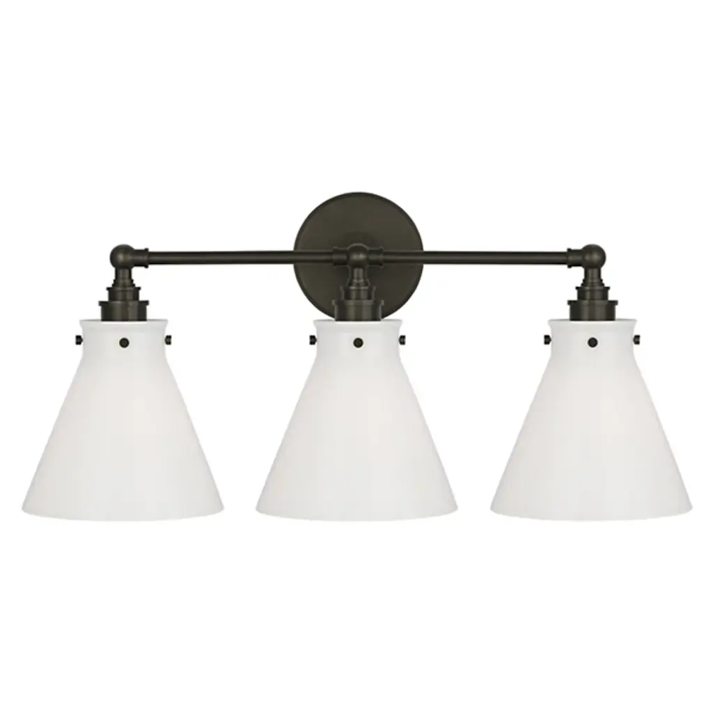 INNOVATIONS 205BK-BPSN-HRSN-G61 3-Light Bath Vanity Light Matte Black. Collection: Franklin Restoration. Style: Industrial, Farmhouse, Restoration-Vintage, Transitional. Metal Finish: Matte Black. Metal Finish (Canopy/Backplate): Matte Black. Accent Color: Brushed Satin Nickel Fitter. Material: Steel, Cast Brass, Glass. Dimension(in): 11(H) x 30(W) x 8(Ext). Bulb: (3)60W Medium Base,Dimmable(Not Included). Maximum Wattage Per Socket: 100. Voltage: 120. Color Temperature (Kelvin): 2200. CRI: 99. 9. Lumens: 220. Glass Shade Description: Matte White Cased Small Cone. Glass or Metal Shade Color: Matte White. Shade Material: Glass. Glass Type: Frosted. Shade Shape: Cone. Shade Dimension(in): 6. 25(W) x 5. 75(H). Fitter Measurement (Glass Or Metal Shade Fitter Size): 3. 25 inch Fitter. Backplate Dimension(in): 5. 5(Dia) x 1(Depth). ADA Compliant: No. California Proposition 65 Warning Required: Yes. UL & ETL Certification: Damp Location.