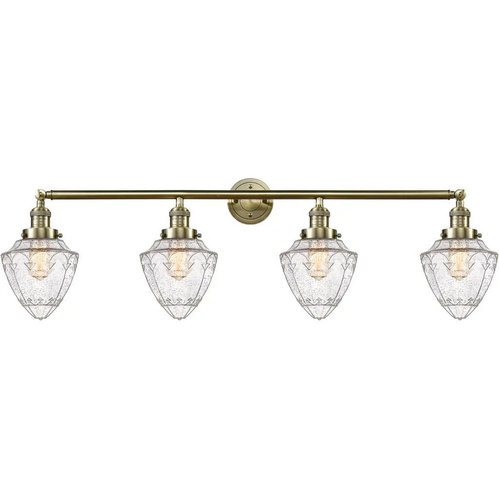 INNOVATIONS 215-BB-G664-7 4-Light Bath Vanity Light Brushed Brass. Collection: Franklin Restoration. Style: Traditional, Art Deco. Metal Finish: Brushed Brass. Metal Finish (Canopy/Backplate): Brushed Brass. Material: Steel, Cast Brass, Glass. Dimension(in): 15(H) x 45. 75(W) x 8(Ext). Bulb: (4)60W Medium Base,Dimmable(Not Included). Maximum Wattage Per Socket: 100. Voltage: 120. Color Temperature (Kelvin): 2200. CRI: 99. 9. Lumens: 220. Glass Shade Description: Seedy Small Bullet. Glass or Metal Shade Color: Seedy. Shade Material: Glass. Glass Type: Seeded. Shade Shape: Schoolhouse. Shade Dimension(in): 7(W) x 8(H). Fitter Measurement (Glass Or Metal Shade Fitter Size): 3. 25 inch Fitter. Canopy Dimension(in): 4. 5(Dia). Backplate Dimension(in): 4. 5(Dia) x 0. 75(Depth). ADA Compliant: No. California Proposition 65 Warning Required: Yes. UL & ETL Certification: Damp Location.