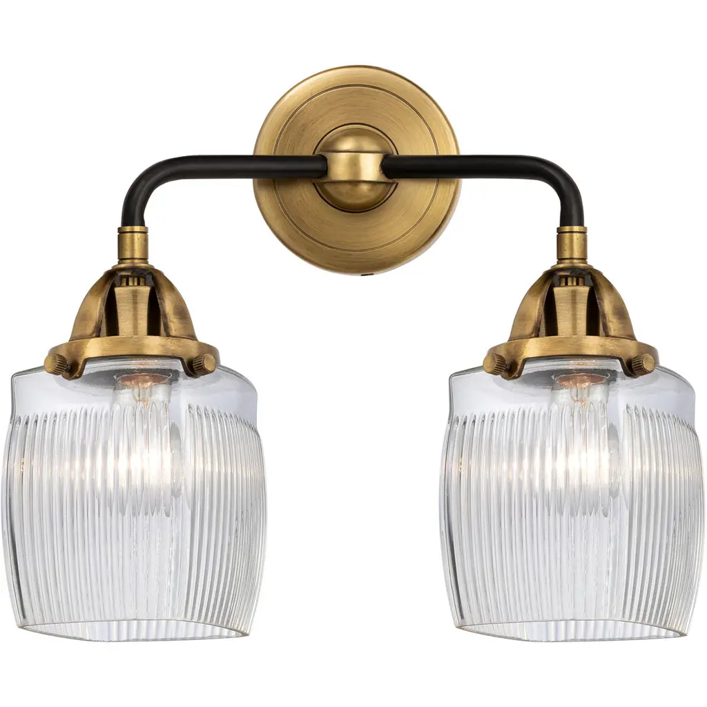 Innovations 288-2W-BB-G302-LED 2-Light Bath Vanity Light Brushed Brass. Collection: Nouveau 2. Style: Transitional, Industrial, Restoration-Vintage. Metal Finish: Brushed Brass. Metal Finish (Canopy/Backplate): Brushed Brass. Material: Steel, Cast Brass, Glass. Dimension(in): 12. 375(H) x 13. 5(W) x 7(Ext). Bulb: (2)6W Medium Base,Dimmable(Not Included). Maximum Wattage Per Socket: 100. Voltage: 120. Color Temperature (Kelvin): 2700. CRI: 82. Lumens: 600. Glass Shade Description: Thick Clear Halophane Colton. Glass or Metal Shade Color: Clear Halophane. Shade Material: Glass. Glass Type: Transparent; Ribbed. Shade Shape: Cube. Shade Dimension(in): 5. 5(W) x 6(H). Fitter Measurement (Glass Or Metal Shade Fitter Size): 3. 25 inch Fitter. Canopy Dimension(in): 4. 5(Dia). Backplate Dimension(in): 4. 5(Dia) x 0. 75(Depth). California Proposition 65 Warning Required: Yes. UL and ETL Certification: Damp Location.