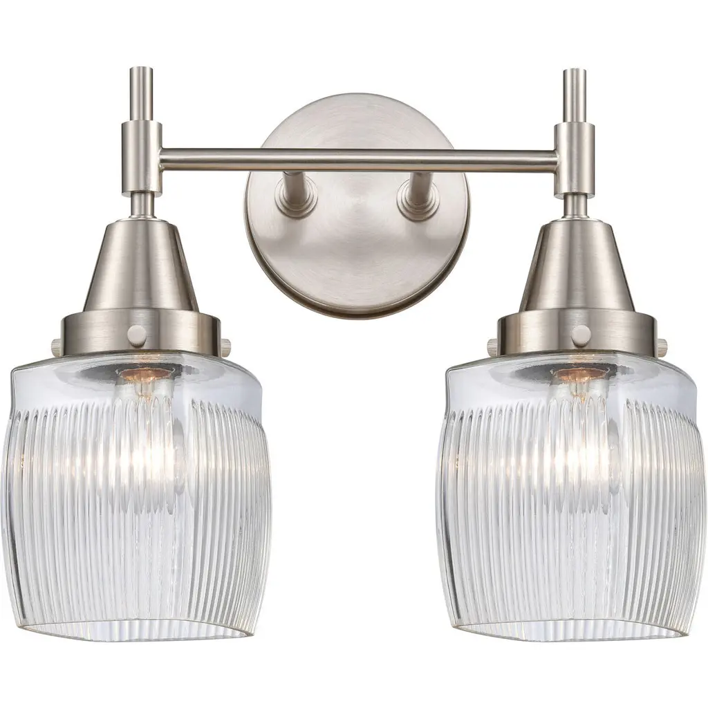 Innovations 288-2W-SN-G302 2-Light Bath Vanity Light Brushed Satin Nickel. Collection: Nouveau 2. Style: Transitional, Industrial, Restoration-Vintage. Metal Finish: Brushed Satin Nickel. Metal Finish (Canopy/Backplate): Brushed Satin Nickel. Material: Steel, Cast Brass, Glass. Dimension(in): 12. 375(H) x 13. 5(W) x 7(Ext). Bulb: (2)60W Medium Base,Dimmable(Not Included). Maximum Wattage Per Socket: 100. Voltage: 120. Color Temperature (Kelvin): 2200. CRI: 99. 9. Lumens: 220. Glass Shade Description: Thick Clear Halophane Colton. Glass or Metal Shade Color: Clear Halophane. Shade Material: Glass. Glass Type: Transparent; Ribbed. Shade Shape: Cube. Shade Dimension(in): 5. 5(W) x 6(H). Fitter Measurement (Glass Or Metal Shade Fitter Size): 3. 25 inch Fitter. Canopy Dimension(in): 4. 5(Dia). Backplate Dimension(in): 4. 5(Dia) x 0. 75(Depth). California Proposition 65 Warning Required: Yes. UL and ETL Certification: Damp Location.