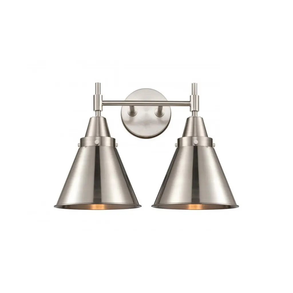 Innovations 288-2W-SN-M13-SN-LED 2-Light Bath Vanity Light Brushed Satin Nickel. Collection: Nouveau 2. Style: Transitional, Industrial, Restoration-Vintage. Metal Finish: Brushed Satin Nickel. Metal Finish (Shade): Brushed Satin Nickel. Metal Finish (Canopy/Backplate): Brushed Satin Nickel. Material: Steel, Cast Brass, Glass. Dimension(in): 12. 5(H) x 16(W) x 8. 25(Ext). Bulb: (2)6W Medium Base,Dimmable(Not Included). Maximum Wattage Per Socket: 100. Voltage: 120. Color Temperature (Kelvin): 2700. CRI: 82. Lumens: 600. Glass or Metal Shade Color: Brushed Satin Nickel. Shade Material: Metal. Shade Shape: Cone. Metal Shade Description: Brushed Satin Nickel Appalachian. Shade Dimension(in): 8(W) x 6. 125(H). Fitter Measurement (Glass Or Metal Shade Fitter Size): 3. 25 inch Fitter. Canopy Dimension(in): 4. 5(Dia). Backplate Dimension(in): 4. 5(Dia) x 0. 75(Depth). California Proposition 65 Warning Required: Yes. UL and ETL Certification: Damp Location.