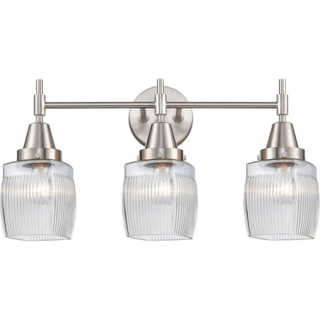Innovations 288-3W-BPN-G302-LED Colton 3 Light 23.5" Bath Vanity Light Black Polished Nickel. Collection: Nouveau 2. Style: Transitional, Industrial, Restoration-Vintage. Metal Finish: Black Polished Nickel. Metal Finish(Canopy/Backplate): Polished Nickel. Accent Color: Matte Black. Material: Steel, Cast Brass, Glass. Dimensions(in): 10.375(H) x 23.5(W) x 7(Ext). Bulb: (3)6W LED(Included). Maximum Wattage Per Socket: 100. Voltage: 120. Dimmable: Yes. Color Temperature (Kelvin): 2700. Color Rendering Index (CRI): 82. Lumens: 600. Life Expectancy (Hours): 15000. Glass Shade Description: Thick Clear Halophane Colton. Glass Type: Transparent; Ribbed. Shade Shape: Square/Rectangle. Glass or Metal Shade Color: Clear Halophane. Shade Material: Glass. Shade Dimensions(in): 5.5(W) x 6(H). Fitter Measurement (Glass or Metal Shade Fitter Size): 3.25" Fitter. Canopy Dimensions(in): 4.5(Dia). Backplate Dimenisons(in): 4.5(Dia) x 0.75(Depth). Mounting Center to Top: 2.25. Reversible (Can be hung with bulbs facing uo or down): Yes. California Proposition 65 Warning Required: Yes. UL and ETL Certification: Damp Location.