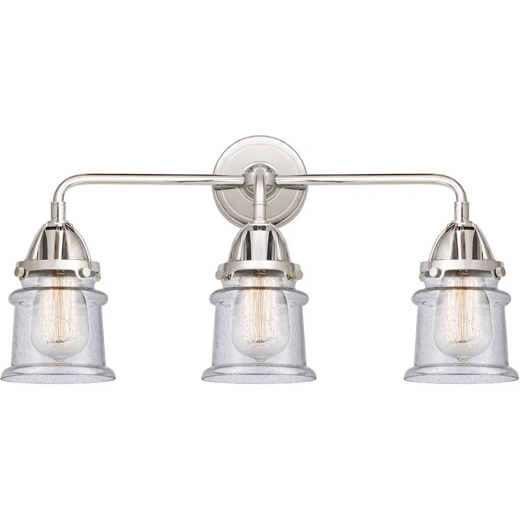 Innovations 288-3W-PC-G322-LED Olean 3 Light 24.75" Bath Vanity Light Polished Chrome. Collection: Nouveau 2. Style: Industrial, Nautical, Restoration-Vintage, Traditional. Metal Finish: Polished Chrome. Metal Finish(Canopy/Backplate): Polished Chrome. Material: Steel, Cast Brass, Glass. Dimensions(in): 9.375(H) x 24.75(W) x 6.875(Ext). Bulb: (3)6W LED(Included). Maximum Wattage Per Socket: 100. Voltage: 120. Dimmable: Yes. Color Temperature (Kelvin): 2700. Color Rendering Index (CRI): 82. Lumens: 500. Life Expectancy (Hours): 15000. Glass Shade Description: Clear Olean. Glass Type: Transparent. Shade Shape: Bell/Urn. Glass or Metal Shade Color: Clear. Shade Material: Glass. Shade Dimensions(in): 6.75(W) x 5(H). Fitter Measurement (Glass or Metal Shade Fitter Size): 3.25" Fitter. Canopy Dimensions(in): 4.5(Dia). Backplate Dimenisons(in): 4.5(Dia) x 0.75(Depth). Mounting Center to Top: 2.25. Reversible (Can be hung with bulbs facing uo or down): Yes. California Proposition 65 Warning Required: Yes. UL and ETL Certification: Damp Location.