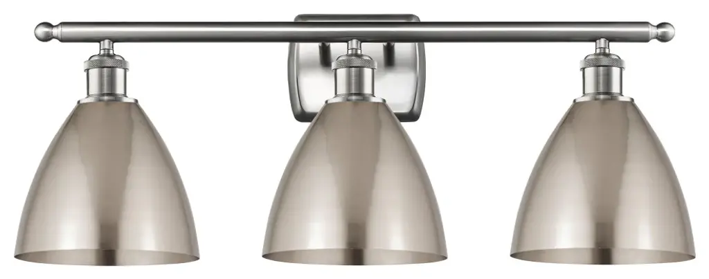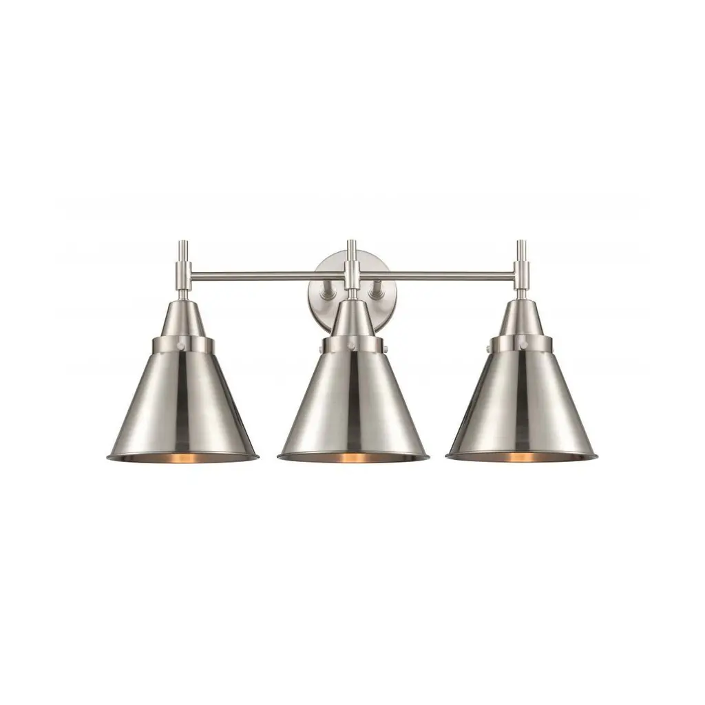 Innovations 288-3W-PC-M13-PC-LED Appalachian 3 Light 26" Bath Vanity Light Polished Chrome. Collection: Nouveau 2. Style: Transitional, Industrial, Restoration-Vintage. Metal Finish: Polished Chrome. Metal Finish(Shade): Polished Chrome. Metal Finish(Canopy/Backplate): Polished Chrome. Material: Steel, Cast Brass, Glass. Dimensions(in): 10.5(H) x 26(W) x 8.25(Ext). Bulb: (3)6W LED(Included). Maximum Wattage Per Socket: 100. Voltage: 120. Dimmable: Yes. Color Temperature (Kelvin): 2700. Color Rendering Index (CRI): 82. Lumens: 600. Life Expectancy (Hours): 15000. Shade Shape: Cone. Glass or Metal Shade Color: Polished Chrome. Shade Material: Metal. Metal Shade Description: Polished Chrome Appalachian. Shade Dimensions(in): 8(W) x 6.125(H). Fitter Measurement (Glass or Metal Shade Fitter Size): 3.25" Fitter. Canopy Dimensions(in): 4.5(Dia). Backplate Dimenisons(in): 4.5(Dia) x 0.75(Depth). Mounting Center to Top: 2.25. Reversible (Can be hung with bulbs facing uo or down): Yes. California Proposition 65 Warning Required: Yes. UL and ETL Certification: Damp Location.