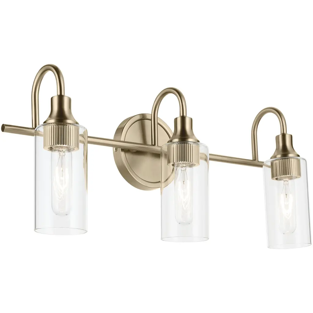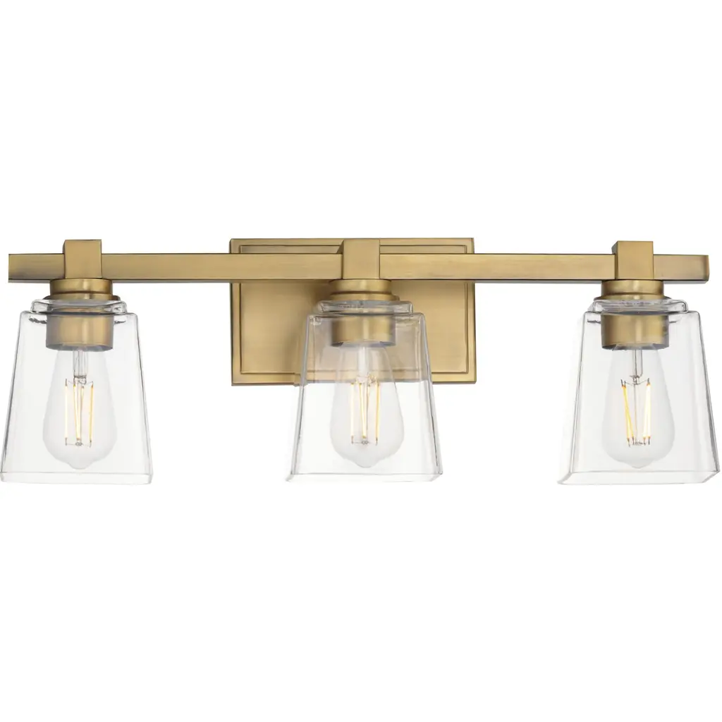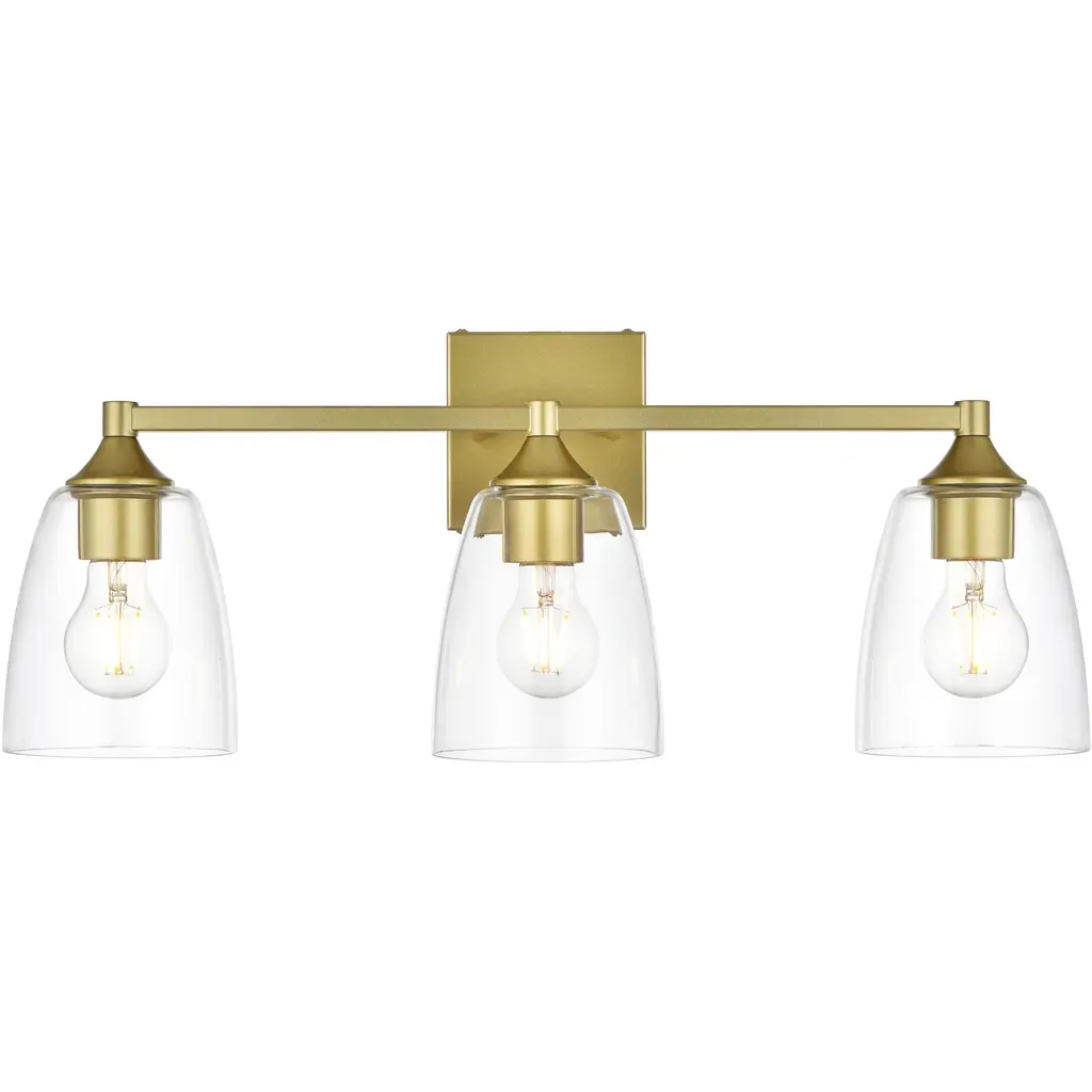 Innovations 288-3W-SG-G312 Dover 3 Light 22.5" Bath Vanity Light Satin Gold. Collection: Nouveau 2. Style: Transitional, Industrial, Restoration-Vintage. Metal Finish: Satin Gold. Metal Finish(Canopy/Backplate): Satin Gold. Material: Steel, Cast Brass, Glass. Dimensions(in): 10.875(H) x 22.5(W) x 6.5(Ext). Bulb: (3)60W Medium Base Incandescent(Not Included). Maximum Wattage Per Socket: 100. Voltage: 120. Dimmable: Yes. Color Temperature (Kelvin): 2200. Color Rendering Index (CRI): 99.9. Lumens: 220. Life Expectancy (Hours): 2000. Glass Shade Description: Clear Dover. Glass Type: Transparent. Shade Shape: Cylinder. Glass or Metal Shade Color: Clear. Shade Material: Glass. Shade Dimensions(in): 4.5(W) x 6.5(H). Fitter Measurement (Glass or Metal Shade Fitter Size): 3.25" Fitter. Canopy Dimensions(in): 4.5(Dia). Backplate Dimenisons(in): 4.5(Dia) x 0.75(Depth). Mounting Center to Top: 2.25. ADA Compliant: No. Reversible (Can be hung with bulbs facing uo or down): Yes. California Proposition 65 Warning Required: Yes. UL and ETL Certification: Damp Location.