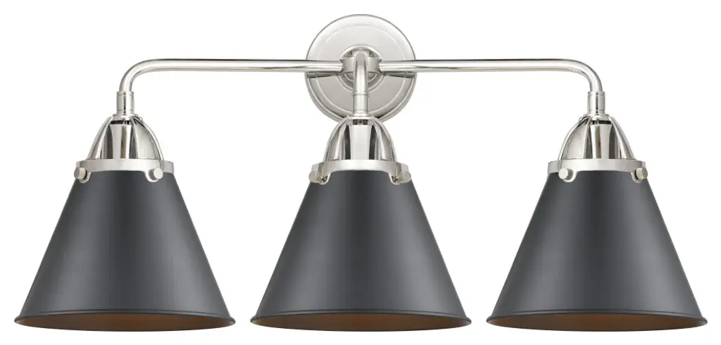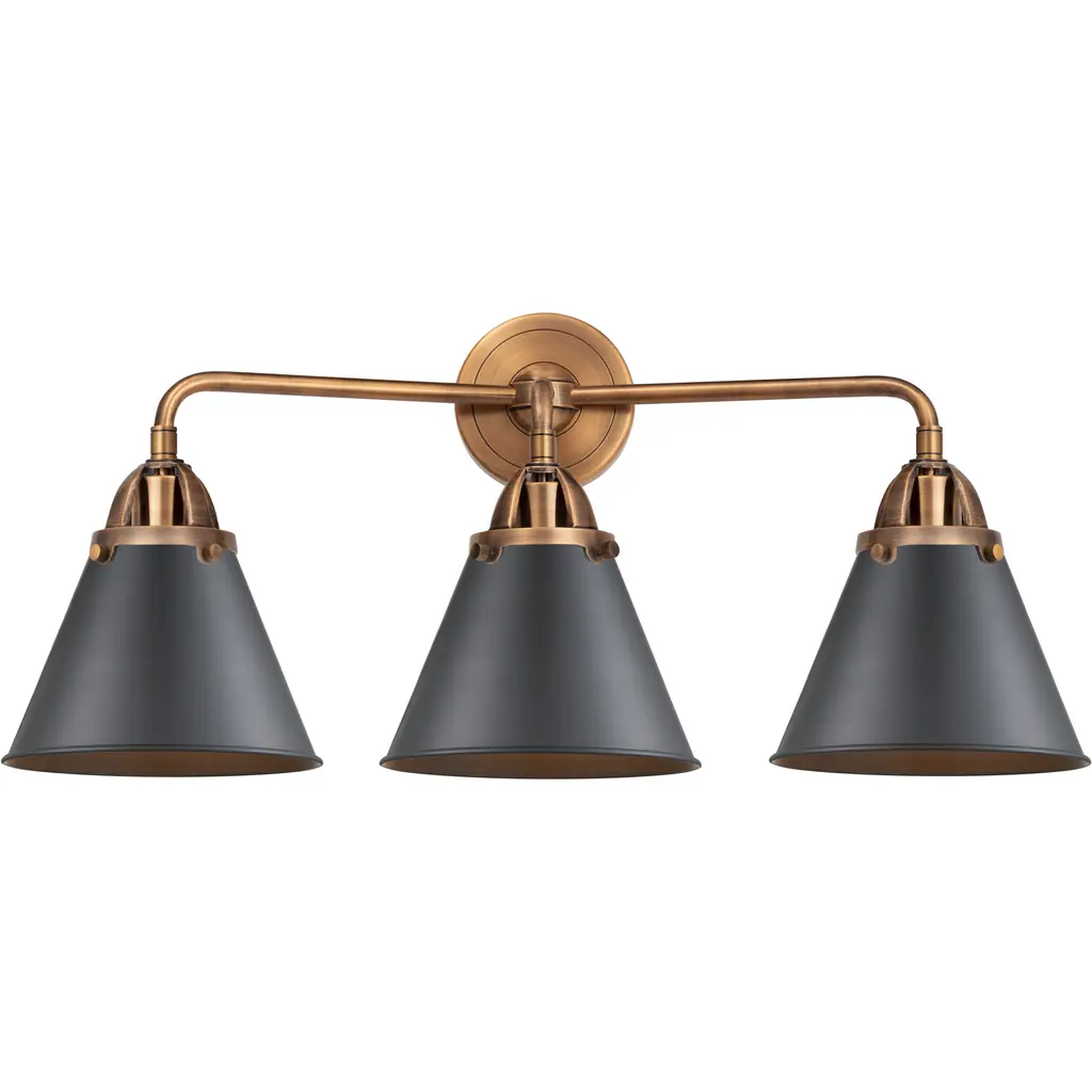 Innovations 288-3W-SG-M13-BK Appalachian 3 Light 26" Bath Vanity Light Satin Gold. Collection: Nouveau 2. Style: Transitional, Industrial, Restoration-Vintage. Metal Finish: Satin Gold. Metal Finish(Shade): Matte Black. Metal Finish(Canopy/Backplate): Satin Gold. Material: Steel, Cast Brass, Glass. Dimensions(in): 10.5(H) x 26(W) x 8.25(Ext). Bulb: (3)60W Medium Base Incandescent(Not Included). Maximum Wattage Per Socket: 100. Voltage: 120. Dimmable: Yes. Color Temperature (Kelvin): 2200. Color Rendering Index (CRI): 99.9. Lumens: 220. Life Expectancy (Hours): 2000. Shade Shape: Cone. Glass or Metal Shade Color: Matte Black. Shade Material: Metal. Metal Shade Description: Matte Black Appalachian. Shade Dimensions(in): 8(W) x 6.125(H). Fitter Measurement (Glass or Metal Shade Fitter Size): 3.25" Fitter. Canopy Dimensions(in): 4.5(Dia). Backplate Dimenisons(in): 4.5(Dia) x 0.75(Depth). Mounting Center to Top: 2.25. Reversible (Can be hung with bulbs facing uo or down): Yes. California Proposition 65 Warning Required: Yes. UL and ETL Certification: Damp Location.