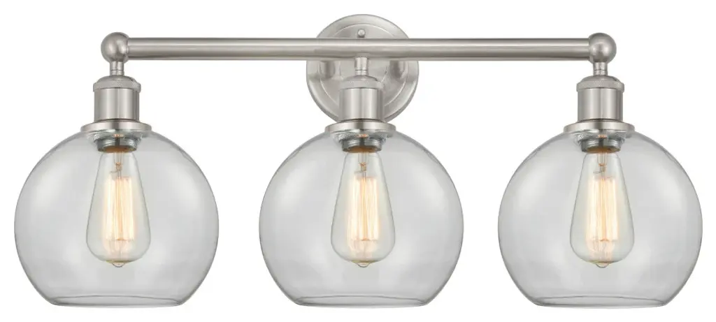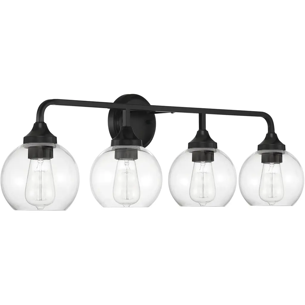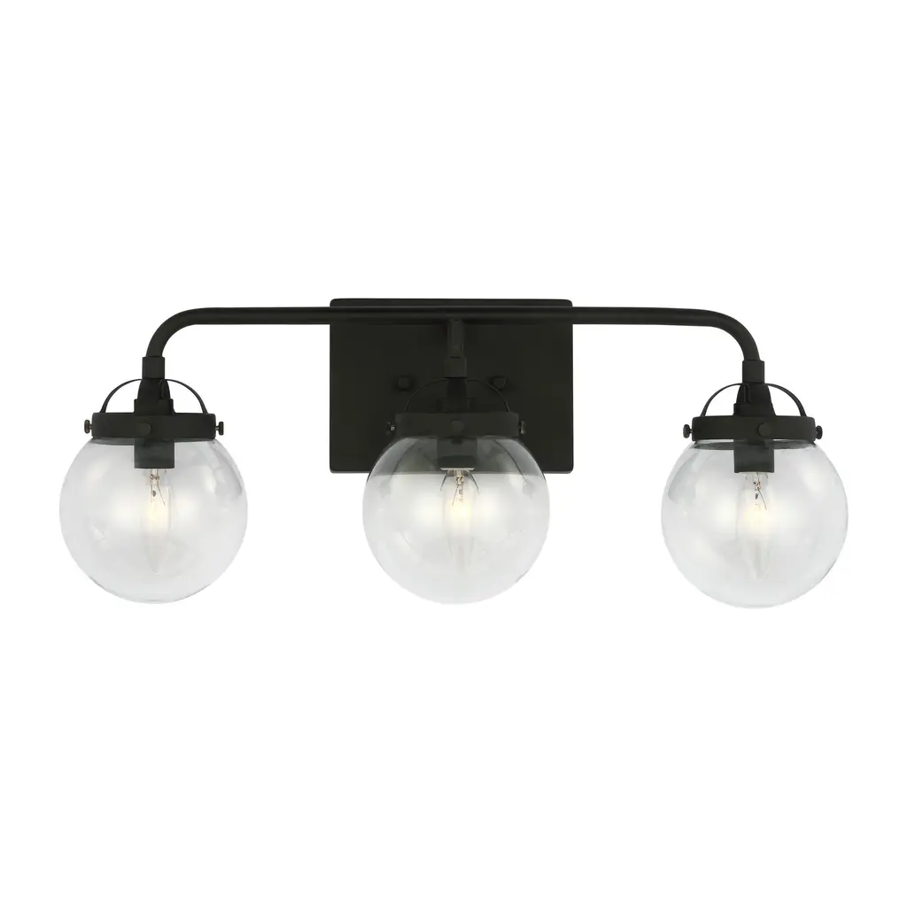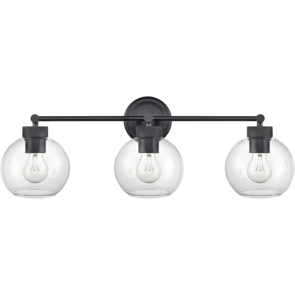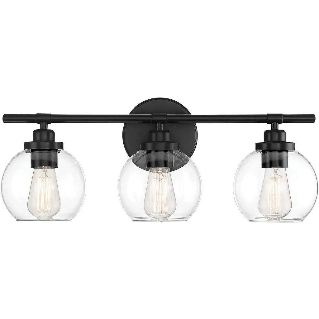 Innovations 351-3W-BK-CL Span 3 Light 24.875 inch Bath Vanity Light Matte Black. Collection: Auralume. Style: Transitional, Industrial, Restoration-Vintage. Metal Finish: Matte Black. Metal Finish(Canopy/Backplate): Matte Black. Material: Steel, Cast Brass, Glass. Dimensions(in): 11.75(H) x 24.875(W) x 7(Ext). Bulb: (3)4W LED(Included). Maximum Wattage Per Socket: 100. Voltage: 120. Dimmable: Yes. Color Temperature (Kelvin): 2700. Color Rendering Index (CRI): 80. Lumens: 350. Life Expectancy (Hours): 15000. Glass Shade Description: Clear Span. Glass Type: Transparent. Shade Shape: Globe/Orb. Glass or Metal Shade Color: Clear. Shade Material: Glass. Shade Dimensions(in): 6(W) x 6.125(H). Backplate Dimenisons(in): 5(Dia) x 1(Depth). Reversible (Can be hung with bulbs facing uo or down): No. California Proposition 65 Warning Required: Yes. UL and ETL Certification: Damp Location.