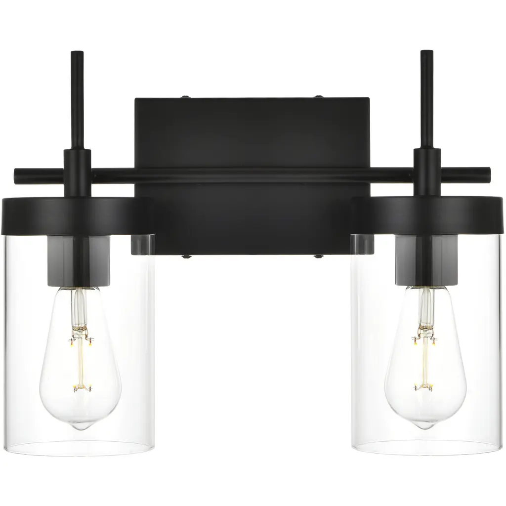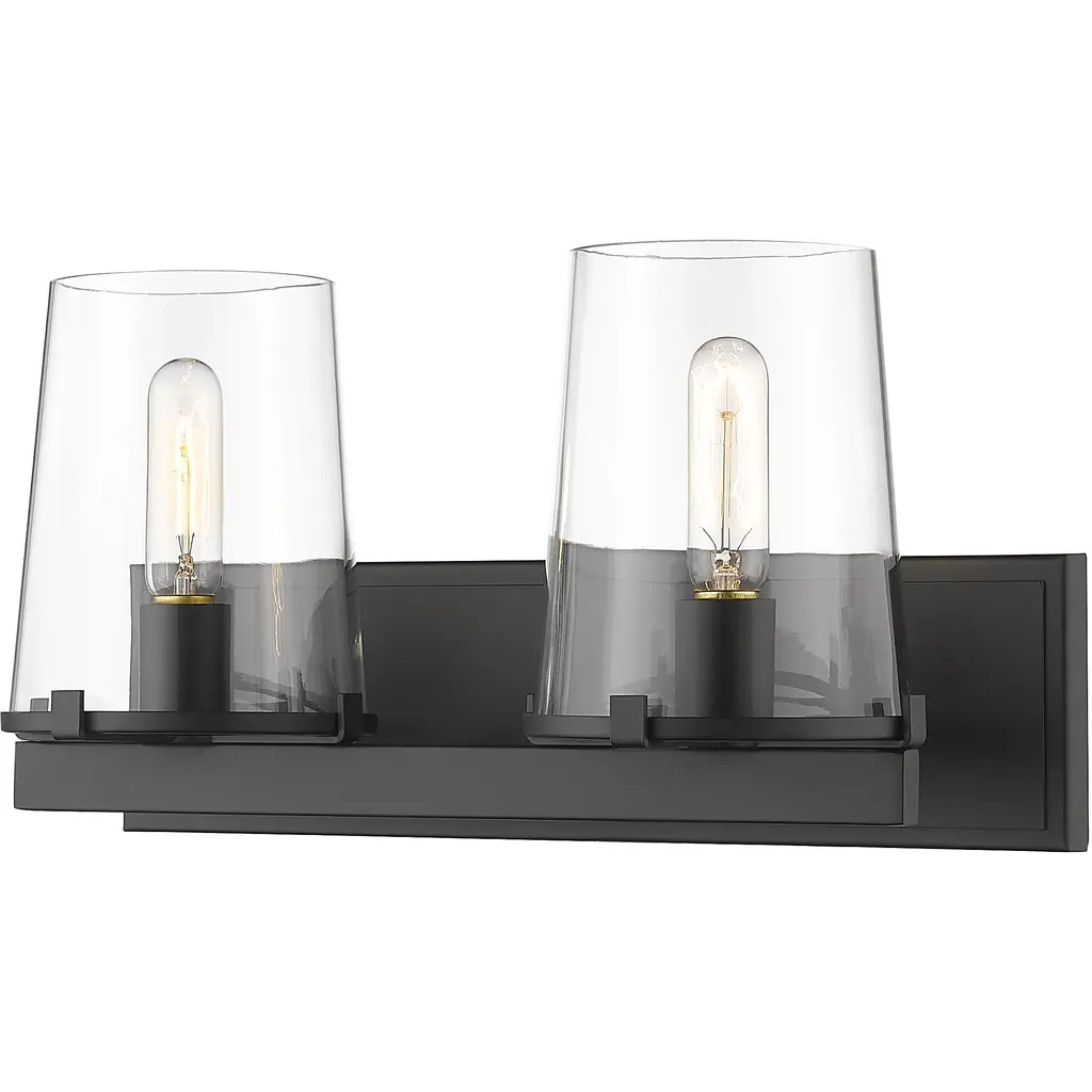 Innovations 352-2W-BK-CL Press 2 Light 16 inch Bath Vanity Light Matte Black. Collection: Auralume. Style: Transitional, Industrial, Restoration-Vintage. Metal Finish: Matte Black. Metal Finish(Canopy/Backplate): Matte Black. Material: Steel, Cast Brass, Glass. Dimensions(in): 12.625(H) x 16(W) x 6.75(Ext). Bulb: (2)6W LED(Included). Maximum Wattage Per Socket: 100. Voltage: 120. Dimmable: Yes. Color Temperature (Kelvin): 2700. Color Rendering Index (CRI): 90. Lumens: 750. Life Expectancy (Hours): 15000. Glass Shade Description: Clear Press. Glass Type: Transparent. Shade Shape: Cylinder. Glass or Metal Shade Color: Clear. Shade Material: Glass. Shade Dimensions(in): 3.875(W) x 8.5(H). Backplate Dimenisons(in): 4.5(H) x 16(W) x 0.75(Depth). Reversible (Can be hung with bulbs facing uo or down): No. California Proposition 65 Warning Required: Yes. UL and ETL Certification: Damp Location.