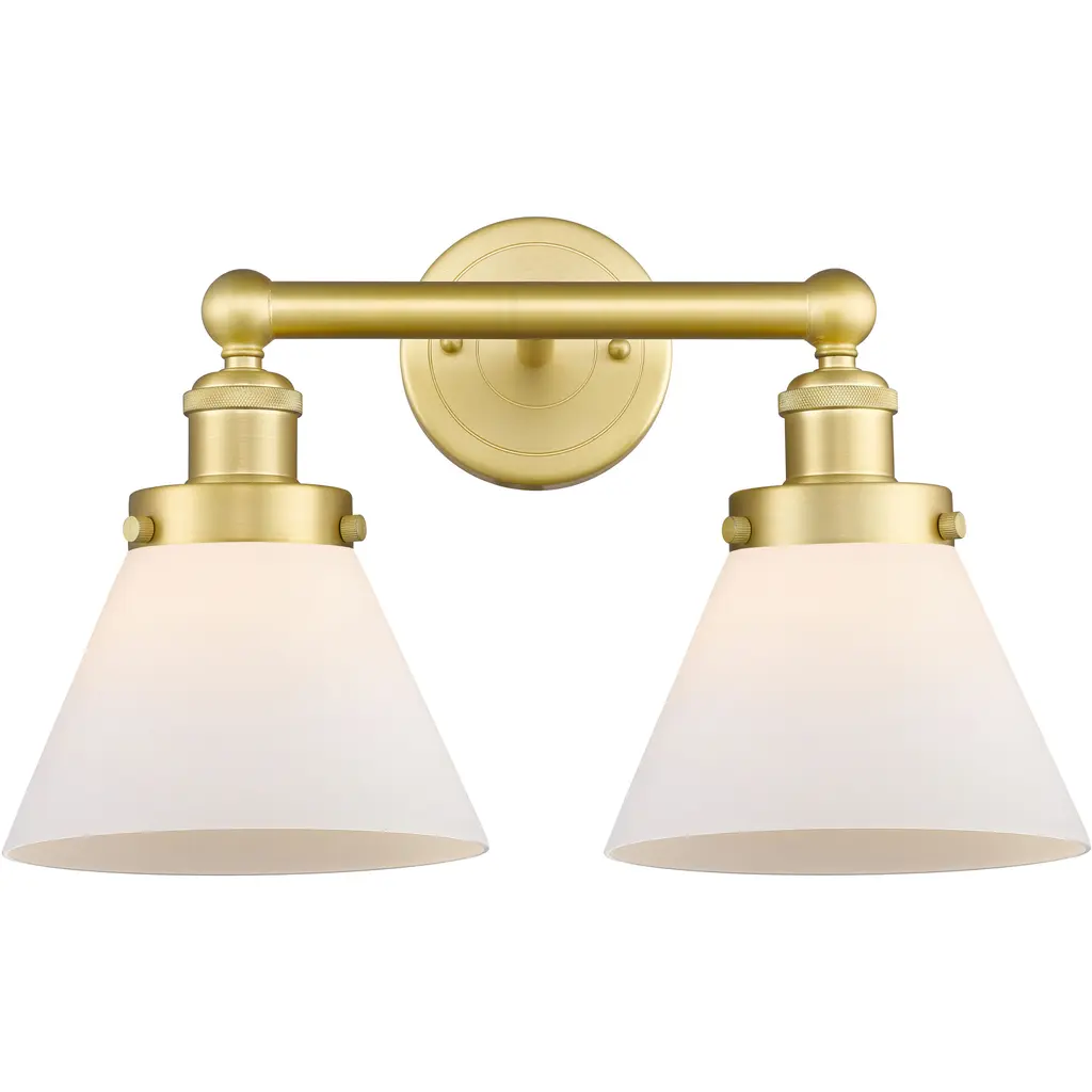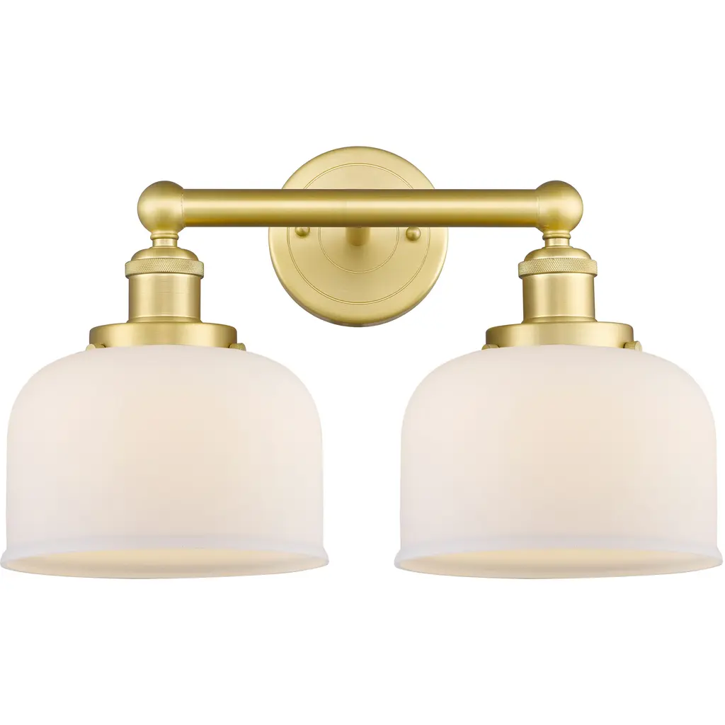 Innovations 447-2W-SG-G181-LED 2-Light Bath Vanity Light Satin Gold. Style: Retro, Industrial. Metal Finish: Satin Gold. Metal Finish (Canopy/Backplate): Satin Gold. Material: Steel, Glass. Dimension(in): 12. 5(H) x 15(W) x 8. 25(Ext). Bulb: (2)6W Medium Base,Dimmable(Not Included). Maximum Wattage Per Socket: 100. Voltage: 120. Color Temperature (Kelvin): 2700. CRI: 82. Lumens: 600. Glass Shade Description: Matte White Canton. Glass or Metal Shade Color: Matte White. Shade Material: Glass. Glass Type: Frosted. Shade Shape: Bell. Shade Dimension(in): 6(W) x 7. 25(H). Fitter Measurement (Glass Or Metal Shade Fitter Size): 3. 25 inch Fitter. Backplate Dimension(in): 5. 25(Dia) x 0. 875(Depth). ADA Compliant: No. California Proposition 65 Warning Required: Yes. UL and ETL Certification: Damp Location.