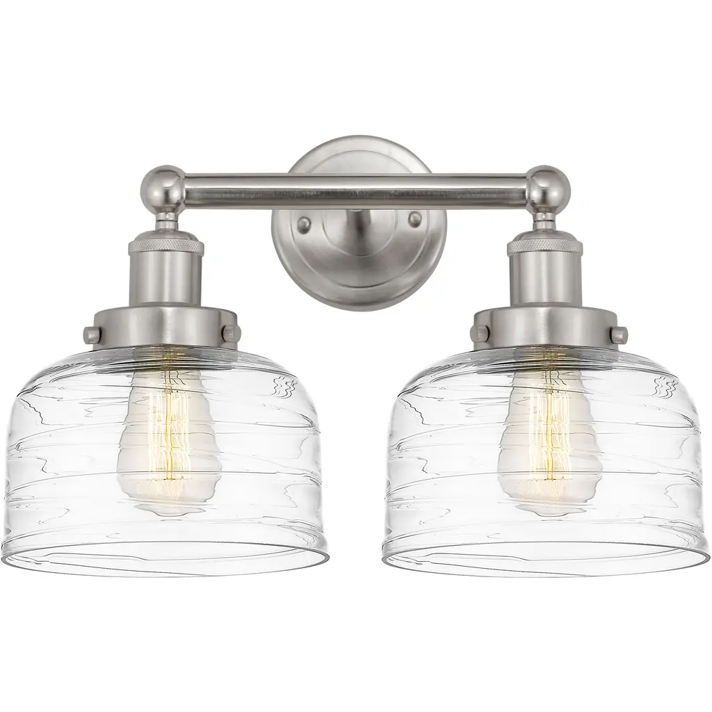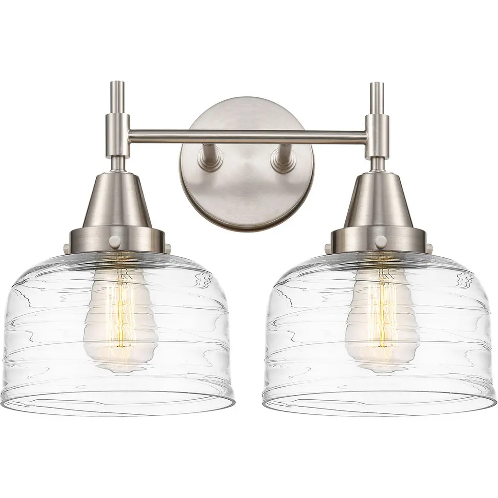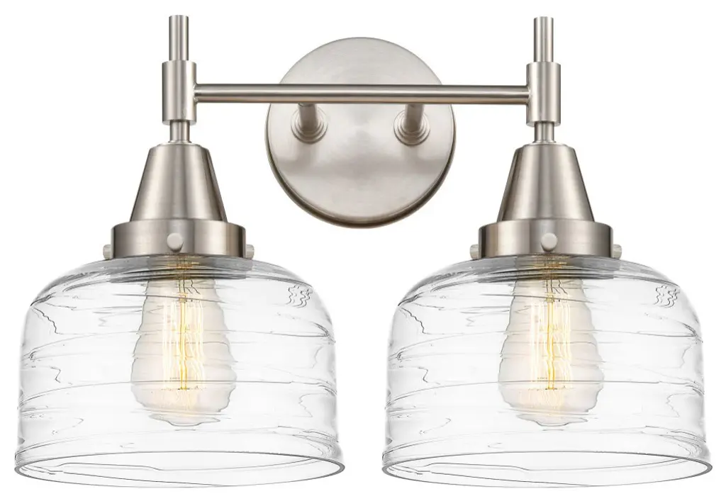 Innovations 447-2W-SN-G713 2-Light Bath Vanity Light Satin Nickel. Style: Retro, Industrial. Metal Finish: Satin Nickel. Metal Finish (Canopy/Backplate): Satin Nickel. Material: Steel, Glass. Dimension(in): 11(H) x 17(W) x 9. 25(Ext). Bulb: (2)60W Medium Base,Dimmable(Not Included). Maximum Wattage Per Socket: 100. Voltage: 120. Color Temperature (Kelvin): 2200. CRI: 99. 9. Lumens: 220. Glass Shade Description: Clear Deco Swirl Large Bell. Glass or Metal Shade Color: Clear Deco Swirl. Shade Material: Glass. Glass Type: Transparent. Shade Shape: Bell. Shade Dimension(in): 8(W) x 5. 75(H). Fitter Measurement (Glass Or Metal Shade Fitter Size): 3. 25 inch Fitter. Backplate Dimension(in): 5. 25(Dia) x 0. 875(Depth). ADA Compliant: No. California Proposition 65 Warning Required: Yes. UL and ETL Certification: Damp Location.