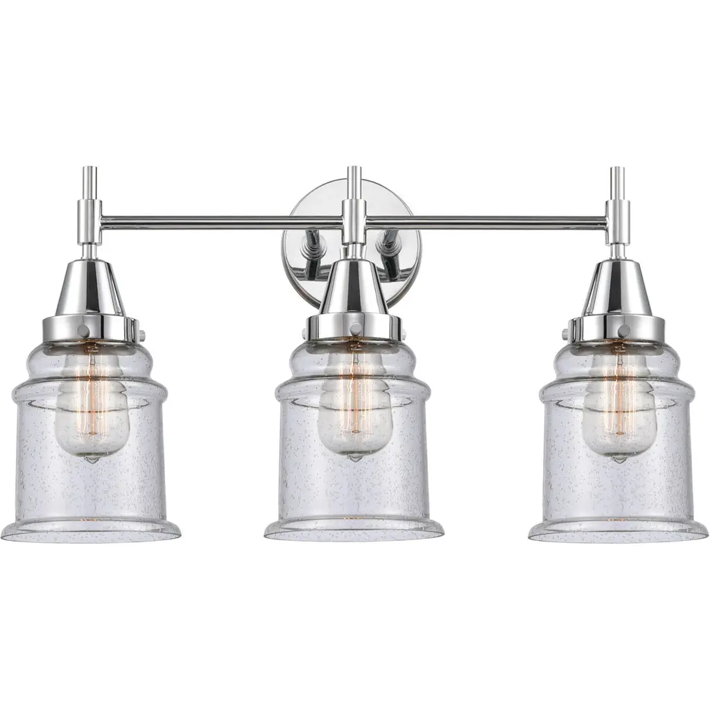 Innovations 447-3W-SG-G184 3-Light Bath Vanity Light Satin Gold. Style: Retro, Industrial. Metal Finish: Satin Gold. Metal Finish (Canopy/Backplate): Satin Gold. Material: Steel, Glass. Dimension(in): 12. 5(H) x 24(W) x 8. 25(Ext). Bulb: (3)60W Medium Base,Dimmable(Not Included). Maximum Wattage Per Socket: 100. Voltage: 120. Color Temperature (Kelvin): 2200. CRI: 99. 9. Lumens: 220. Glass Shade Description: Seedy Canton. Glass or Metal Shade Color: Seedy. Shade Material: Glass. Glass Type: Seeded. Shade Shape: Bell. Shade Dimension(in): 6(W) x 7. 25(H). Fitter Measurement (Glass Or Metal Shade Fitter Size): 3. 25 inch Fitter. Backplate Dimension(in): 5. 25(Dia) x 0. 875(Depth). ADA Compliant: No. California Proposition 65 Warning Required: Yes. UL and ETL Certification: Damp Location.