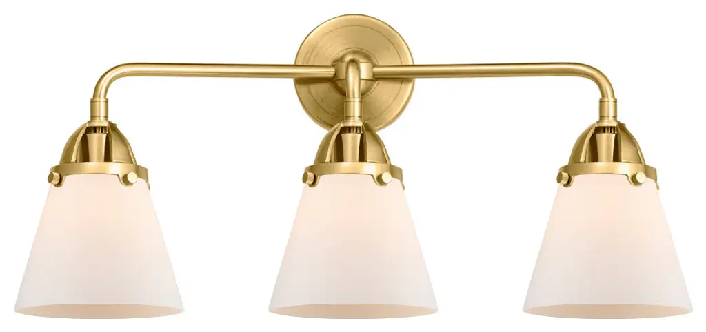 Innovations 447-3W-SG-G61 3-Light Bath Vanity Light Satin Gold. Style: Retro, Industrial. Metal Finish: Satin Gold. Metal Finish (Canopy/Backplate): Satin Gold. Material: Steel, Glass. Dimension(in): 11(H) x 24. 25(W) x 8. 375(Ext). Bulb: (3)60W Medium Base,Dimmable(Not Included). Maximum Wattage Per Socket: 100. Voltage: 120. Color Temperature (Kelvin): 2200. CRI: 99. 9. Lumens: 220. Glass Shade Description: Matte White Cased Small Cone. Glass or Metal Shade Color: Matte White. Shade Material: Glass. Glass Type: Frosted. Shade Shape: Cone. Shade Dimension(in): 6. 25(W) x 5. 75(H). Fitter Measurement (Glass Or Metal Shade Fitter Size): 3. 25 inch Fitter. Backplate Dimension(in): 5. 25(Dia) x 0. 875(Depth). ADA Compliant: No. California Proposition 65 Warning Required: Yes. UL and ETL Certification: Damp Location.