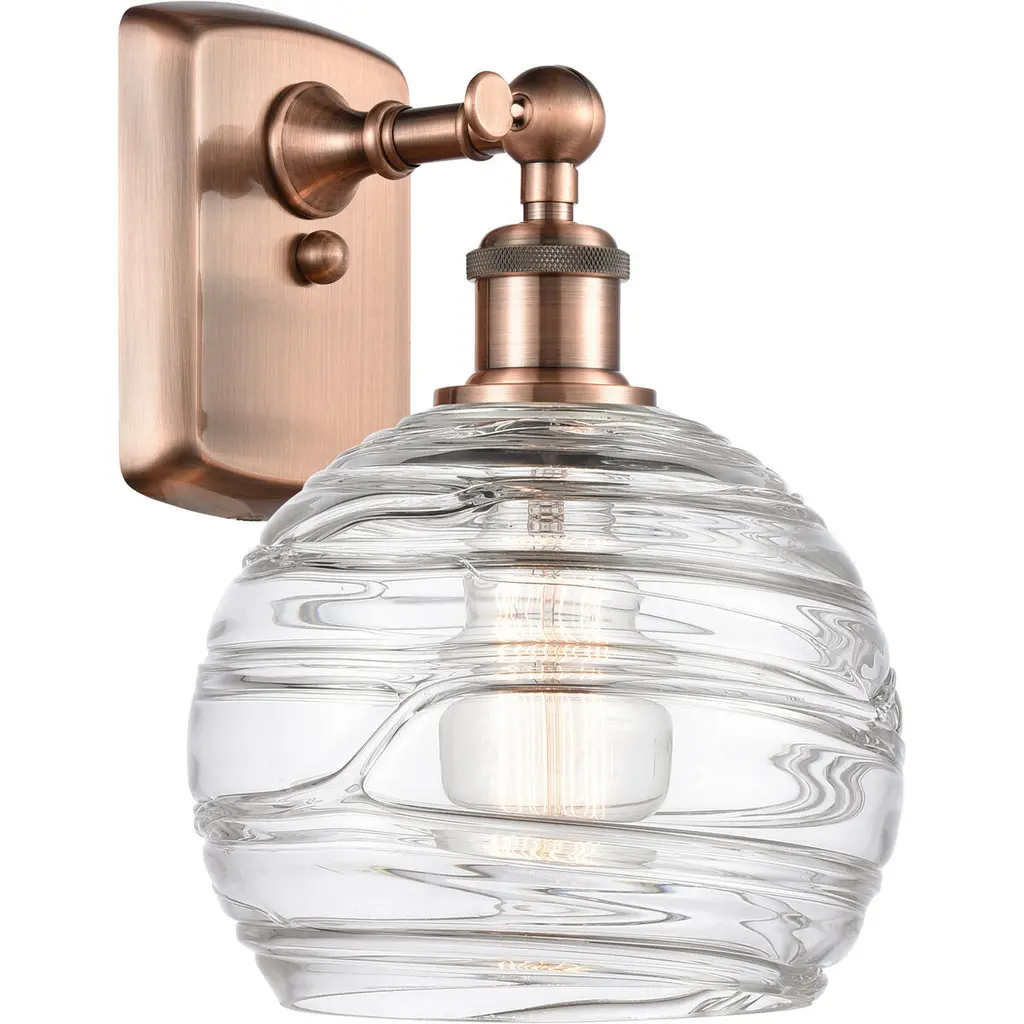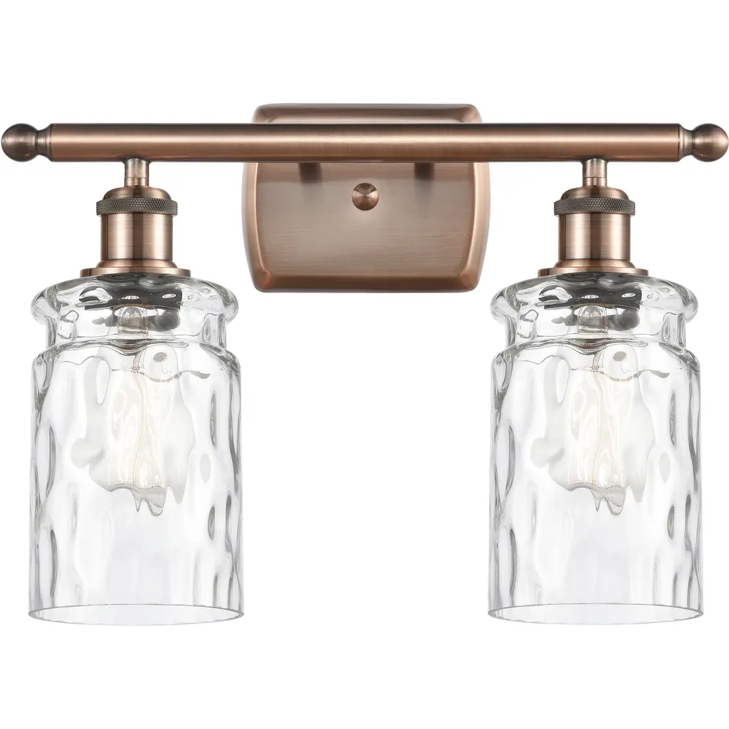 Innovations 516-2W-AC-G1215-6-LED Athens Water Glass 2 Light 16 inch Bath Vanity Light Antique Copper. Collection: Ballston. Style: Industrial, Modern Contempo, Restoration-Vintage, Transitional. Metal Finish: Antique Copper. Metal Finish(Canopy/Backplate): Antique Copper. Material: Steel, Cast Brass, Glass. Dimensions(in): 11(H) x 16(W) x 8(Ext). Bulb: (2)6W LED(Included). Maximum Wattage Per Socket: 100. Voltage: 120. Dimmable: Yes. Color Temperature (Kelvin): 2700. Color Rendering Index (CRI): 82. Lumens: 600. Life Expectancy (Hours): 15000. Glass Shade Description: Clear Athens Water Glass 6". Glass Type: Transparent. Shade Shape: Globe/Orb. Glass or Metal Shade Color: Clear Water Glass. Shade Material: Glass. Shade Dimensions(in): 6(W) x 5(H). Fitter Measurement (Glass or Metal Shade Fitter Size): Neckless with a 2.125 inch Hole. Backplate Dimenisons(in): 4.5(H) x 6(W) x 0.75(Depth). Mounting Center to Top: 2.25. Reversible (Can be hung with bulbs facing uo or down): Yes. California Proposition 65 Warning Required: Yes. UL and ETL Certification: Damp Location.