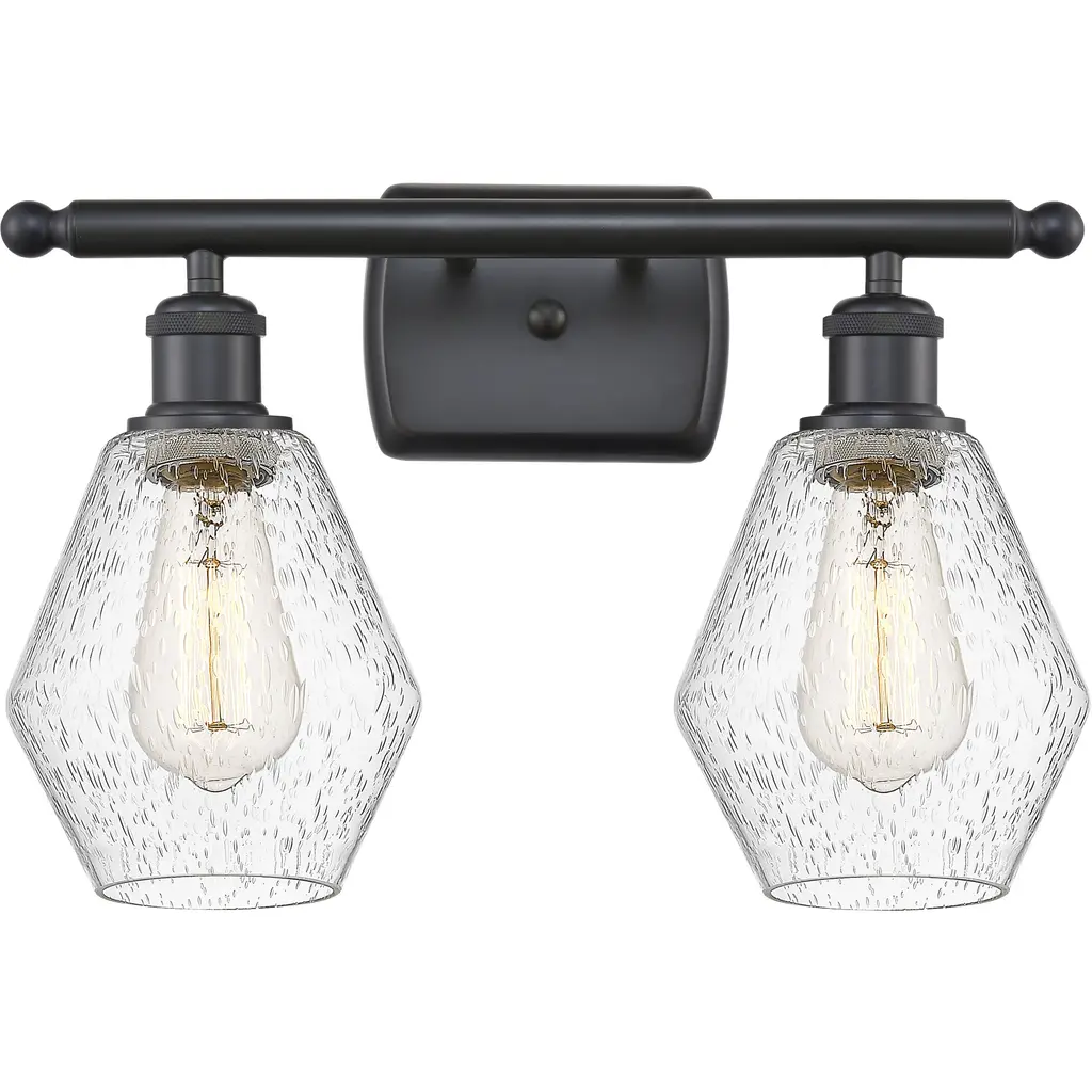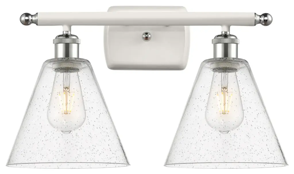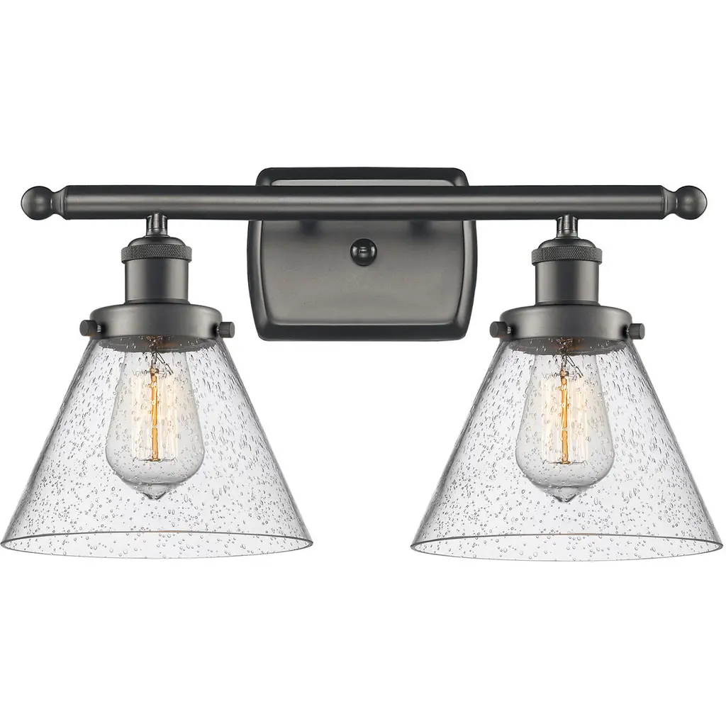 Innovations 516-2W-BK-GBC-84-LED Ballston Cone 2 Light 18 inch Bath Vanity Light Matte Black. Collection: Ballston. Style: Industrial, Modern Contempo, Restoration-Vintage, Transitional. Metal Finish: Matte Black. Metal Finish(Canopy/Backplate): Matte Black. Material: Steel, Cast Brass, Glass. Dimensions(in): 11.25(H) x 18(W) x 8.125(Ext). Bulb: (2)6W LED(Included). Maximum Wattage Per Socket: 100. Voltage: 120. Dimmable: Yes. Color Temperature (Kelvin): 2700. Color Rendering Index (CRI): 82. Lumens: 600. Life Expectancy (Hours): 15000. Glass Shade Description: Seedy Ballston Cone. Glass Type: Seeded. Shade Shape: Cone. Glass or Metal Shade Color: Seedy. Shade Material: Glass. Shade Dimensions(in): 8(W) x 7(H). Fitter Measurement (Glass or Metal Shade Fitter Size): Neckless with a 2.125 inch Hole. Backplate Dimenisons(in): 4.5(H) x 6(W) x 0.75(Depth). Mounting Center to Top: 2.25. Reversible (Can be hung with bulbs facing uo or down): Yes. California Proposition 65 Warning Required: Yes. UL and ETL Certification: Damp Location.