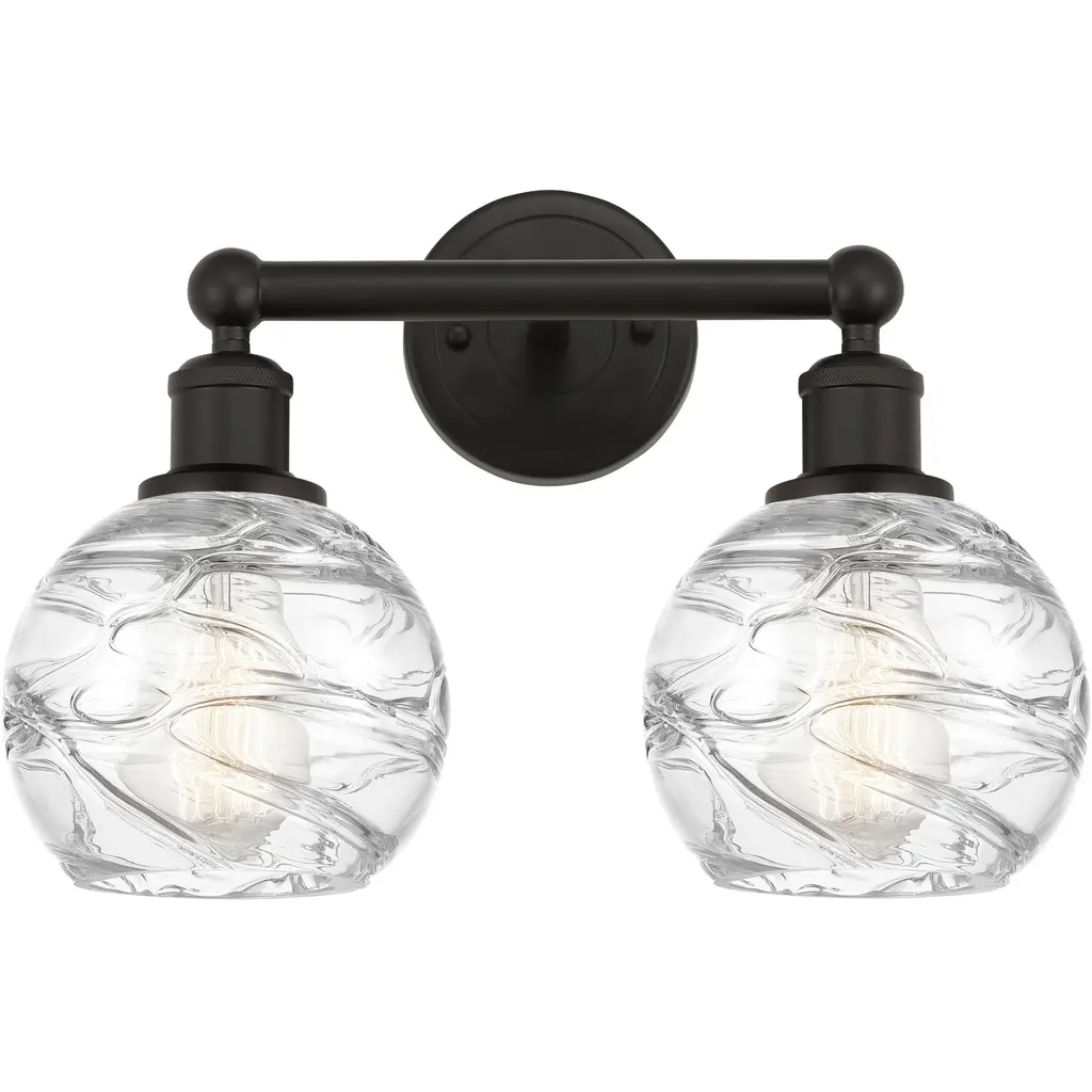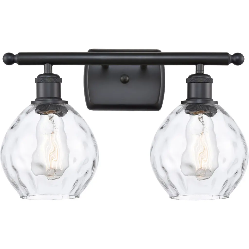 Innovations 516-2W-OB-G1215-6-LED Athens Water Glass 2 Light 16 inch Bath Vanity Light Oil Rubbed Bronze. Collection: Ballston. Style: Industrial, Modern Contempo, Restoration-Vintage, Transitional. Metal Finish: Oil Rubbed Bronze. Metal Finish(Canopy/Backplate): Oil Rubbed Bronze. Material: Steel, Cast Brass, Glass. Dimensions(in): 11(H) x 16(W) x 8(Ext). Bulb: (2)6W LED(Included). Maximum Wattage Per Socket: 100. Voltage: 120. Dimmable: Yes. Color Temperature (Kelvin): 2700. Color Rendering Index (CRI): 82. Lumens: 600. Life Expectancy (Hours): 15000. Glass Shade Description: Clear Athens Water Glass 6". Glass Type: Transparent. Shade Shape: Globe/Orb. Glass or Metal Shade Color: Clear Water Glass. Shade Material: Glass. Shade Dimensions(in): 6(W) x 5(H). Fitter Measurement (Glass or Metal Shade Fitter Size): Neckless with a 2.125 inch Hole. Backplate Dimenisons(in): 4.5(H) x 6(W) x 0.75(Depth). Mounting Center to Top: 2.25. Reversible (Can be hung with bulbs facing uo or down): Yes. California Proposition 65 Warning Required: Yes. UL and ETL Certification: Damp Location.
