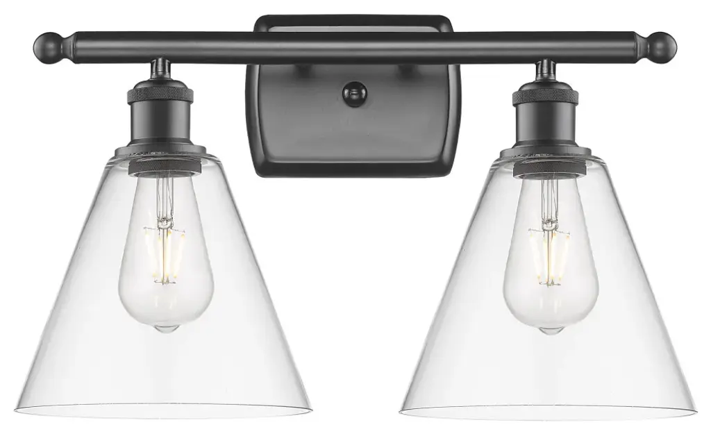 Innovations 516-2W-OB-GBC-82 Ballston Cone 2 Light 18 inch Bath Vanity Light Oil Rubbed Bronze. Collection: Ballston. Style: Industrial, Modern Contempo, Restoration-Vintage, Transitional. Metal Finish: Oil Rubbed Bronze. Metal Finish(Canopy/Backplate): Oil Rubbed Bronze. Material: Steel, Cast Brass, Glass. Dimensions(in): 11.25(H) x 18(W) x 8.125(Ext). Bulb: (2)60W Medium Base Incandescent(Not Included). Maximum Wattage Per Socket: 100. Voltage: 120. Dimmable: Yes. Color Temperature (Kelvin): 2200. Color Rendering Index (CRI): 99.9. Lumens: 220. Life Expectancy (Hours): 2000. Glass Shade Description: Clear Ballston Cone. Glass Type: Transparent. Shade Shape: Cone. Glass or Metal Shade Color: Clear. Shade Material: Glass. Shade Dimensions(in): 8(W) x 7(H). Fitter Measurement (Glass or Metal Shade Fitter Size): Neckless with a 2.125 inch Hole. Backplate Dimenisons(in): 4.5(H) x 6(W) x 0.75(Depth). Mounting Center to Top: 2.25. Reversible (Can be hung with bulbs facing uo or down): Yes. California Proposition 65 Warning Required: Yes. UL and ETL Certification: Damp Location.