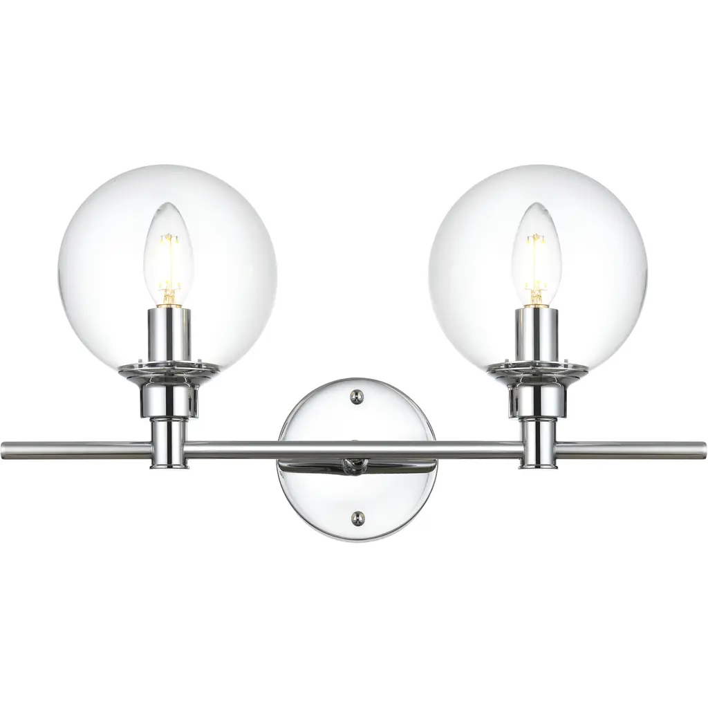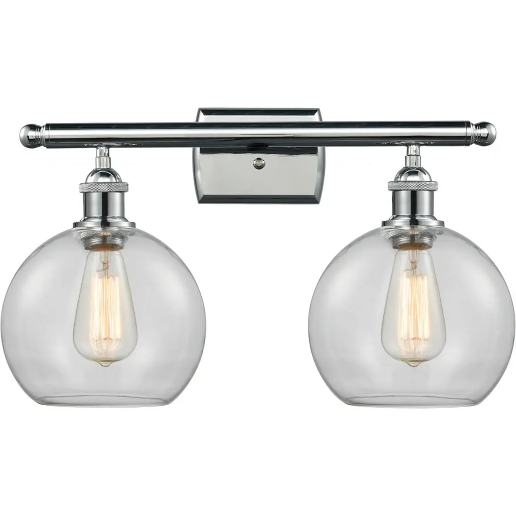 Innovations 516-2W-PC-G122-6-LED Athens 2 Light 16 inch Bath Vanity Light Polished Chrome. Collection: Ballston. Style: Industrial, Modern Contempo, Restoration-Vintage, Transitional. Metal Finish: Polished Chrome. Metal Finish(Canopy/Backplate): Polished Chrome. Material: Steel, Cast Brass, Glass. Dimensions(in): 9.375(H) x 16(W) x 7.125(Ext). Bulb: (2)6W LED(Included). Maximum Wattage Per Socket: 100. Voltage: 120. Dimmable: Yes. Color Temperature (Kelvin): 2700. Color Rendering Index (CRI): 82. Lumens: 600. Life Expectancy (Hours): 15000. Glass Shade Description: Clear Athens. Glass Type: Transparent. Shade Shape: Globe/Orb. Glass or Metal Shade Color: Clear. Shade Material: Glass. Shade Dimensions(in): 6(W) x 5.125(H). Fitter Measurement (Glass or Metal Shade Fitter Size): Neckless with a 2.125 inch Hole. Backplate Dimenisons(in): 4.5(H) x 6(W) x 0.75(Depth). Mounting Center to Top: 2.25. Reversible (Can be hung with bulbs facing uo or down): Yes. California Proposition 65 Warning Required: Yes. UL and ETL Certification: Damp Location.