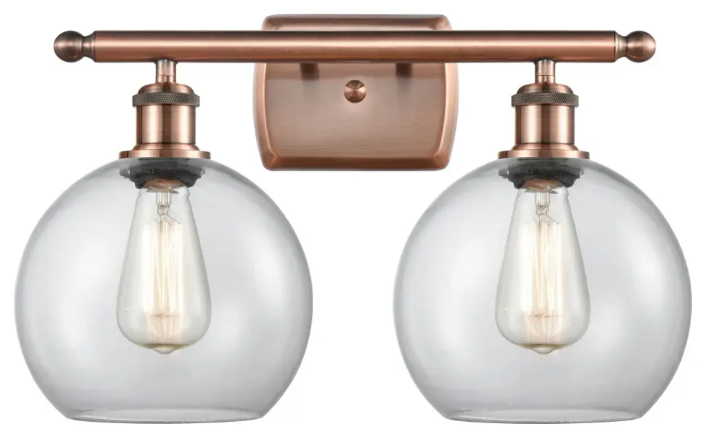 Innovations 516-2W-SG-G122-6-LED Athens 2 Light 16 inch Bath Vanity Light Satin Gold. Collection: Ballston. Style: Industrial, Modern Contempo, Restoration-Vintage, Transitional. Metal Finish: Satin Gold. Metal Finish(Canopy/Backplate): Satin Gold. Material: Steel, Cast Brass, Glass. Dimensions(in): 9.375(H) x 16(W) x 7.125(Ext). Bulb: (2)6W LED(Included). Maximum Wattage Per Socket: 100. Voltage: 120. Dimmable: Yes. Color Temperature (Kelvin): 2700. Color Rendering Index (CRI): 82. Lumens: 600. Life Expectancy (Hours): 15000. Glass Shade Description: Clear Athens. Glass Type: Transparent. Shade Shape: Globe/Orb. Glass or Metal Shade Color: Clear. Shade Material: Glass. Shade Dimensions(in): 6(W) x 5.125(H). Fitter Measurement (Glass or Metal Shade Fitter Size): Neckless with a 2.125 inch Hole. Backplate Dimenisons(in): 4.5(H) x 6(W) x 0.75(Depth). Mounting Center to Top: 2.25. Reversible (Can be hung with bulbs facing uo or down): Yes. California Proposition 65 Warning Required: Yes. UL and ETL Certification: Damp Location.