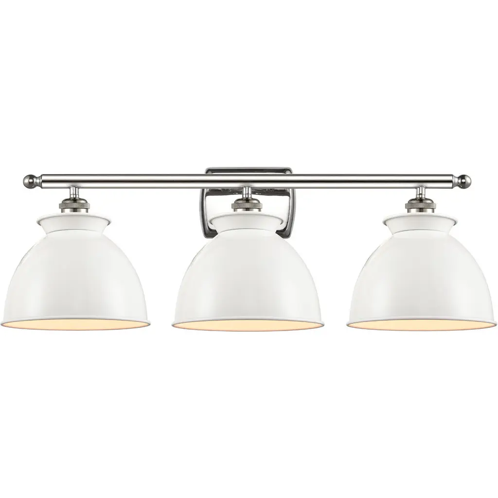 Innovations 516-2W-SN-M14-W Adirondack 2 Light Bath Vanity Light part of the Ballston Collection Brushed Satin Nickel. Collection: Ballston. Style: Industrial, Farmhouse, Restoration-Vintage. Metal Finish: Brushed Satin Nickel. Metal Finish(Shade): Glossy White. Metal Finish(Canopy/Backplate): Brushed Satin Nickel. Material: Steel, Cast Brass. Dimensions(in): 12(H) x 18(W) x 10(Ext). Bulb: (2)60W Medium Base Incandescent(Not Included). Maximum Wattage Per Socket: 100. Voltage: 120. Dimmable: Yes. Color Temperature (Kelvin): 2200. Color Rendering Index (CRI): 99.9. Lumens: 220. Life Expectancy (Hours): 2000. Shade Shape: Dome. Glass or Metal Shade Color: Glossy White. Shade Material: Metal. Metal Shade Description: White Adirondack. Shade Dimensions(in): 8.25(W) x 5.5(H). Fitter Measurement (Glass or Metal Shade Fitter Size): Neckless with a 2.125 inch Hole. Backplate Dimenisons(in): 4.5(H) x 6(W) x 0.75(Depth). Mounting Center to Top: 2.25. Reversible (Can be hung with bulbs facing uo or down): Yes. California Proposition 65 Warning Required: Yes. UL and ETL Certification: Damp Location.