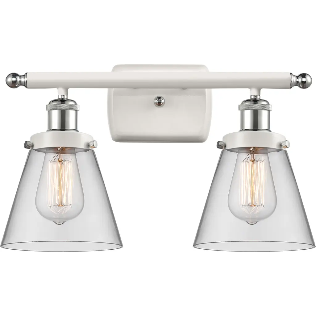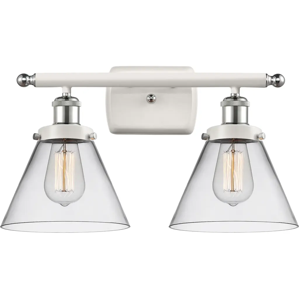 Innovations 516-2W-WPC-GBC-82 Ballston Cone 2 Light 18 inch Bath Vanity Light White and Polished Chrome. Collection: Ballston. Style: Industrial, Modern Contempo, Restoration-Vintage, Transitional. Metal Finish: White and Polished Chrome. Metal Finish(Canopy/Backplate): White. Accent Color: Polished Chrome. Material: Steel, Cast Brass, Glass. Dimensions(in): 11.25(H) x 18(W) x 8.125(Ext). Bulb: (2)60W Medium Base Incandescent(Not Included). Maximum Wattage Per Socket: 100. Voltage: 120. Dimmable: Yes. Color Temperature (Kelvin): 2200. Color Rendering Index (CRI): 99.9. Lumens: 220. Life Expectancy (Hours): 2000. Glass Shade Description: Clear Ballston Cone. Glass Type: Transparent. Shade Shape: Cone. Glass or Metal Shade Color: Clear. Shade Material: Glass. Shade Dimensions(in): 8(W) x 7(H). Fitter Measurement (Glass or Metal Shade Fitter Size): Neckless with a 2.125 inch Hole. Backplate Dimenisons(in): 4.5(H) x 6(W) x 0.75(Depth). Mounting Center to Top: 2.25. ADA Compliant: No. Reversible (Can be hung with bulbs facing uo or down): Yes. California Proposition 65 Warning Required: Yes. UL and ETL Certification: Damp Location.