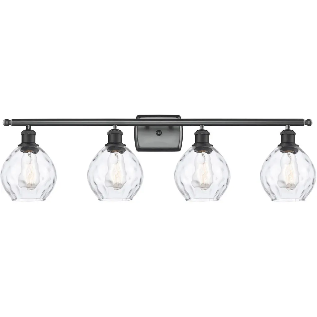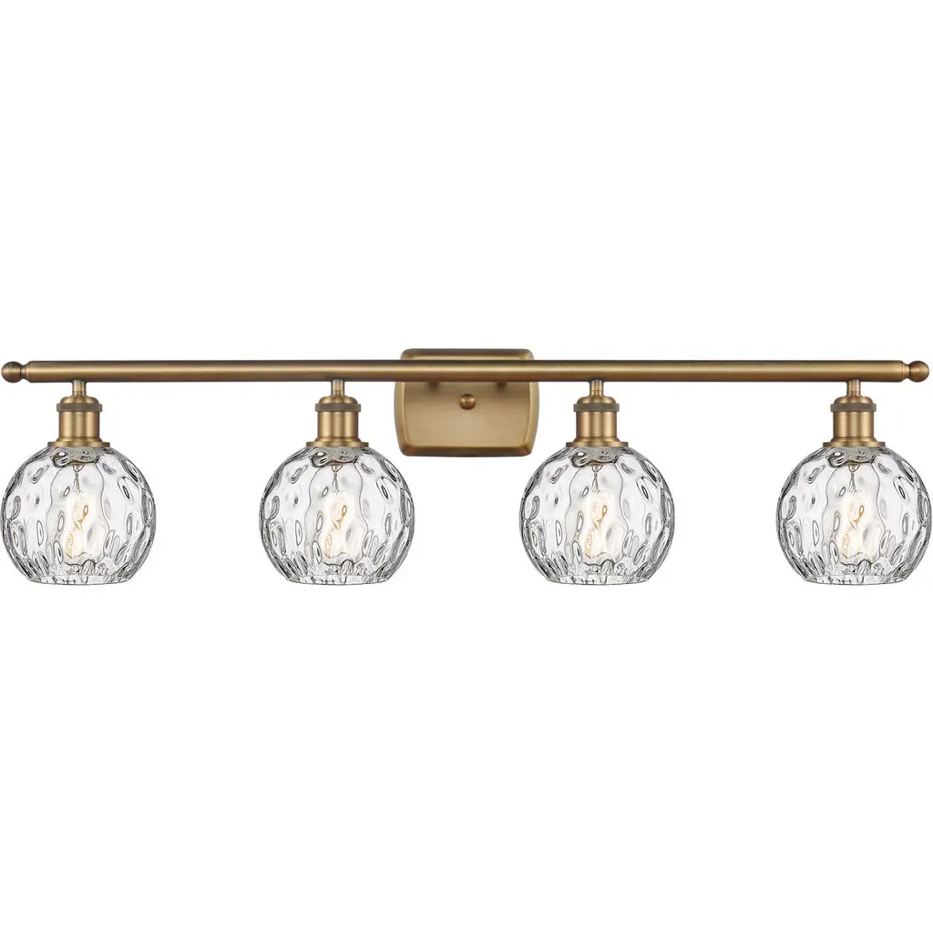 Innovations 516-4W-BAB-G1215-6-LED Athens Water Glass 4 Light 36 inch Bath Vanity Light Black Antique Brass. Collection: Ballston. Style: Industrial, Modern Contempo, Restoration-Vintage, Transitional. Metal Finish: Black Antique Brass. Metal Finish(Canopy/Backplate): Black Antique Brass. Material: Steel, Cast Brass, Glass. Dimensions(in): 9(H) x 36(W) x 7(Ext). Bulb: (4)6W LED(Included). Maximum Wattage Per Socket: 100. Voltage: 120. Dimmable: Yes. Color Temperature (Kelvin): 2700. Color Rendering Index (CRI): 82. Lumens: 600. Life Expectancy (Hours): 15000. Glass Shade Description: Clear Athens Water Glass 6". Glass Type: Transparent. Shade Shape: Globe/Orb. Glass or Metal Shade Color: Clear Water Glass. Shade Material: Glass. Shade Dimensions(in): 6(W) x 5(H). Fitter Measurement (Glass or Metal Shade Fitter Size): Neckless with a 2.125 inch Hole. Backplate Dimenisons(in): 4.5(H) x 6(W) x 0.75(Depth). Mounting Center to Top: 2.25. Reversible (Can be hung with bulbs facing uo or down): Yes. California Proposition 65 Warning Required: Yes. UL and ETL Certification: Damp Location.