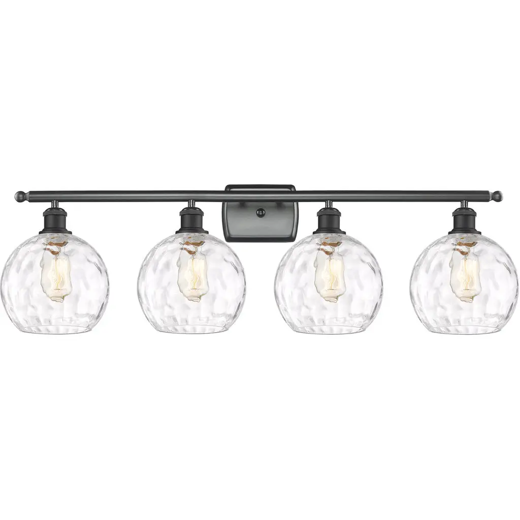 Innovations 516-4W-BK-G1215-8-LED Athens Water Glass 4 Light 36 inch Bath Vanity Light Matte Black. Collection: Ballston. Style: Industrial, Modern Contempo, Restoration-Vintage, Transitional. Metal Finish: Matte Black. Metal Finish(Canopy/Backplate): Matte Black. Material: Steel, Cast Brass, Glass. Dimensions(in): 11(H) x 36(W) x 8(Ext). Bulb: (4)6W LED(Included). Maximum Wattage Per Socket: 100. Voltage: 120. Dimmable: Yes. Color Temperature (Kelvin): 2700. Color Rendering Index (CRI): 82. Lumens: 600. Life Expectancy (Hours): 15000. Glass Shade Description: Clear Athens Water Glass 8". Glass Type: Transparent. Shade Shape: Globe/Orb. Glass or Metal Shade Color: Clear Water Glass. Shade Material: Glass. Shade Dimensions(in): 8(W) x 7(H). Fitter Measurement (Glass or Metal Shade Fitter Size): Neckless with a 2.125 inch Hole. Backplate Dimenisons(in): 4.5(H) x 6(W) x 0.75(Depth). Mounting Center to Top: 2.25. Reversible (Can be hung with bulbs facing uo or down): Yes. California Proposition 65 Warning Required: Yes. UL and ETL Certification: Damp Location.