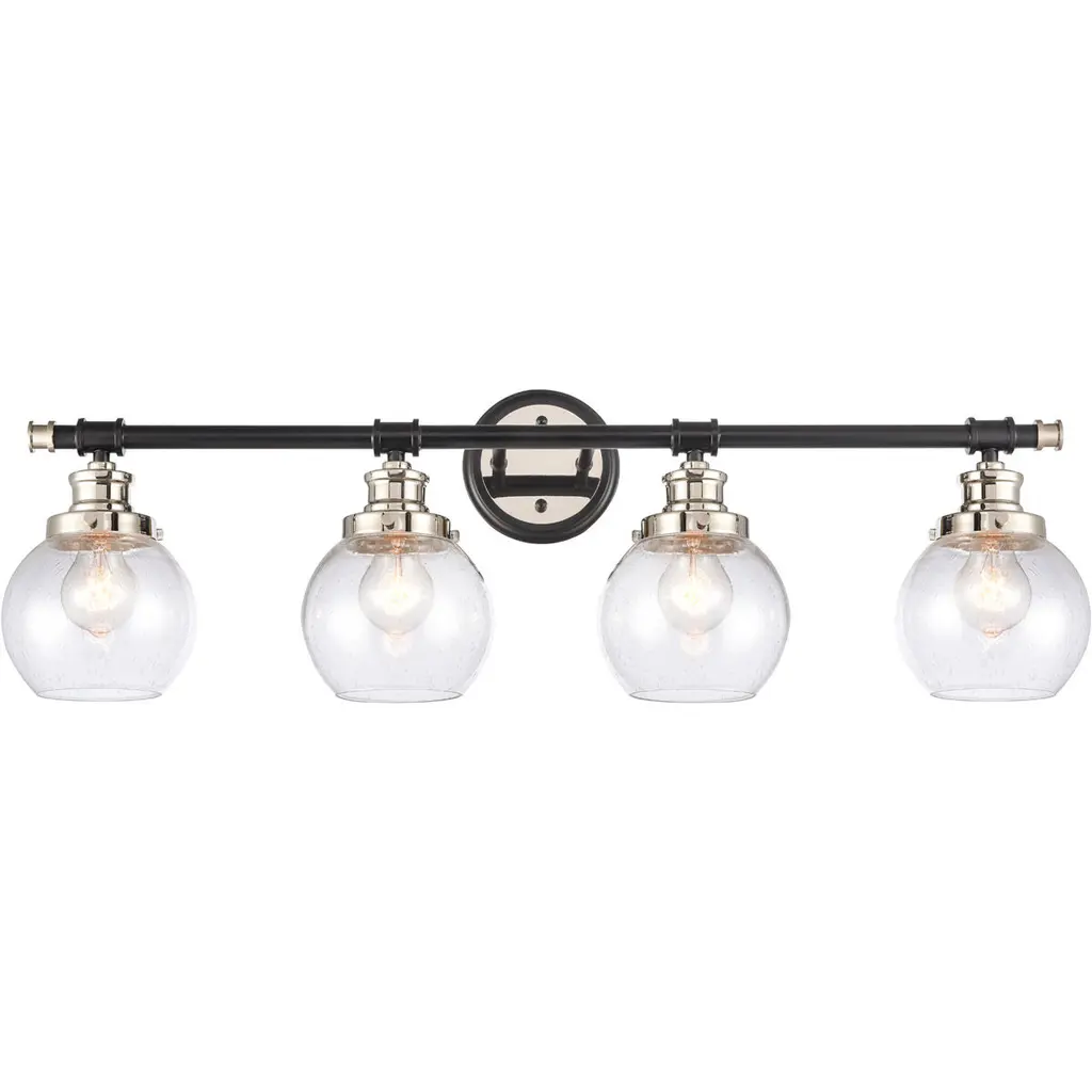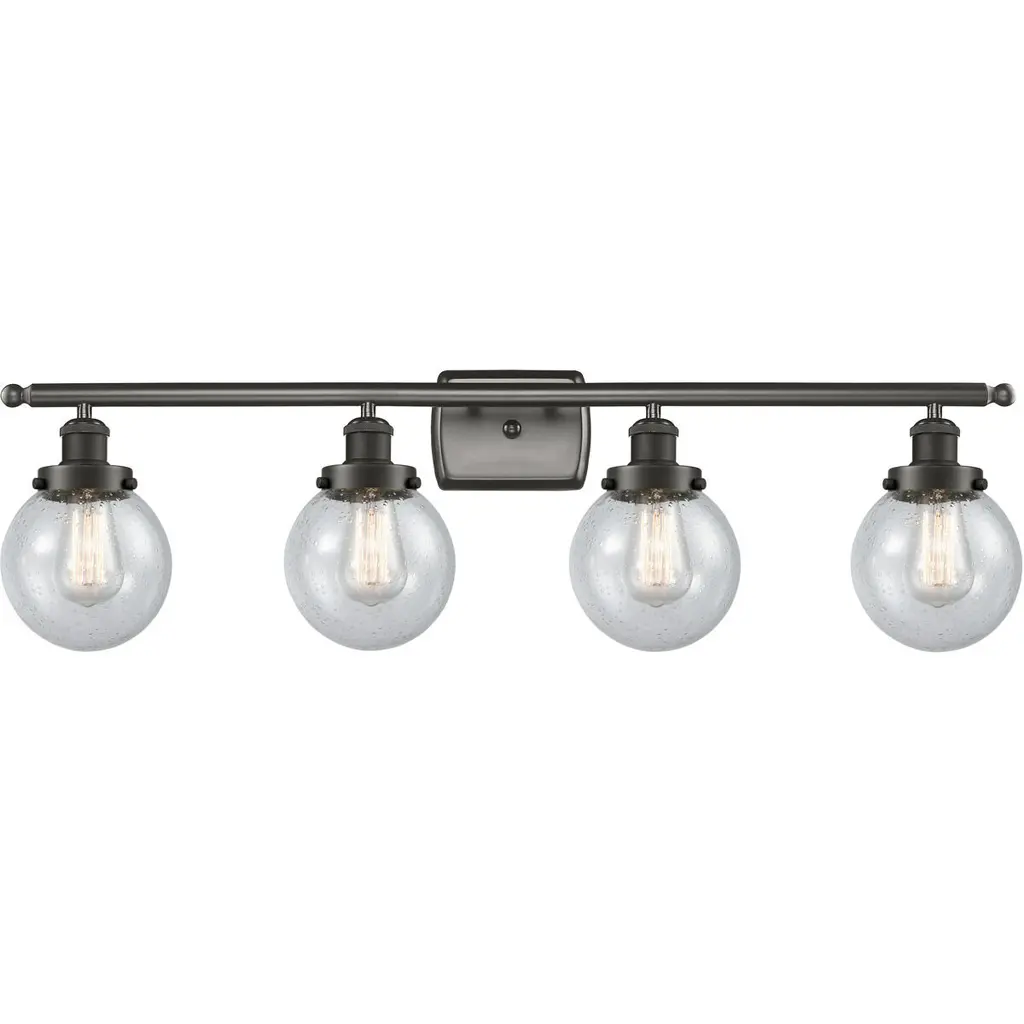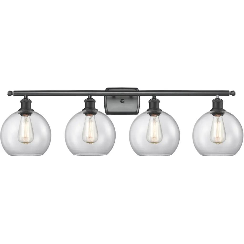Innovations 516-4W-OB-G122-6 Athens 4 Light 36 inch Bath Vanity Light Oil Rubbed Bronze. Collection: Ballston. Style: Industrial, Modern Contempo, Restoration-Vintage, Transitional. Metal Finish: Oil Rubbed Bronze. Metal Finish(Canopy/Backplate): Oil Rubbed Bronze. Material: Steel, Cast Brass, Glass. Dimensions(in): 9.375(H) x 36(W) x 7.125(Ext). Bulb: (4)60W Medium Base Incandescent(Not Included). Maximum Wattage Per Socket: 100. Voltage: 120. Dimmable: Yes. Color Temperature (Kelvin): 2200. Color Rendering Index (CRI): 99.9. Lumens: 220. Life Expectancy (Hours): 2000. Glass Shade Description: Clear Athens. Glass Type: Transparent. Shade Shape: Globe/Orb. Glass or Metal Shade Color: Clear. Shade Material: Glass. Shade Dimensions(in): 6(W) x 5.125(H). Fitter Measurement (Glass or Metal Shade Fitter Size): Neckless with a 2.125 inch Hole. Backplate Dimenisons(in): 4.5(H) x 6(W) x 0.75(Depth). Mounting Center to Top: 2.25. Reversible (Can be hung with bulbs facing uo or down): Yes. California Proposition 65 Warning Required: Yes. UL and ETL Certification: Damp Location.