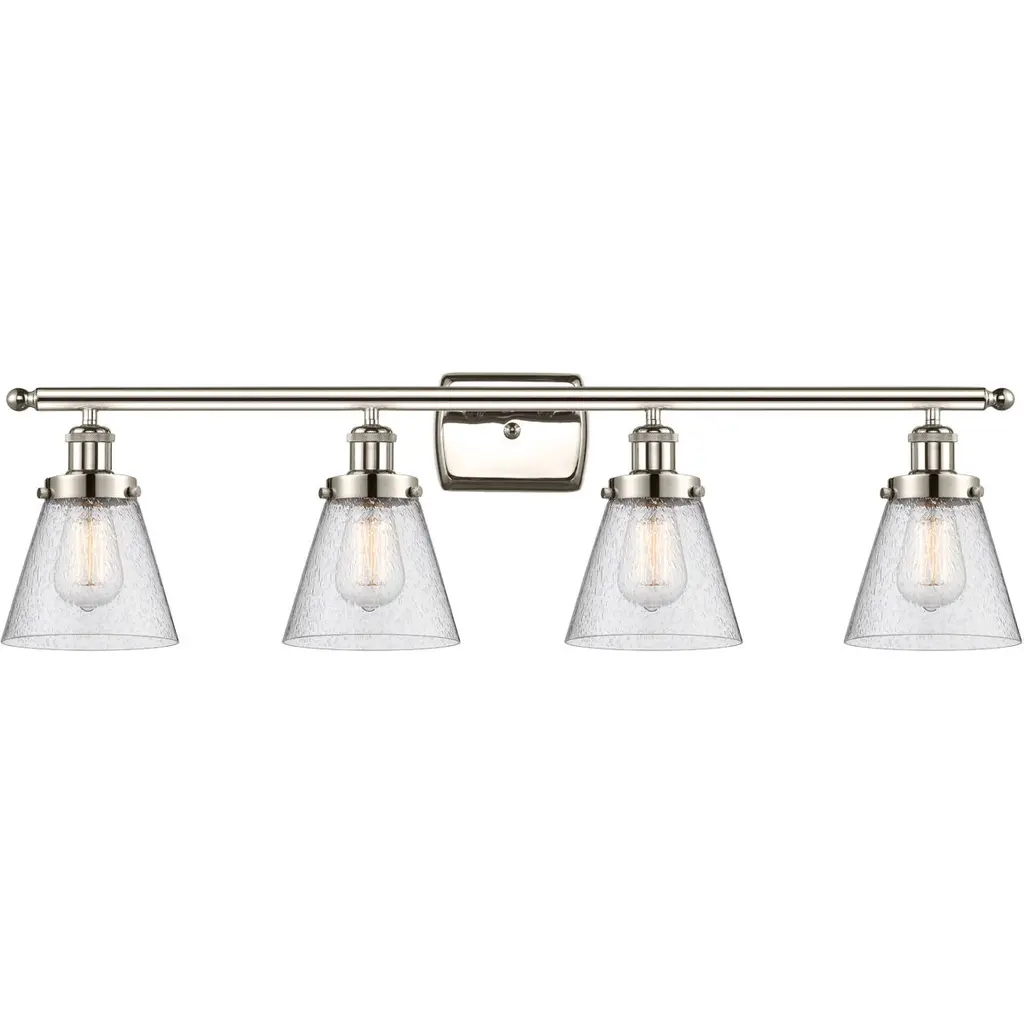 Innovations 516-4W-SN-GBC-82-LED Ballston Cone 4 Light 38 inch Bath Vanity Light Brushed Satin Nickel. Collection: Ballston. Style: Industrial, Modern Contempo, Restoration-Vintage, Transitional. Metal Finish: Brushed Satin Nickel. Metal Finish(Canopy/Backplate): Brushed Satin Nickel. Material: Steel, Cast Brass, Glass. Dimensions(in): 11.25(H) x 38(W) x 8.125(Ext). Bulb: (4)6W LED(Included). Maximum Wattage Per Socket: 100. Voltage: 120. Dimmable: Yes. Color Temperature (Kelvin): 2700. Color Rendering Index (CRI): 82. Lumens: 600. Life Expectancy (Hours): 15000. Glass Shade Description: Clear Ballston Cone. Glass Type: Transparent. Shade Shape: Cone. Glass or Metal Shade Color: Clear. Shade Material: Glass. Shade Dimensions(in): 8(W) x 7(H). Fitter Measurement (Glass or Metal Shade Fitter Size): Neckless with a 2.125 inch Hole. Backplate Dimenisons(in): 4.5(H) x 6(W) x 0.75(Depth). Mounting Center to Top: 2.25. Reversible (Can be hung with bulbs facing uo or down): Yes. California Proposition 65 Warning Required: Yes. UL and ETL Certification: Damp Location.
