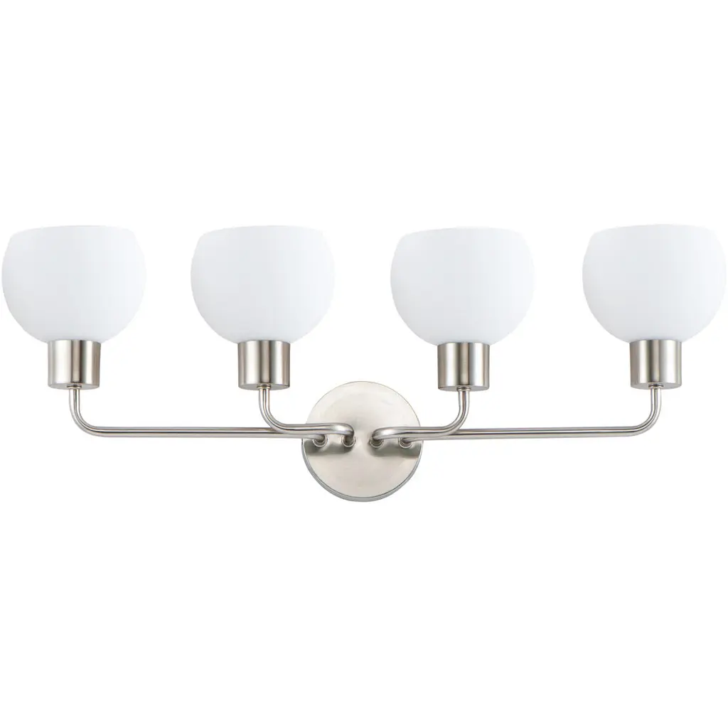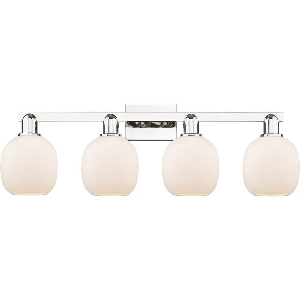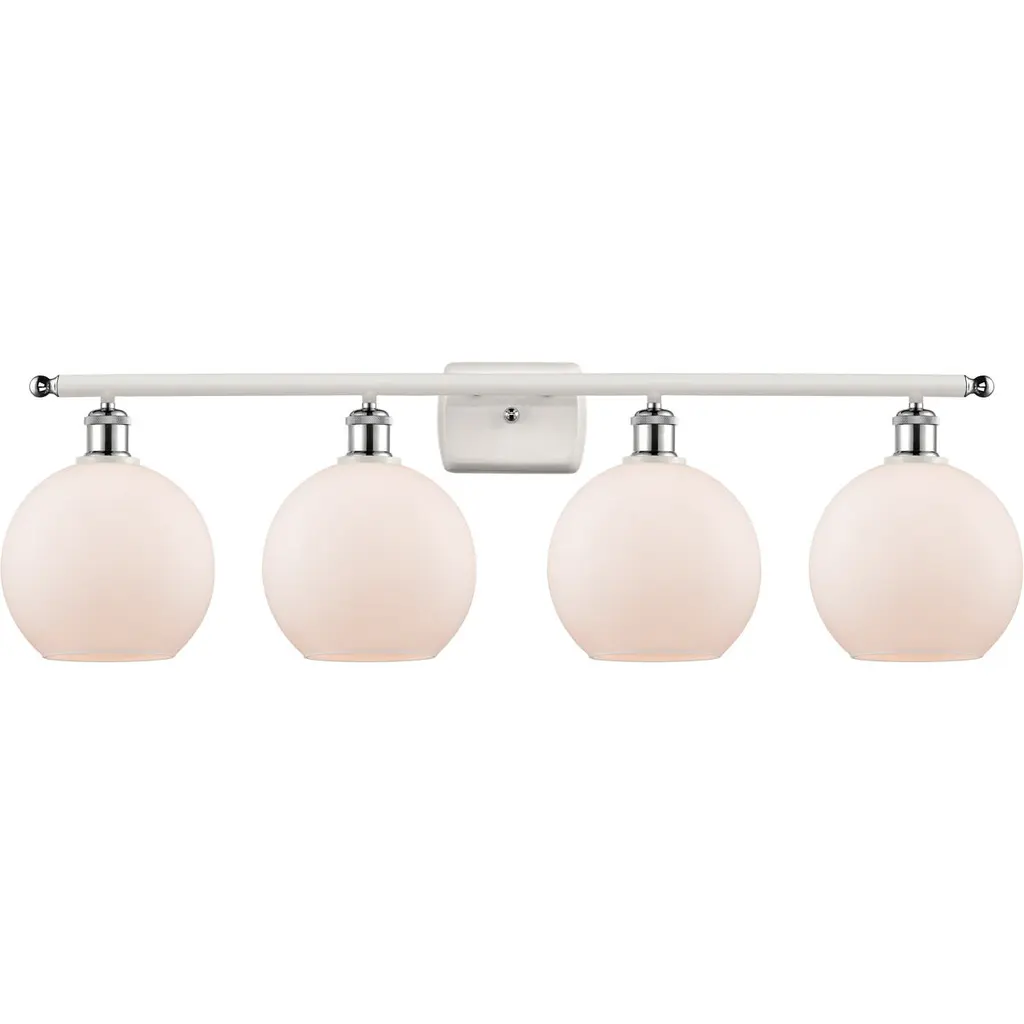 Innovations 516-4W-WPC-G121-6-LED Athens 4 Light 36 inch Bath Vanity Light White and Polished Chrome. Collection: Ballston. Style: Industrial, Modern Contempo, Restoration-Vintage, Transitional. Metal Finish: White and Polished Chrome. Metal Finish(Canopy/Backplate): White. Accent Color: Polished Chrome. Material: Steel, Cast Brass, Glass. Dimensions(in): 9.375(H) x 36(W) x 7.125(Ext). Bulb: (4)6W LED(Included). Maximum Wattage Per Socket: 100. Voltage: 120. Dimmable: Yes. Color Temperature (Kelvin): 2700. Color Rendering Index (CRI): 82. Lumens: 600. Life Expectancy (Hours): 15000. Glass Shade Description: Cased Matte White Athens. Glass Type: Frosted. Shade Shape: Globe/Orb. Glass or Metal Shade Color: Matte White. Shade Material: Glass. Shade Dimensions(in): 6(W) x 5.125(H). Fitter Measurement (Glass or Metal Shade Fitter Size): Neckless with a 2.125 inch Hole. Backplate Dimenisons(in): 4.5(H) x 6(W) x 0.75(Depth). Mounting Center to Top: 2.25. Reversible (Can be hung with bulbs facing uo or down): Yes. California Proposition 65 Warning Required: Yes. UL and ETL Certification: Damp Location.