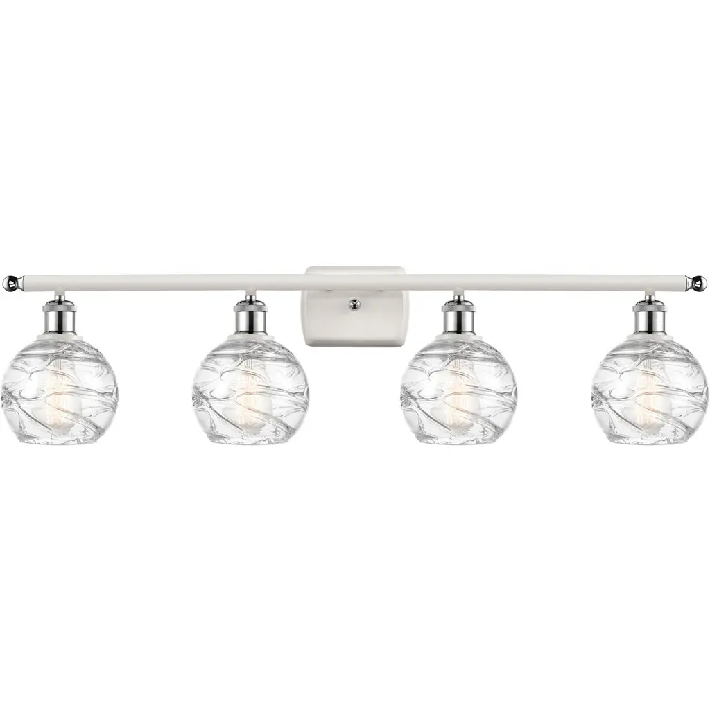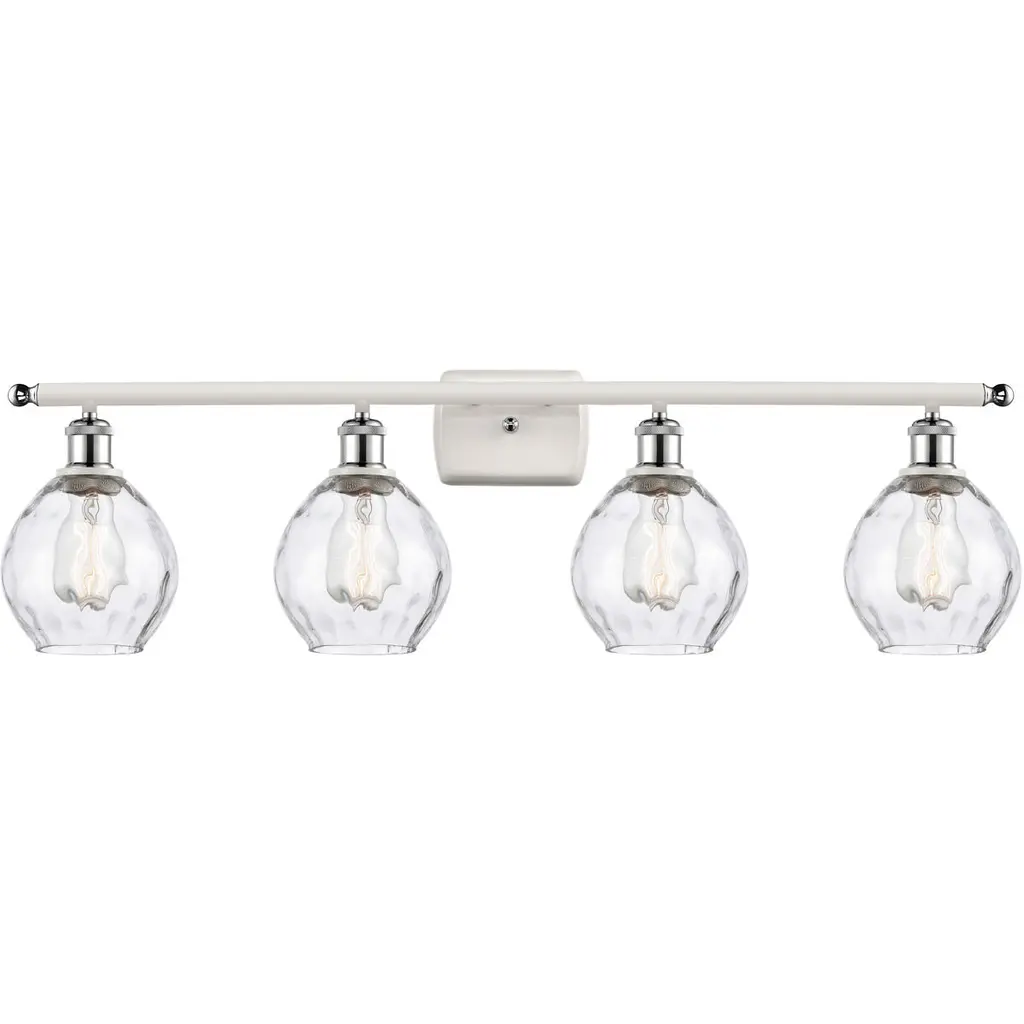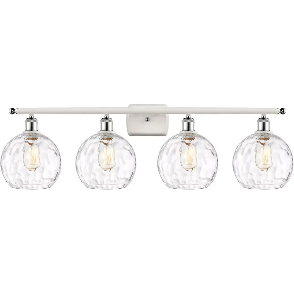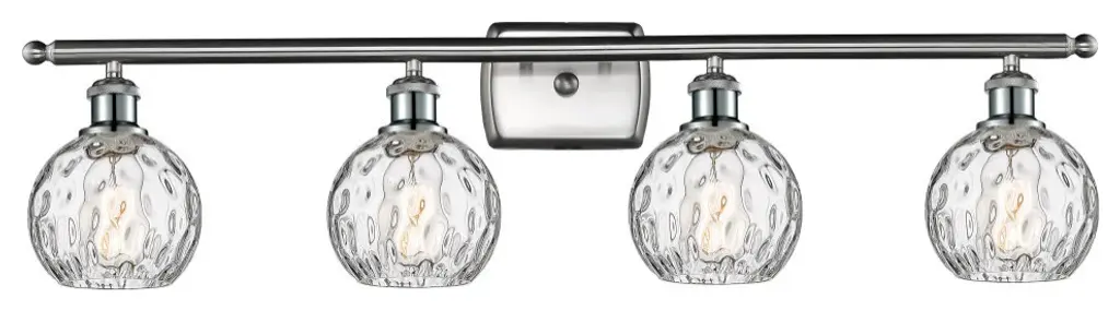 Innovations 516-4W-WPC-G1215-6 Athens Water Glass 4 Light 36 inch Bath Vanity Light White and Polished Chrome. Collection: Ballston. Style: Industrial, Modern Contempo, Restoration-Vintage, Transitional. Metal Finish: White and Polished Chrome. Metal Finish(Canopy/Backplate): White. Accent Color: Polished Chrome. Material: Steel, Cast Brass, Glass. Dimensions(in): 9(H) x 36(W) x 7(Ext). Bulb: (4)60W Medium Base Incandescent(Not Included). Maximum Wattage Per Socket: 100. Voltage: 120. Dimmable: Yes. Color Temperature (Kelvin): 2200. Color Rendering Index (CRI): 99.9. Lumens: 220. Life Expectancy (Hours): 2000. Glass Shade Description: Clear Athens Water Glass 6". Glass Type: Transparent. Shade Shape: Globe/Orb. Glass or Metal Shade Color: Clear Water Glass. Shade Material: Glass. Shade Dimensions(in): 6(W) x 5(H). Fitter Measurement (Glass or Metal Shade Fitter Size): Neckless with a 2.125 inch Hole. Backplate Dimenisons(in): 4.5(H) x 6(W) x 0.75(Depth). Mounting Center to Top: 2.25. ADA Compliant: No. Reversible (Can be hung with bulbs facing uo or down): Yes. California Proposition 65 Warning Required: Yes. UL and ETL Certification: Damp Location.