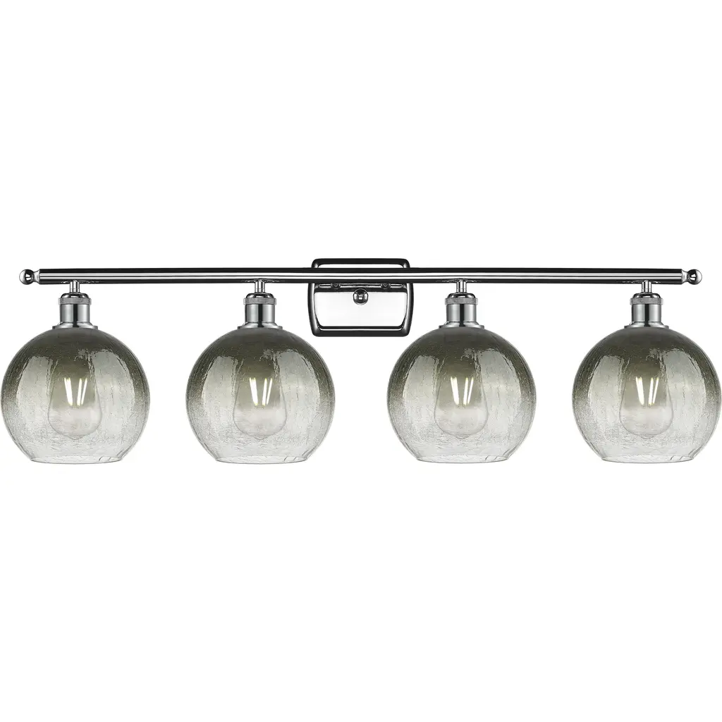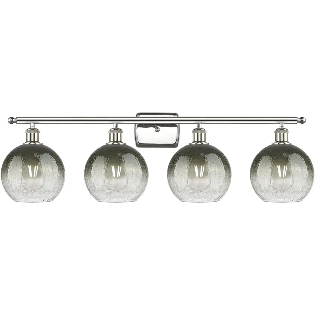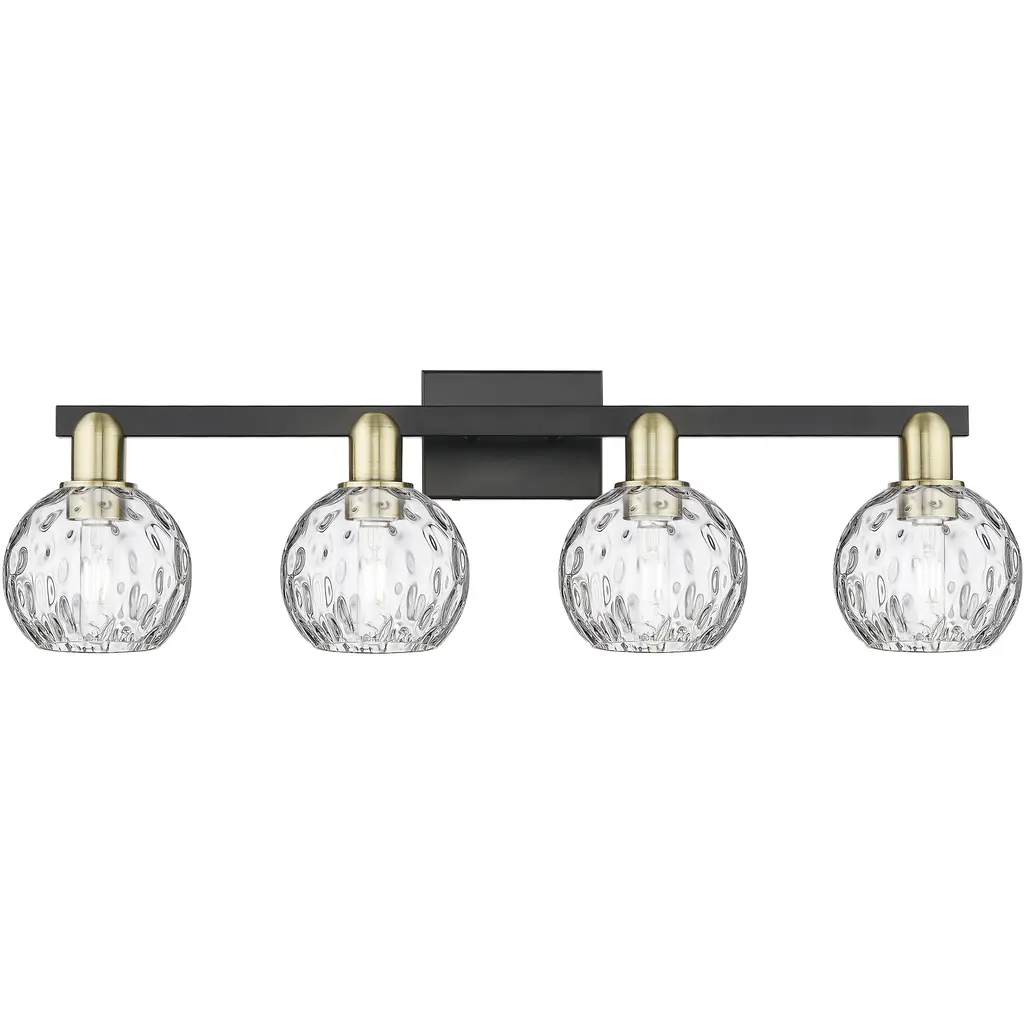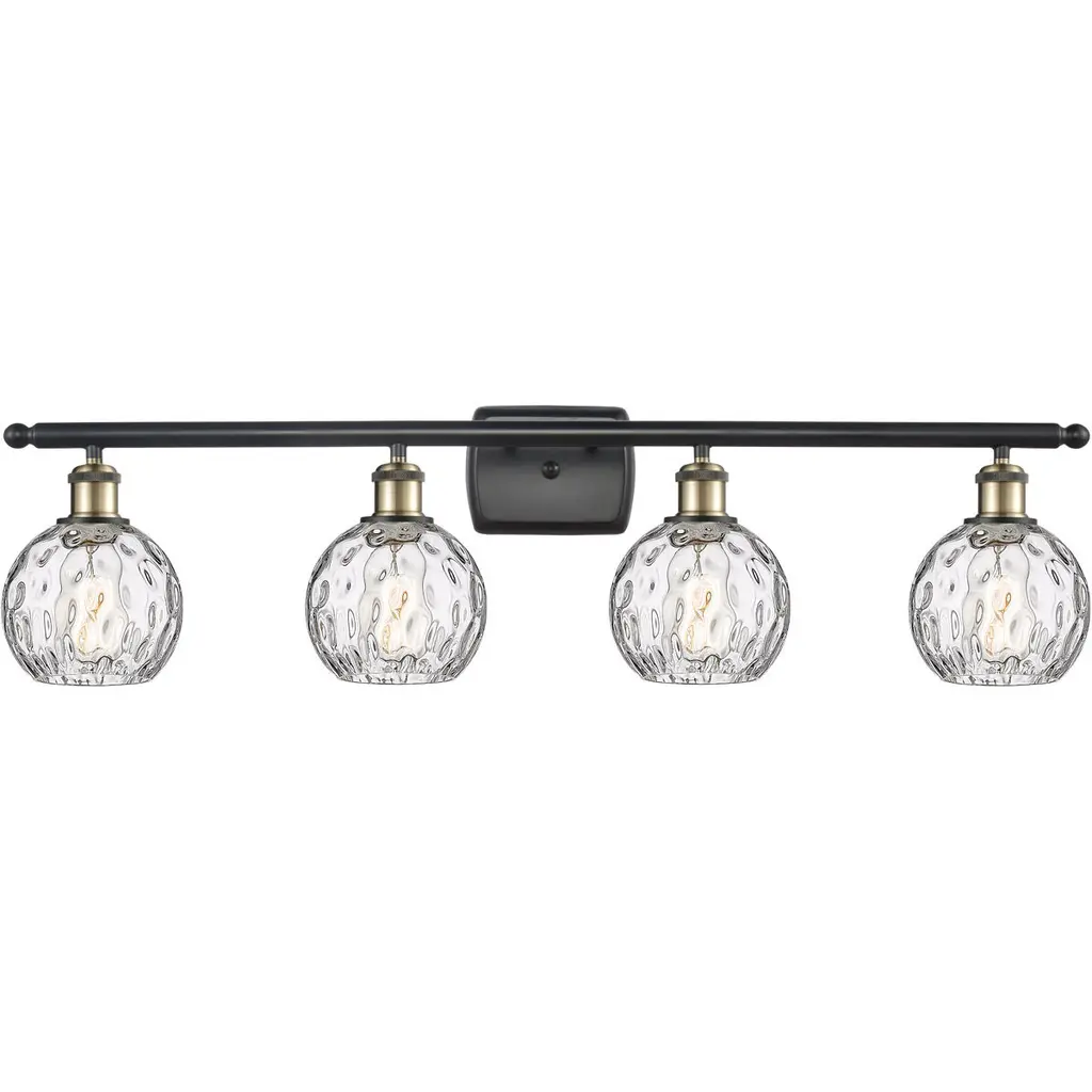 Innovations 516-4W-WPC-G1215-6 Athens Water Glass 4 Light 36 inch Bath Vanity Light White and Polished Chrome. Collection: Ballston. Style: Industrial, Modern Contempo, Restoration-Vintage, Transitional. Metal Finish: White and Polished Chrome. Metal Finish(Canopy/Backplate): White. Accent Color: Polished Chrome. Material: Steel, Cast Brass, Glass. Dimensions(in): 9(H) x 36(W) x 7(Ext). Bulb: (4)60W Medium Base Incandescent(Not Included). Maximum Wattage Per Socket: 100. Voltage: 120. Dimmable: Yes. Color Temperature (Kelvin): 2200. Color Rendering Index (CRI): 99.9. Lumens: 220. Life Expectancy (Hours): 2000. Glass Shade Description: Clear Athens Water Glass 6". Glass Type: Transparent. Shade Shape: Globe/Orb. Glass or Metal Shade Color: Clear Water Glass. Shade Material: Glass. Shade Dimensions(in): 6(W) x 5(H). Fitter Measurement (Glass or Metal Shade Fitter Size): Neckless with a 2.125 inch Hole. Backplate Dimenisons(in): 4.5(H) x 6(W) x 0.75(Depth). Mounting Center to Top: 2.25. ADA Compliant: No. Reversible (Can be hung with bulbs facing uo or down): Yes. California Proposition 65 Warning Required: Yes. UL and ETL Certification: Damp Location.