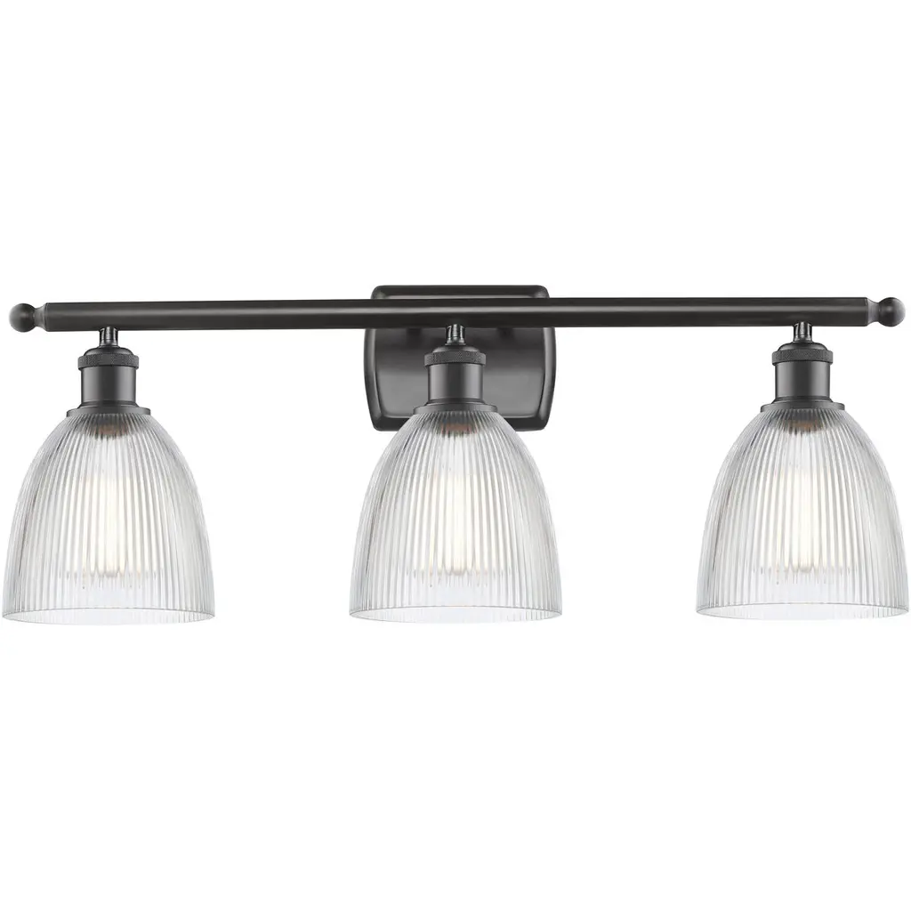 Innovations 616-2W-OB-G382 Castile 2 Light 15 inch Bath Vanity Light Oil Rubbed Bronze. Collection: Edison. Style: Industrial, Modern Contempo, Restoration-Vintage, Transitional. Metal Finish: Oil Rubbed Bronze. Metal Finish(Canopy/Backplate): Oil Rubbed Bronze. Material: Steel, Cast Brass, Glass. Dimensions(in): 11.5(H) x 15(W) x 7.5(Ext). Bulb: (2)60W Medium Base Incandescent(Not Included). Maximum Wattage Per Socket: 100. Voltage: 120. Dimmable: Yes. Color Temperature (Kelvin): 2200. Color Rendering Index (CRI): 99.9. Lumens: 220. Life Expectancy (Hours): 2000. Glass Shade Description: Clear Castile. Glass Type: Transparent. Shade Shape: Dome. Glass or Metal Shade Color: Clear. Shade Material: Glass. Shade Dimensions(in): 6(W) x 6(H). Fitter Measurement (Glass or Metal Shade Fitter Size): Neckless with a 2.125 inch Hole. Backplate Dimenisons(in): 4.5(W) x 0.75(Depth). Mounting Center to Top: 2.5. ADA Compliant: No. Reversible (Can be hung with bulbs facing uo or down): Yes. California Proposition 65 Warning Required: Yes. UL and ETL Certification: Damp Location.