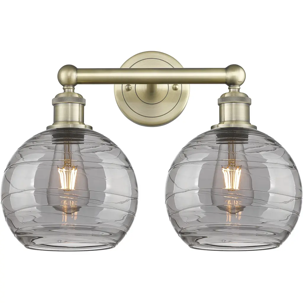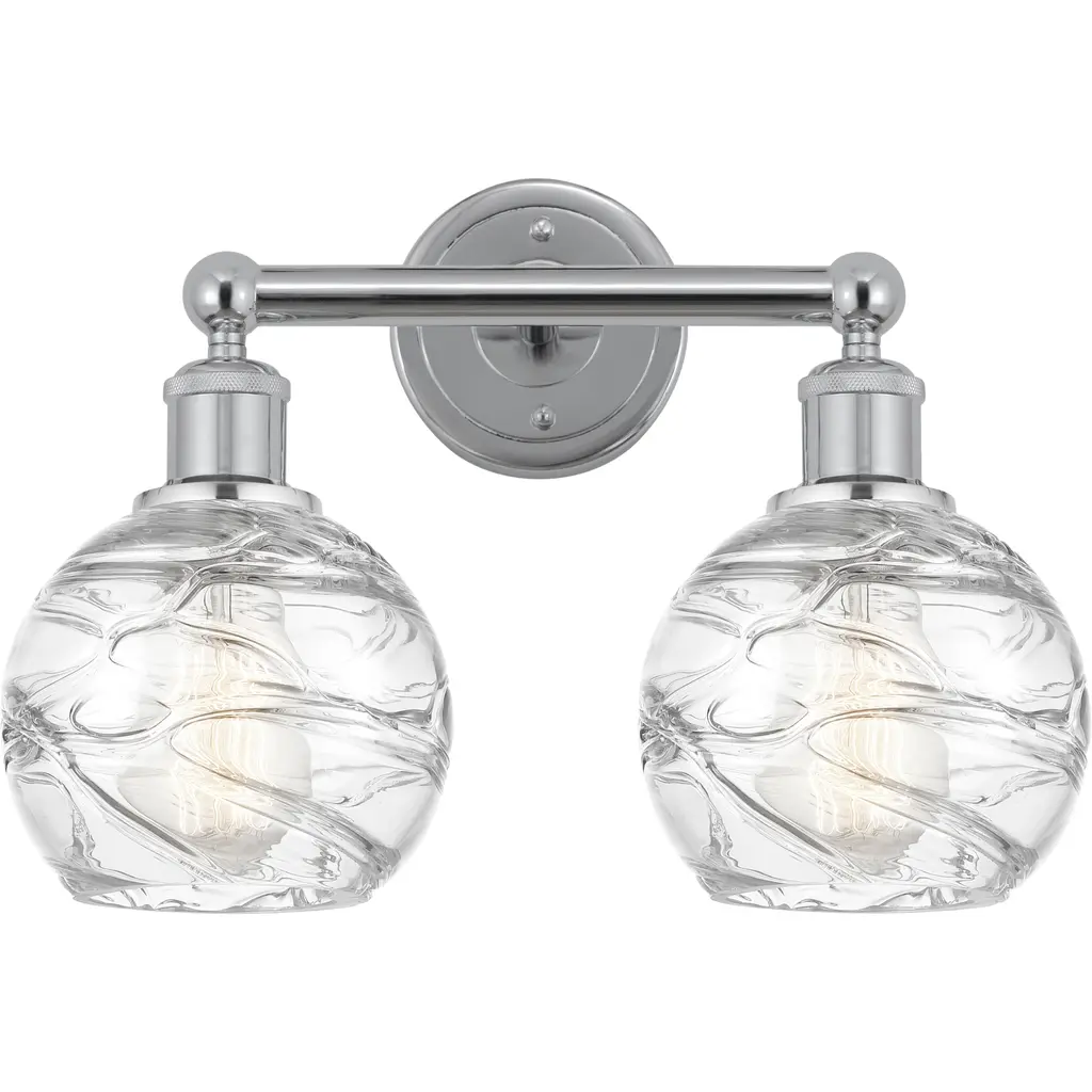 Innovations 616-2W-SN-G1213-6 Athens Deco Swirl 2 Light 15 inch Bath Vanity Light Brushed Satin Nickel. Collection: Edison. Style: Industrial, Modern Contempo, Restoration-Vintage, Transitional. Metal Finish: Brushed Satin Nickel. Metal Finish(Canopy/Backplate): Brushed Satin Nickel. Material: Steel, Cast Brass, Glass. Dimensions(in): 10.5(H) x 15(W) x 7.5(Ext). Bulb: (2)60W Medium Base Incandescent(Not Included). Maximum Wattage Per Socket: 100. Voltage: 120. Dimmable: Yes. Color Temperature (Kelvin): 2200. Color Rendering Index (CRI): 99.9. Lumens: 220. Life Expectancy (Hours): 2000. Glass Shade Description: Clear Athens Deco Swirl 8". Glass Type: Transparent. Shade Shape: Globe/Orb. Glass or Metal Shade Color: Clear Deco Swirl. Shade Material: Glass. Shade Dimensions(in): 6(W) x 5(H). Fitter Measurement (Glass or Metal Shade Fitter Size): Neckless with a 2.125 inch Hole. Backplate Dimenisons(in): 4.5(W) x 0.75(Depth). Mounting Center to Top: 2.5. ADA Compliant: No. Reversible (Can be hung with bulbs facing uo or down): Yes. California Proposition 65 Warning Required: Yes. UL and ETL Certification: Damp Location.