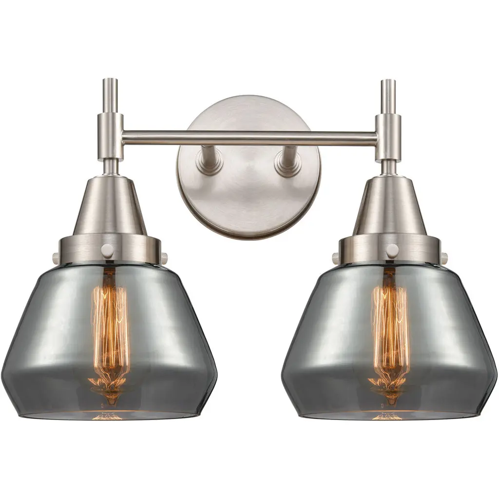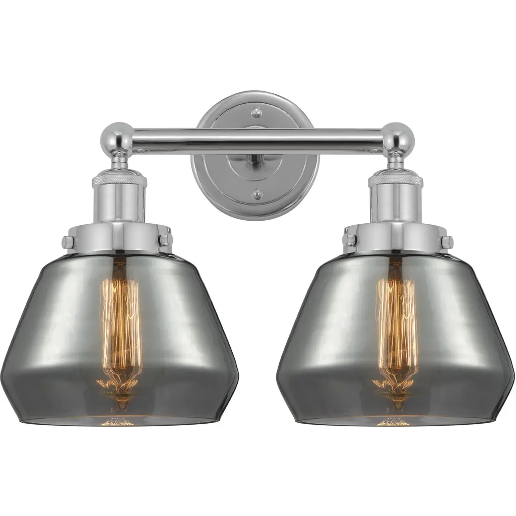 Innovations 616-2W-SN-G93 Fenton 2 Light 15.5 inch Bath Vanity Light Brushed Satin Nickel. Collection: Edison. Style: Art Nouveau, Industrial, Restoration-Vintage, Transitional. Metal Finish: Brushed Satin Nickel. Metal Finish(Canopy/Backplate): Brushed Satin Nickel. Material: Steel, Cast Brass, Glass. Dimensions(in): 10(H) x 15.5(W) x 7.75(Ext). Bulb: (2)60W Medium Base Incandescent(Not Included). Maximum Wattage Per Socket: 100. Voltage: 120. Dimmable: Yes. Color Temperature (Kelvin): 2200. Color Rendering Index (CRI): 99.9. Lumens: 220. Life Expectancy (Hours): 2000. Glass Shade Description: Plated Smoke Fenton. Glass Type: Colorful; Ribbed. Shade Shape: Bowl. Glass or Metal Shade Color: Plated Smoke. Shade Material: Glass. Shade Dimensions(in): 6.5(W) x 4.5(H). Fitter Measurement (Glass or Metal Shade Fitter Size): Neckless with a 2.125 inch Hole. Backplate Dimenisons(in): 4.5(W) x 0.75(Depth). Mounting Center to Top: 2.5. ADA Compliant: No. Reversible (Can be hung with bulbs facing uo or down): Yes. California Proposition 65 Warning Required: Yes. UL and ETL Certification: Damp Location.