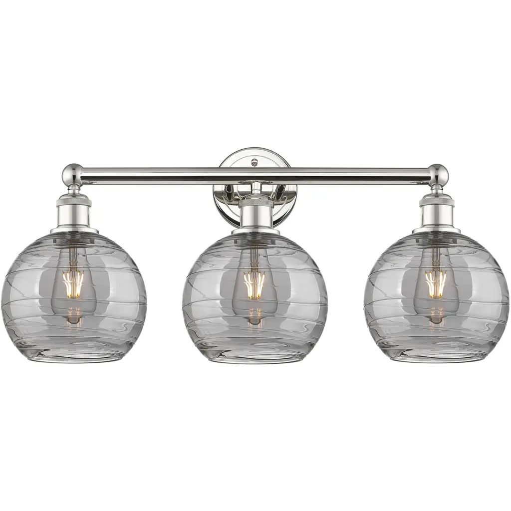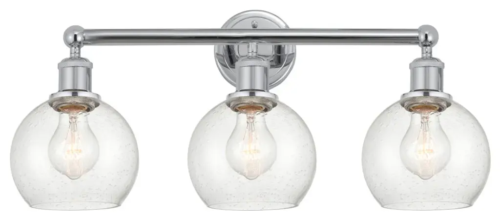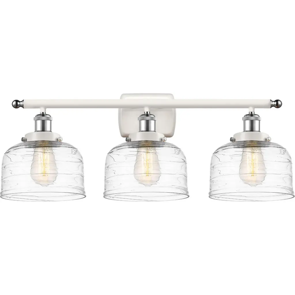 Innovations 616-3W-PC-G1013 Belfast 3 Light 24 inch Bath Vanity Light Polished Chrome. Collection: Edison. Style: Art Nouveau, Industrial, Restoration-Vintage, Transitional. Metal Finish: Polished Chrome. Metal Finish(Canopy/Backplate): Polished Chrome. Material: Steel, Cast Brass, Glass. Dimensions(in): 11.5(H) x 24(W) x 7.5(Ext). Bulb: (3)60W Medium Base Incandescent(Not Included). Maximum Wattage Per Socket: 100. Voltage: 120. Dimmable: Yes. Color Temperature (Kelvin): 2200. Color Rendering Index (CRI): 99.9. Lumens: 220. Life Expectancy (Hours): 2000. Glass Shade Description: Deco Swirl Belfast. Glass Type: Transparent. Shade Shape: Globe/Orb. Glass or Metal Shade Color: Deco Swirl. Shade Material: Glass. Shade Dimensions(in): 6(W) x 6(H). Fitter Measurement (Glass or Metal Shade Fitter Size): Neckless with a 2.125 inch Hole. Backplate Dimenisons(in): 4.5(W) x 0.75(Depth). Mounting Center to Top: 2.5. ADA Compliant: No. Reversible (Can be hung with bulbs facing uo or down): Yes. California Proposition 65 Warning Required: Yes. UL and ETL Certification: Damp Location.