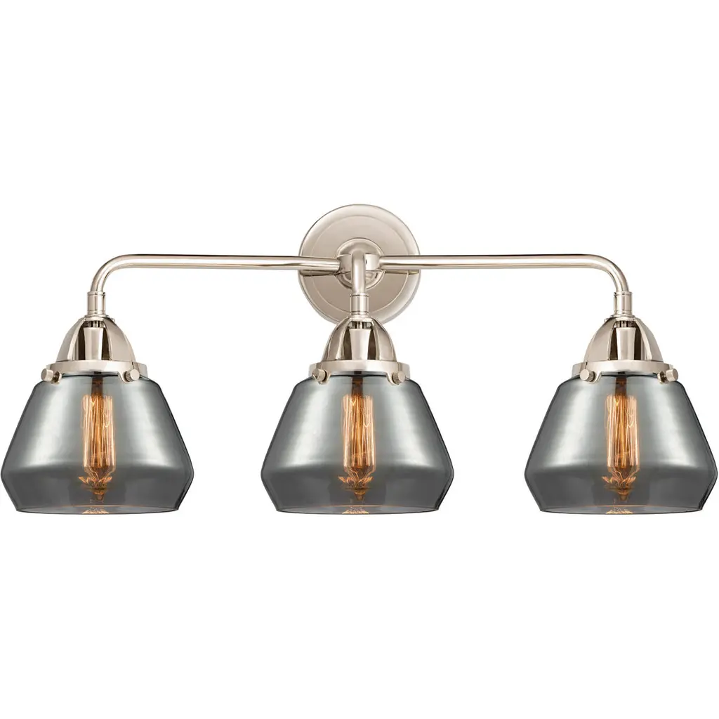 Innovations 623-3W-SN-G173 3-Light Bath Vanity Light Brushed Satin Nickel. Collection: Aditi. Style: Industrial, Farmhouse, Modern Contempo, Restoration-Vintage. Metal Finish: Brushed Satin Nickel. Metal Finish (Canopy/Backplate): Brushed Satin Nickel. Material: Steel, Cast Brass, Glass. Dimension(in): 11(H) x 22. 75(W) x 8. 375(Ext). Bulb: (3)60W Medium Base,Dimmable(Not Included). Maximum Wattage Per Socket: 100. Voltage: 120. Color Temperature (Kelvin): 2200. CRI: 99. 9. Lumens: 220. Glass Shade Description: Plated Smoke Fulton. Glass or Metal Shade Color: Plated Smoke. Shade Material: Glass. Glass Type: Colorful. Shade Shape: Cone. Shade Dimension(in): 6. 75(W) x 5. 25(H). Fitter Measurement (Glass Or Metal Shade Fitter Size): 3. 25 inch Fitter. Canopy Dimension(in): 4. 5(Dia). Backplate Dimension(in): 4. 5(Dia) x 0. 75(Depth). ADA Compliant: No. California Proposition 65 Warning Required: Yes. UL and ETL Certification: Damp Location.
