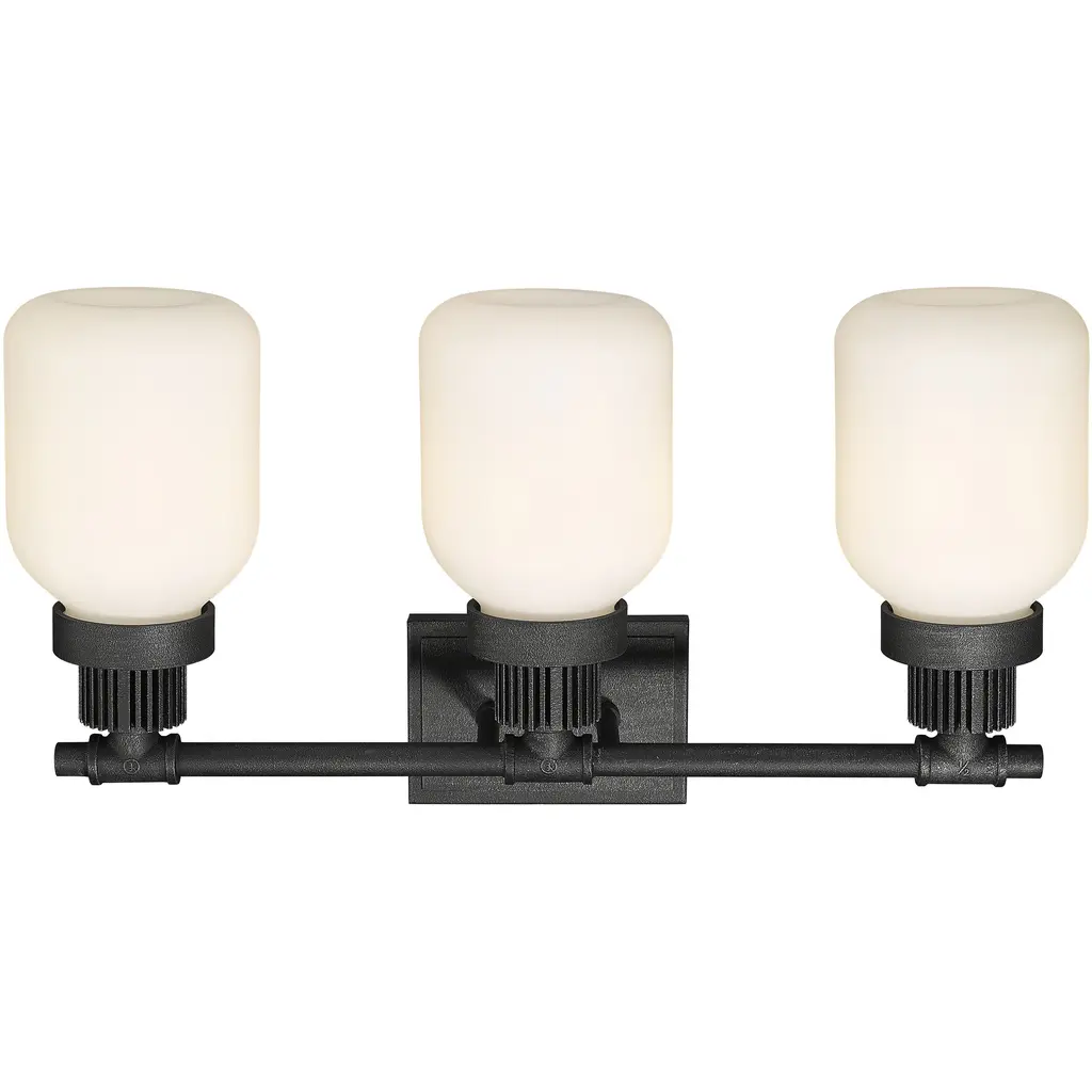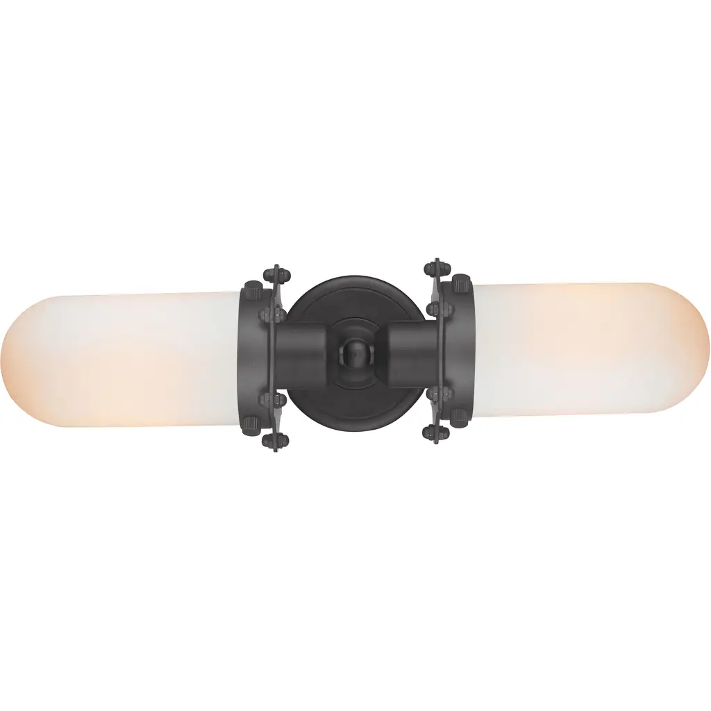 Innovations 900-2W-BK-CE231-BK-W-LED Centri 2 Light Bath Vanity Light part of the Austere Collection Matte Black. Collection: Austere. Style: Industrial, Modern Contempo, Restoration-Vintage. Metal Finish: Matte Black. Metal Finish(Shade): Matte Black. Metal Finish(Canopy/Backplate): Matte Black. Material: Steel, Cast Brass, Glass. Dimensions(in): 4.5(H) x 22(W) x 6(Ext). Bulb: (2)6W LED(Included). Maximum Wattage Per Socket: 100. Voltage: 120. Dimmable: Yes. Color Temperature (Kelvin): 2700. Color Rendering Index (CRI): 82. Lumens: 600. Life Expectancy (Hours): 15000. Glass Shade Description: Matte White Cased Centri. Glass Type: Frosted. Shade Shape: Cylinder. Glass or Metal Shade Color: Matte White. Shade Material: Glass. Shade Dimensions(in): 3.375(W) x 7(H). Canopy Dimensions(in): 4.5(Dia). Backplate Dimenisons(in): 4.5(Dia) x 0.75(Depth). Mounting Center to Top: 2.25. Reversible (Can be hung with bulbs facing uo or down): Yes. California Proposition 65 Warning Required: Yes. UL and ETL Certification: Damp Location.